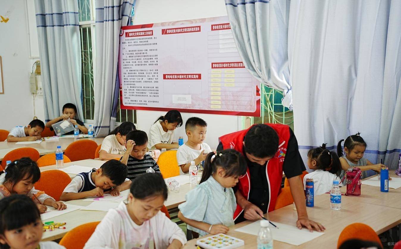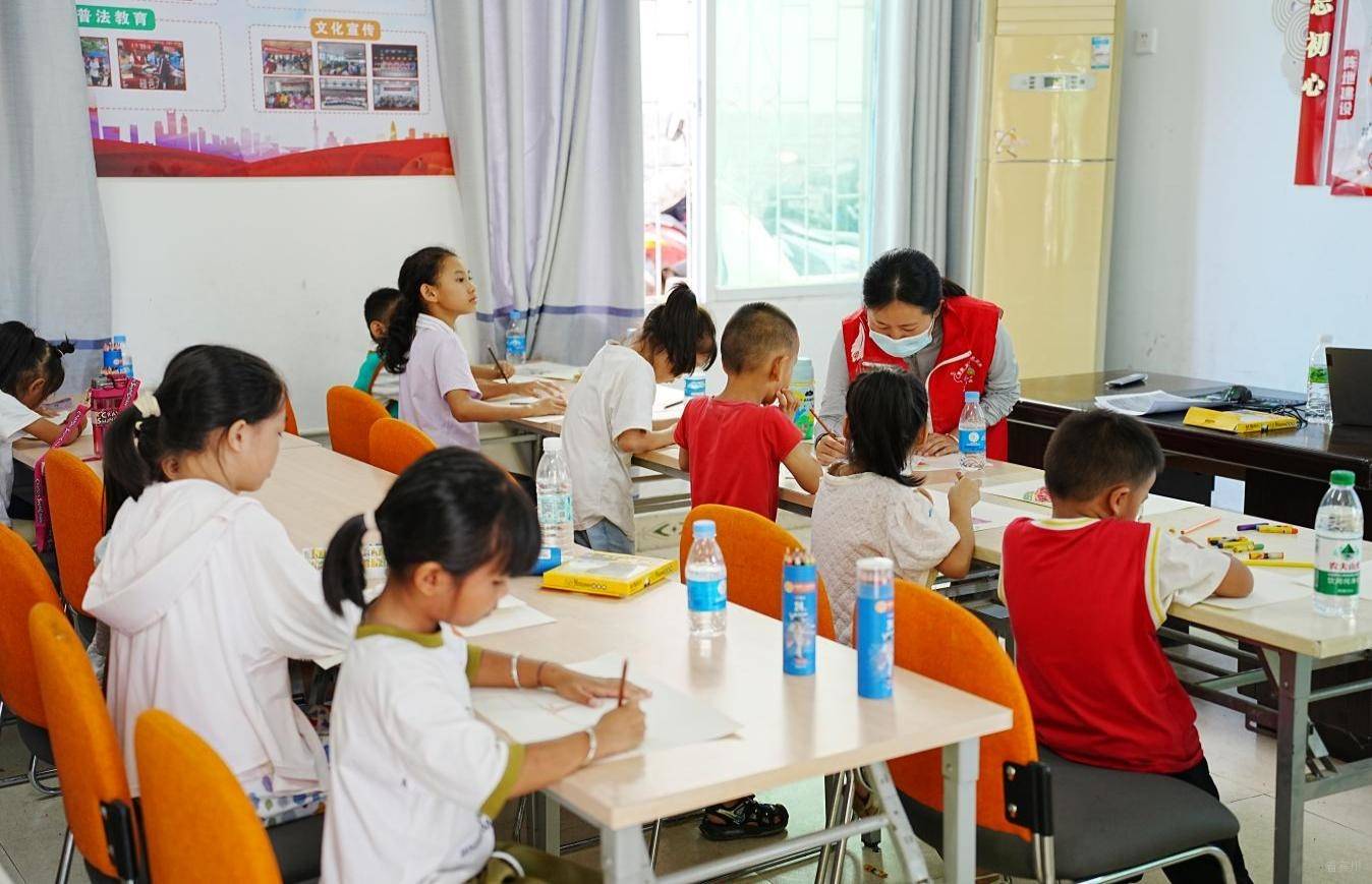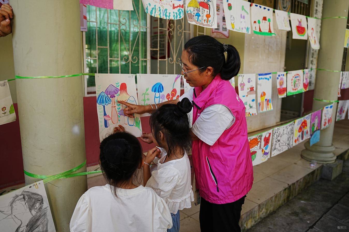 在一楼的绘画教室里,代沙和李娜两位志愿者采用播放动画视频、讲绘画的小故事的方式,激发孩子们对绘画的兴趣。从基础线条与几何图形的认知训练入手,指导孩子们掌握画笔、颜料等绘画工具的特性和使用技巧,通过色彩搭配、空间构图、笔触运用等教学,引导孩子逐步提升艺术表现力。通过学习“四季风景绘”“自画像”“童真人物剧场”三大主题创作单元,志愿者们耐心指导,鼓励孩子们大胆表达自己的想法。孩子们在动手实践中不断挖掘自身潜能,将所见所感融入画纸,创作出一幅幅充满童趣与创意的作品。特别设置的“画语分享会”,孩子们通过作品讲述创作的过程,在提升绘画技能的同时锻炼语言表达能力,培养艺术素养与自信心。