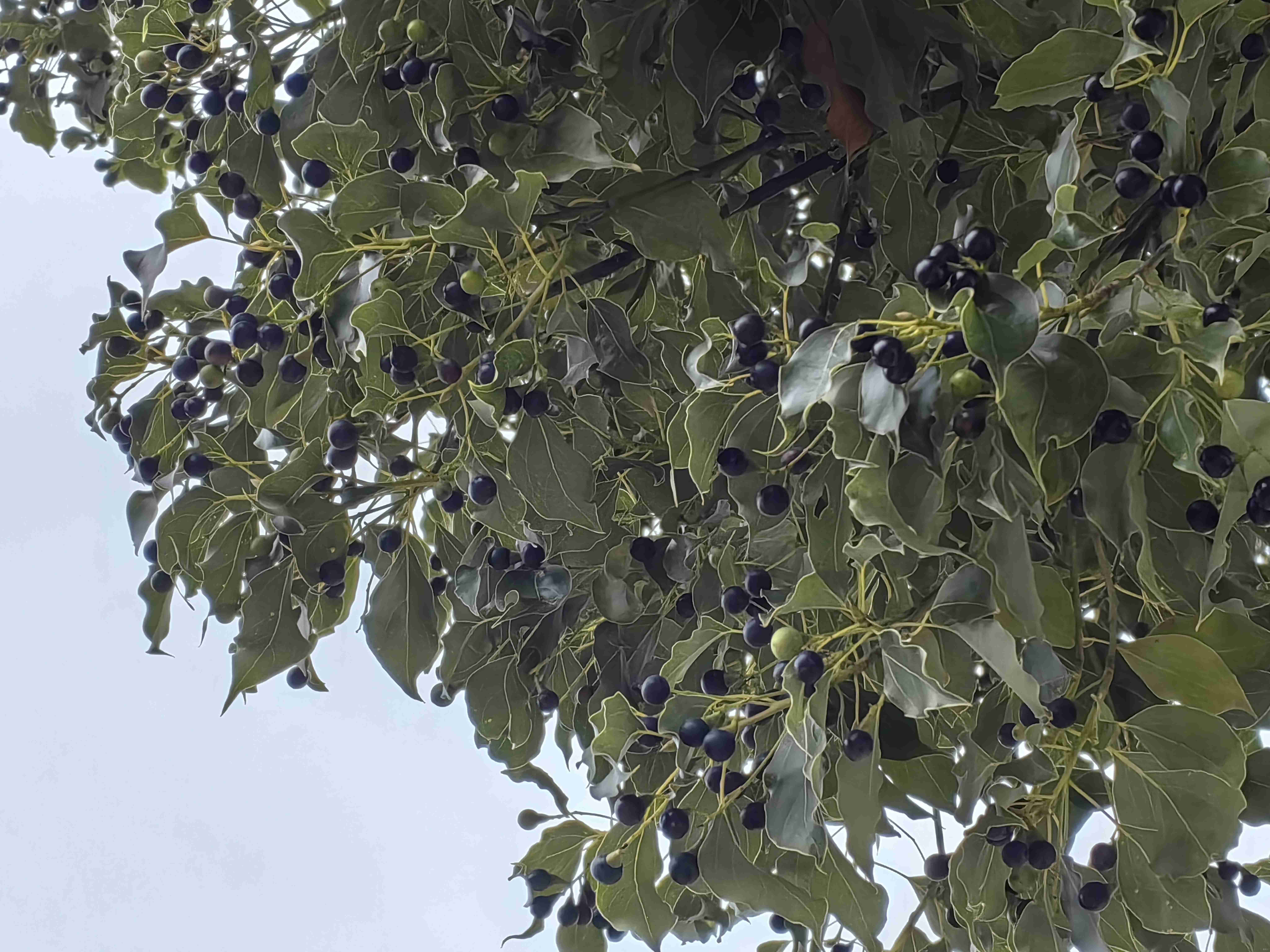 秋天的香樟树,藏着另一番惊喜。枝头开始挂上一串串绿色的小果子,那便是香樟子。起初,它们像一颗颗迷你的碧玉珠子,紧紧挨在一起,缀在绿叶间,不仔细看还以为是新长出的嫩叶。随着秋意渐浓,香樟子慢慢褪去绿装,染上深紫,最后变成油亮的黑色,风一吹便“噼里啪啦”地掉在地上。这时候,总会出现几位老人提着小竹篮,慢悠悠地在樟树下转悠,弯腰捡拾那些饱满的香樟子。他们常说:“这东西可是个宝!晒干了收着,邻里谁家有小毛病能派上用场,多的还能卖到中药铺,换点零花钱补贴家用。”阳光下,老人们的身影与黑亮的香樟子相互映衬,成了樟树下一道别样的风景。