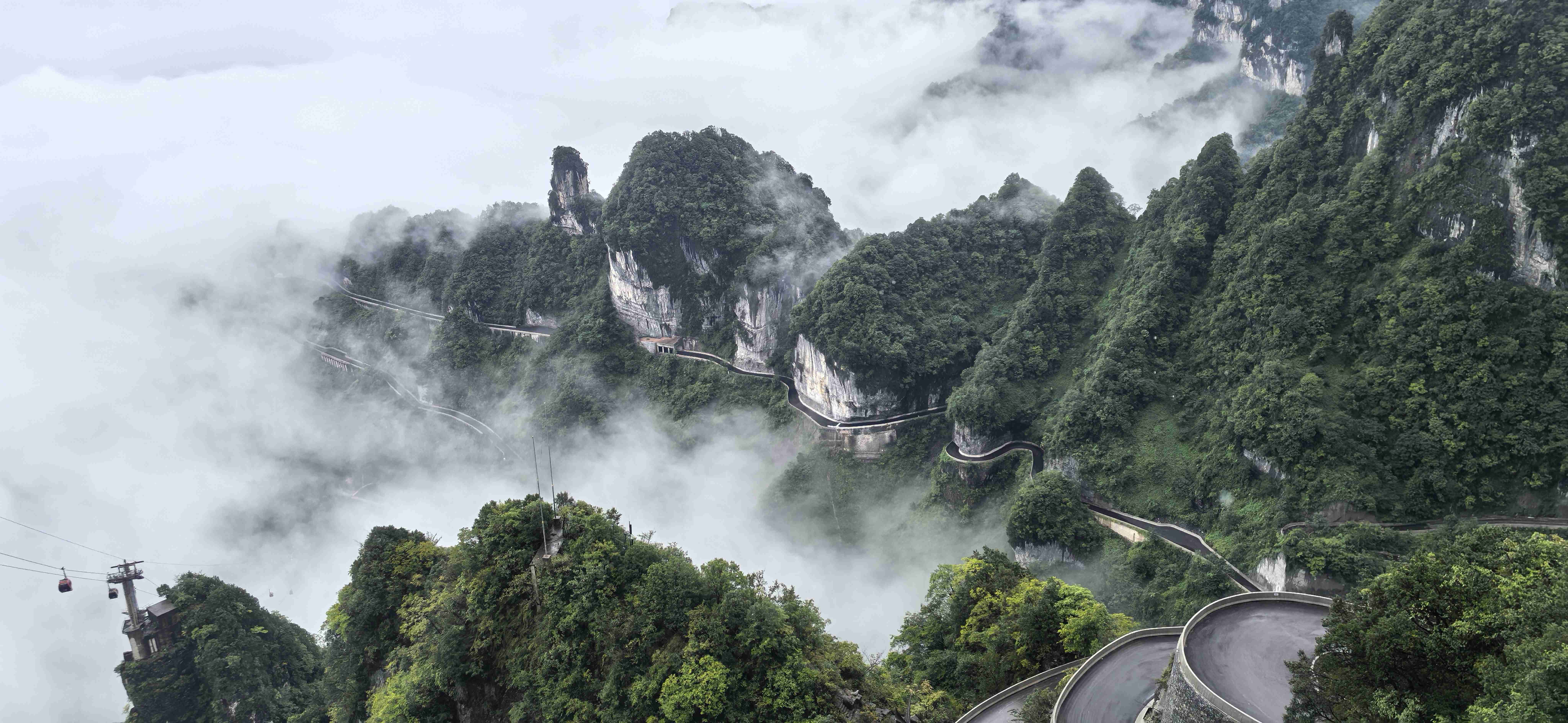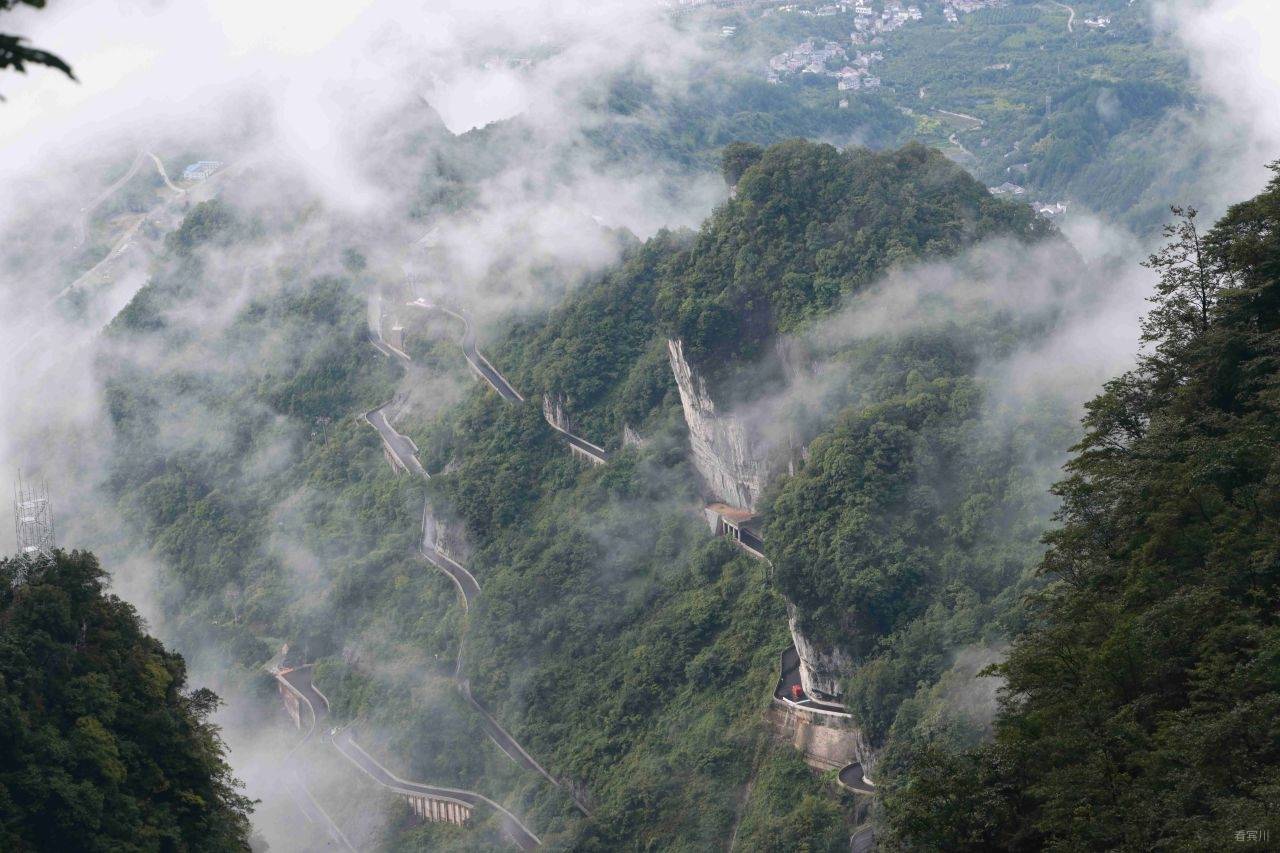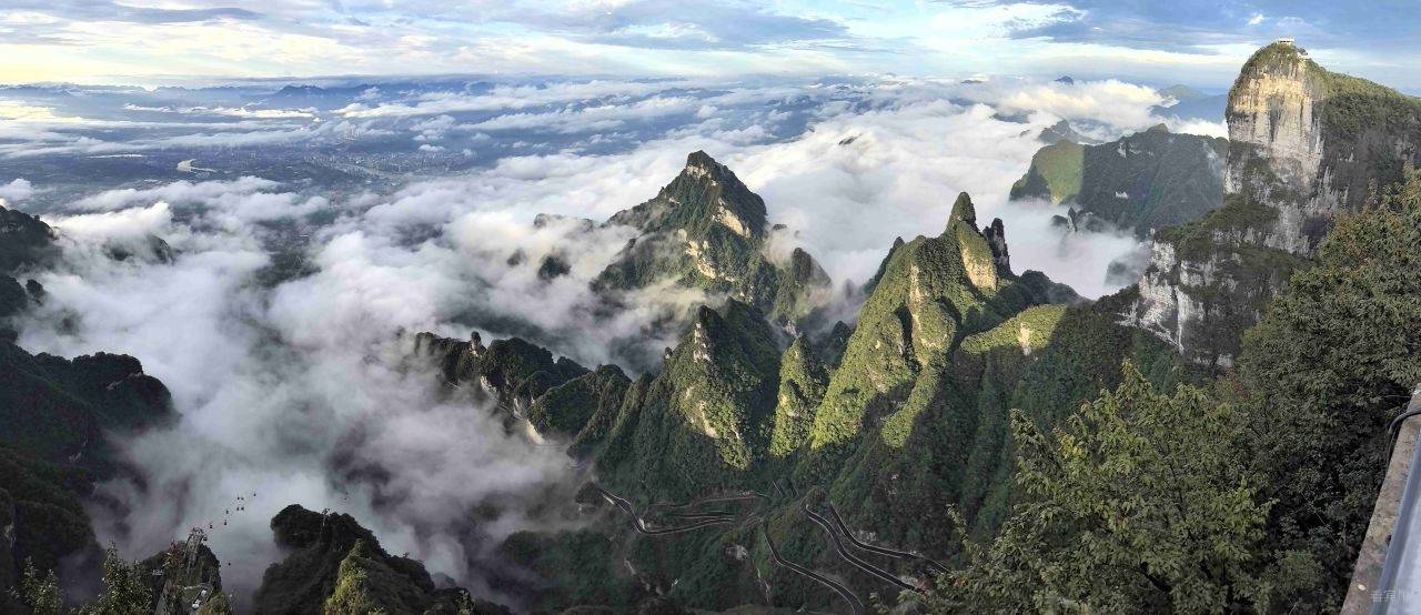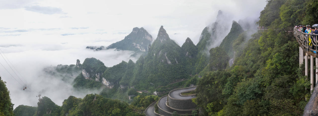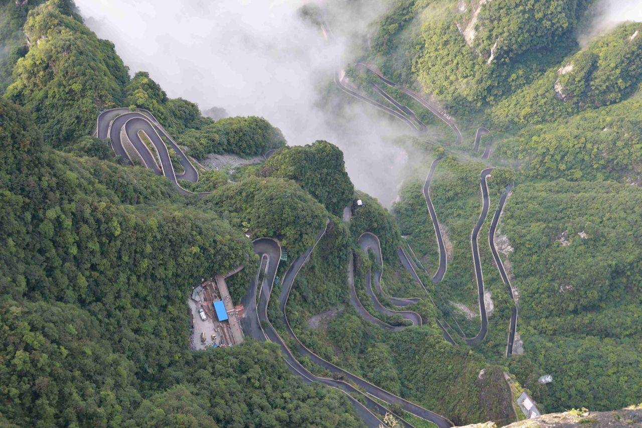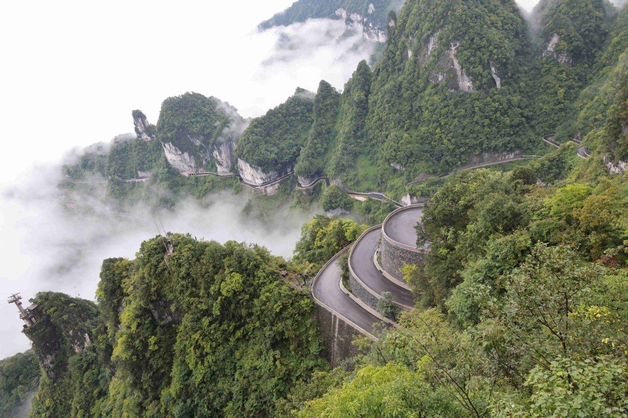 最让人惊叹的是远处兼具工程奇迹与自然景观的“天下第一公路奇观”——天门山盘山公路(通天大道)99道拐,全长10.77公里,垂直落差达1100米,蜿蜒的路面在云雾中时隐时现,像一条黑色的绸缎飘在山间,又似巨龙的脊背蜿蜒起伏。