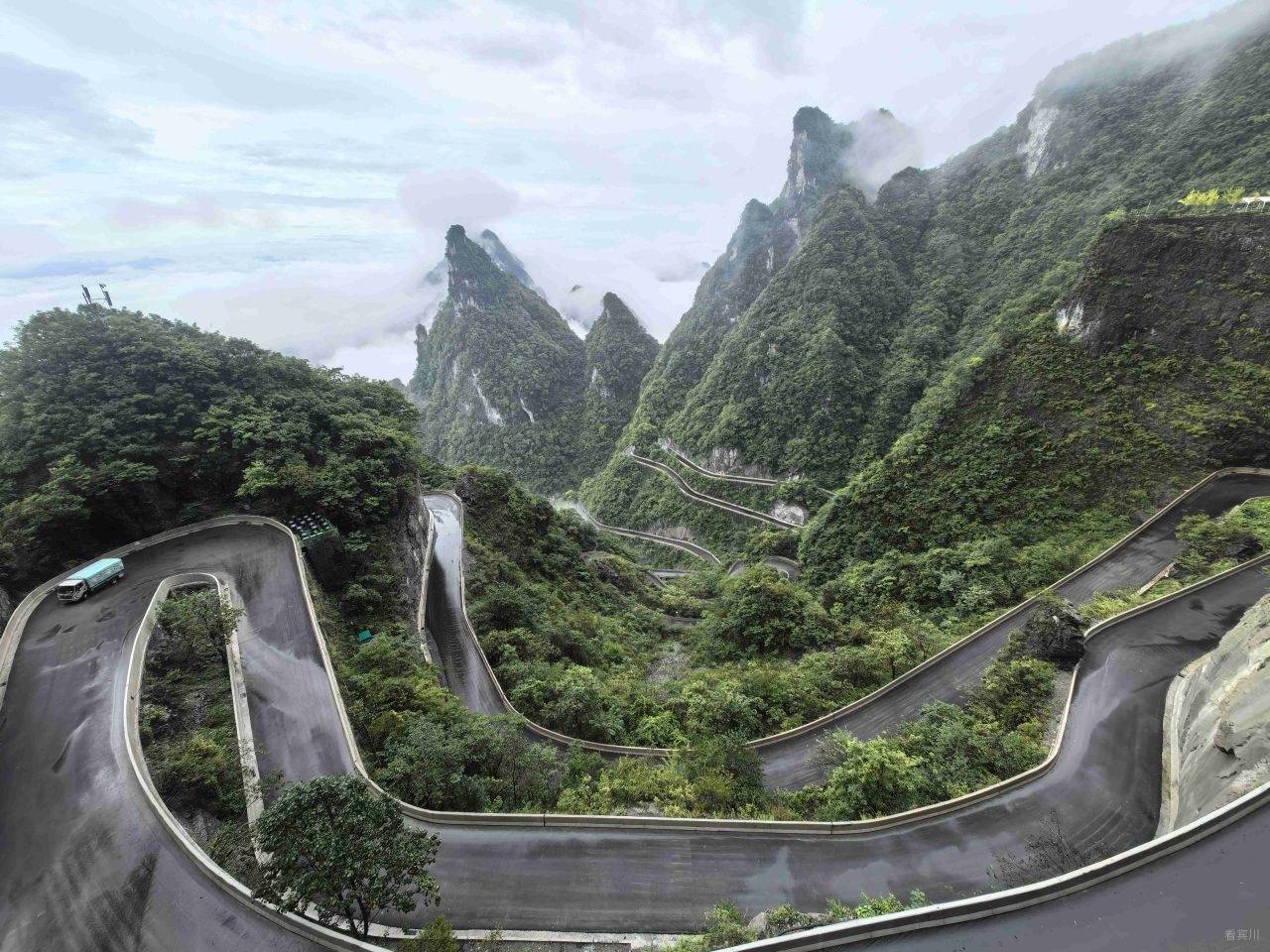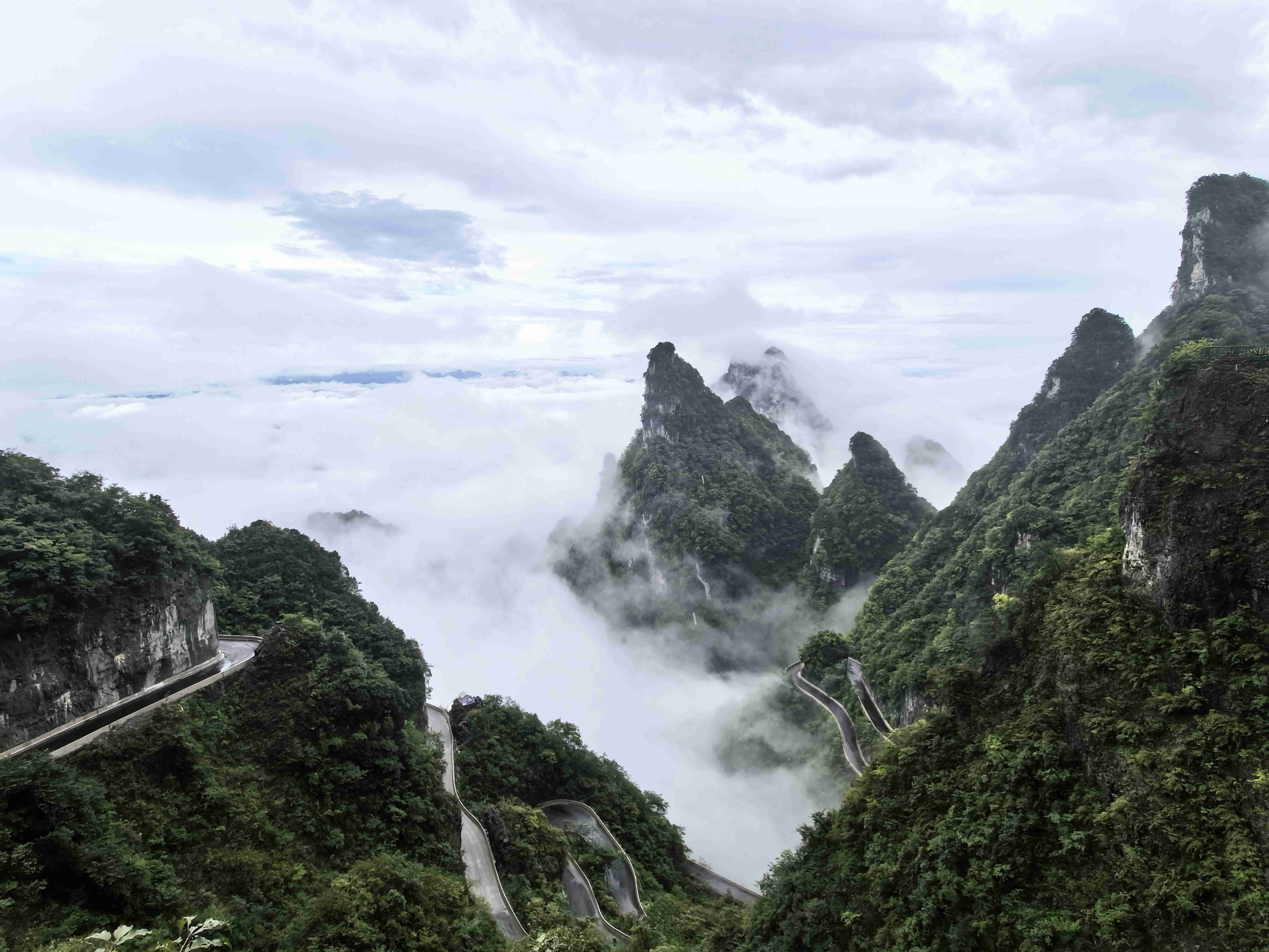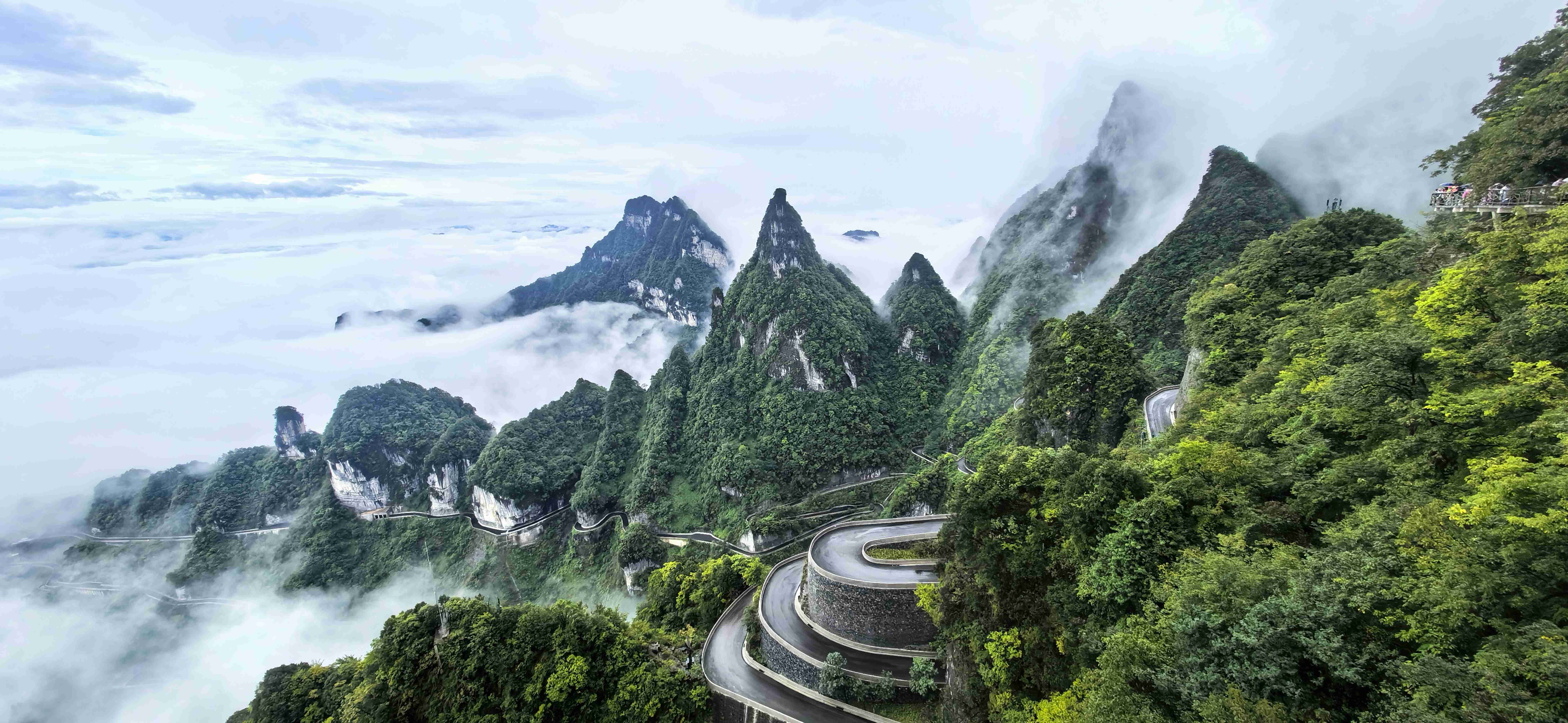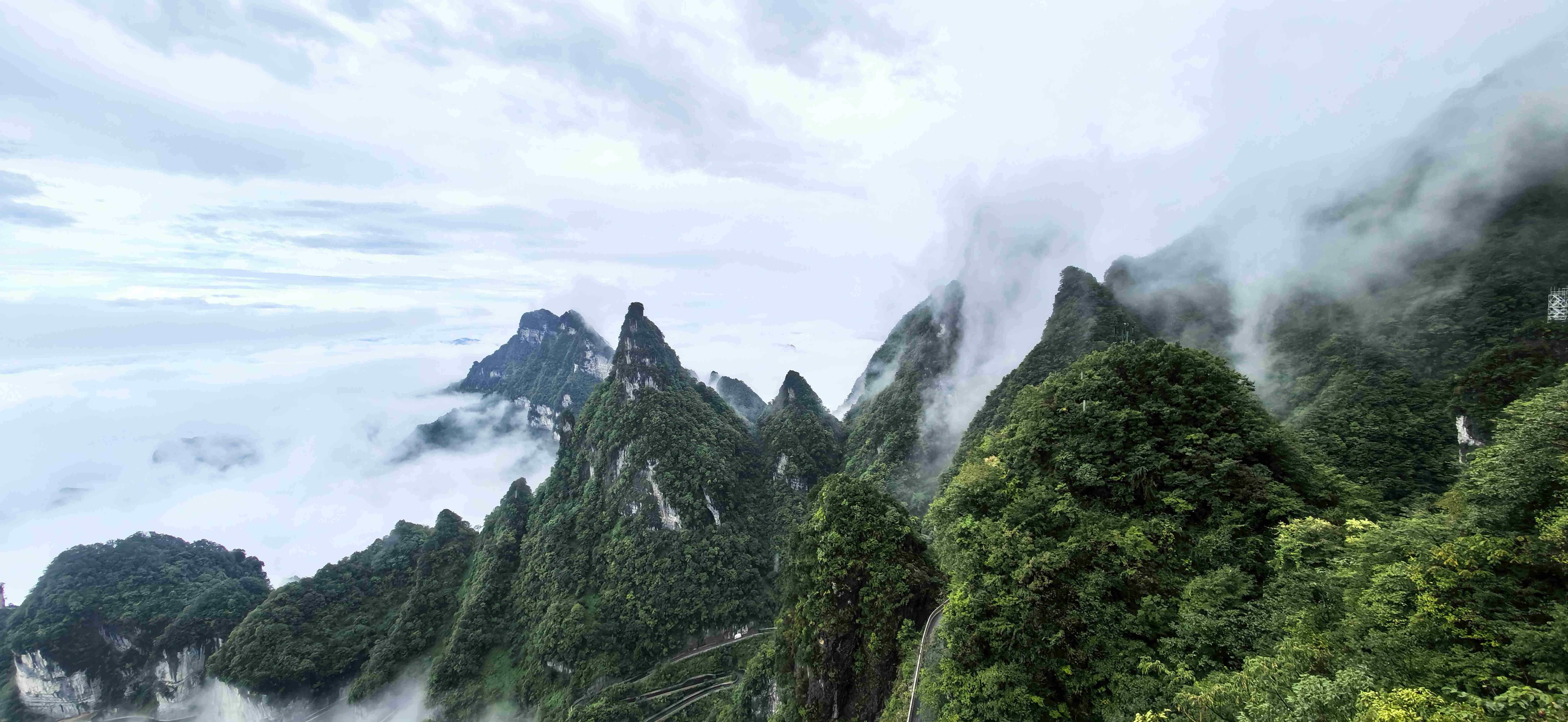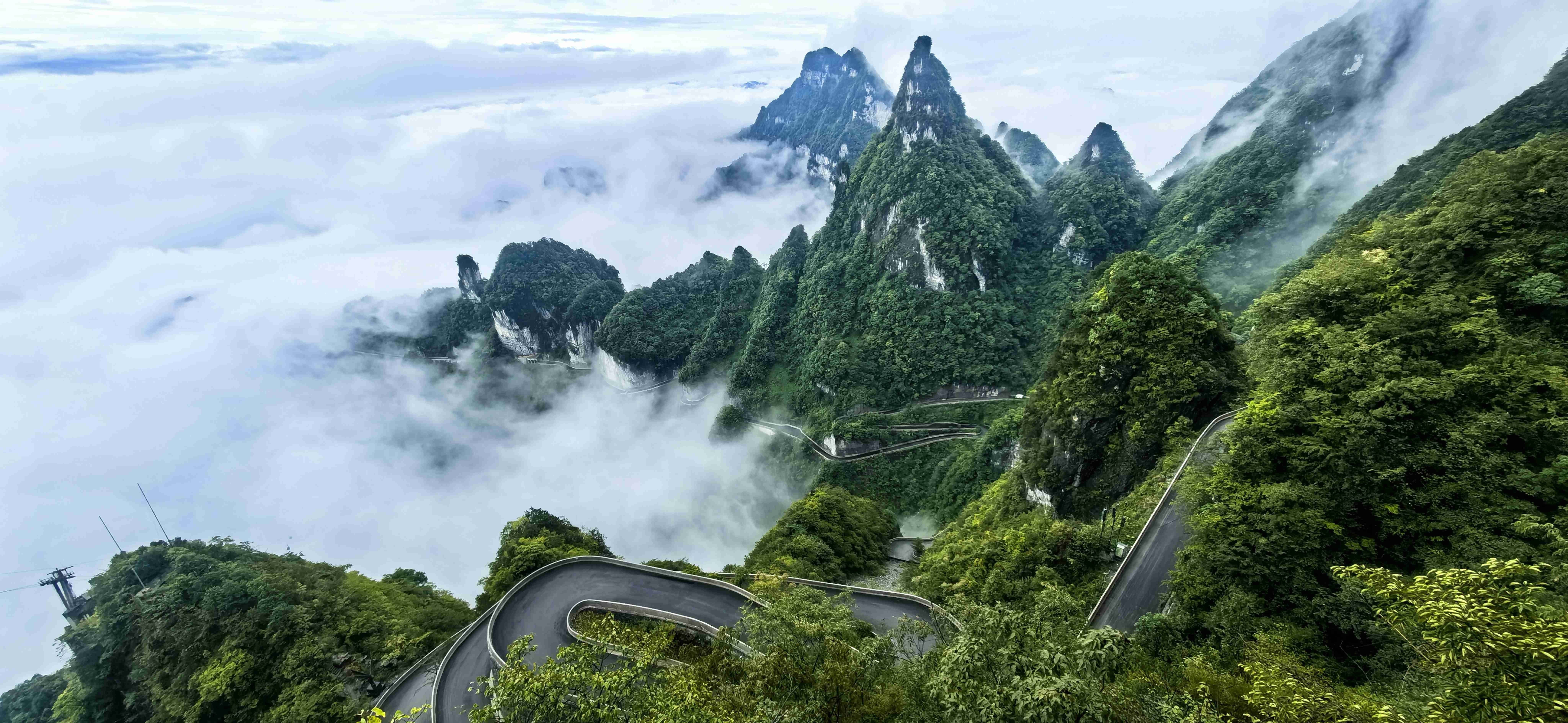 最让人惊叹的是远处兼具工程奇迹与自然景观的“天下第一公路奇观”——天门山盘山公路(通天大道)99道拐,全长10.77公里,垂直落差达1100米,蜿蜒的路面在云雾中时隐时现,像一条黑色的绸缎飘在山间,又似巨龙的脊背蜿蜒起伏。