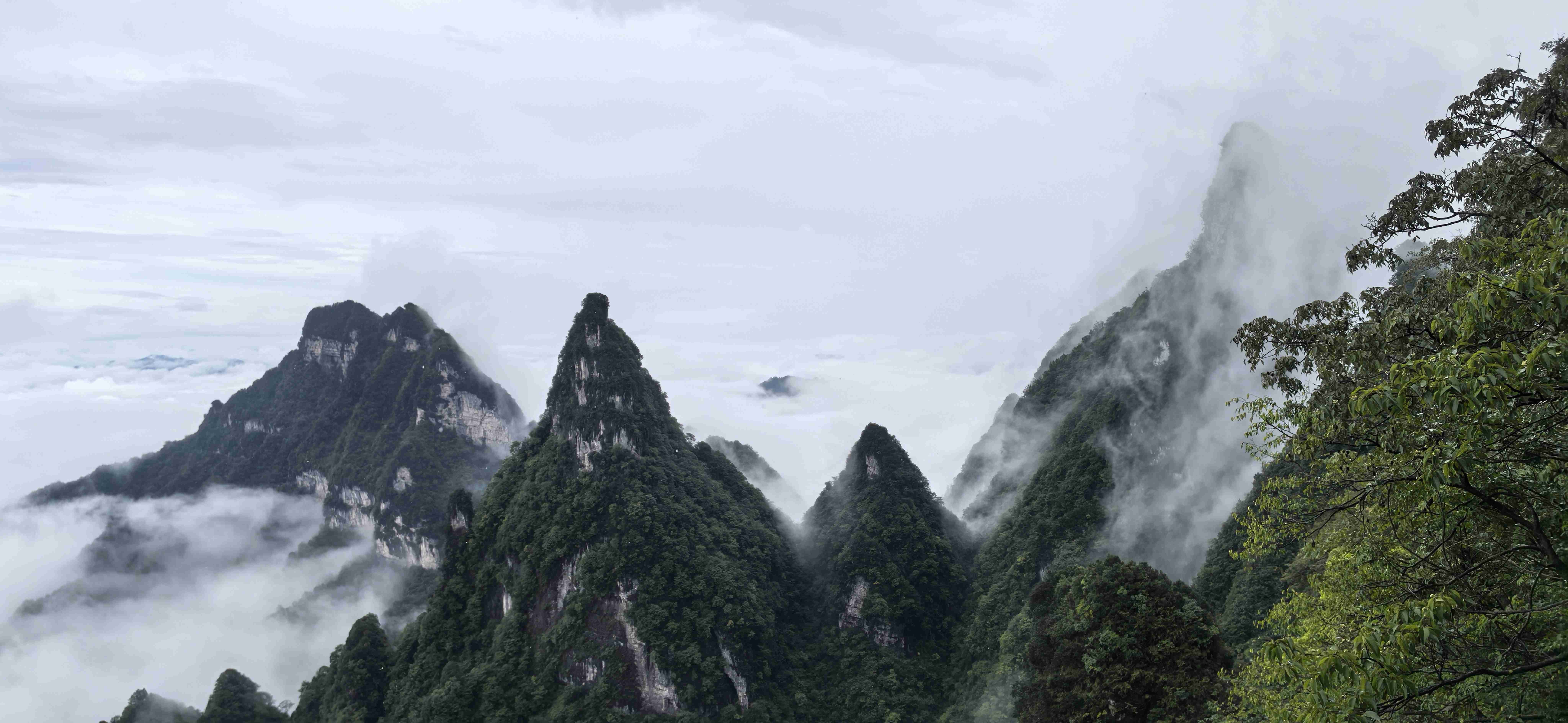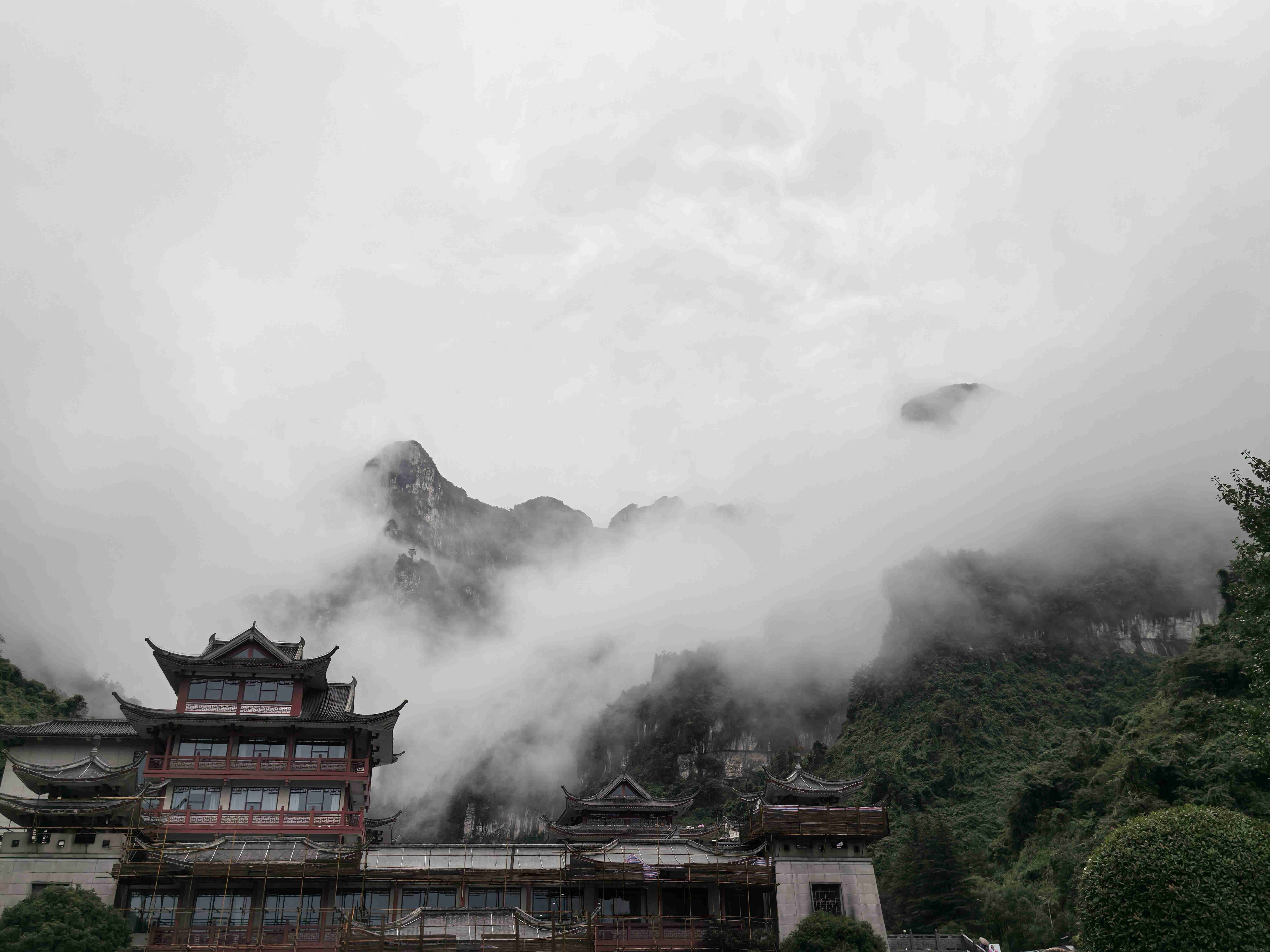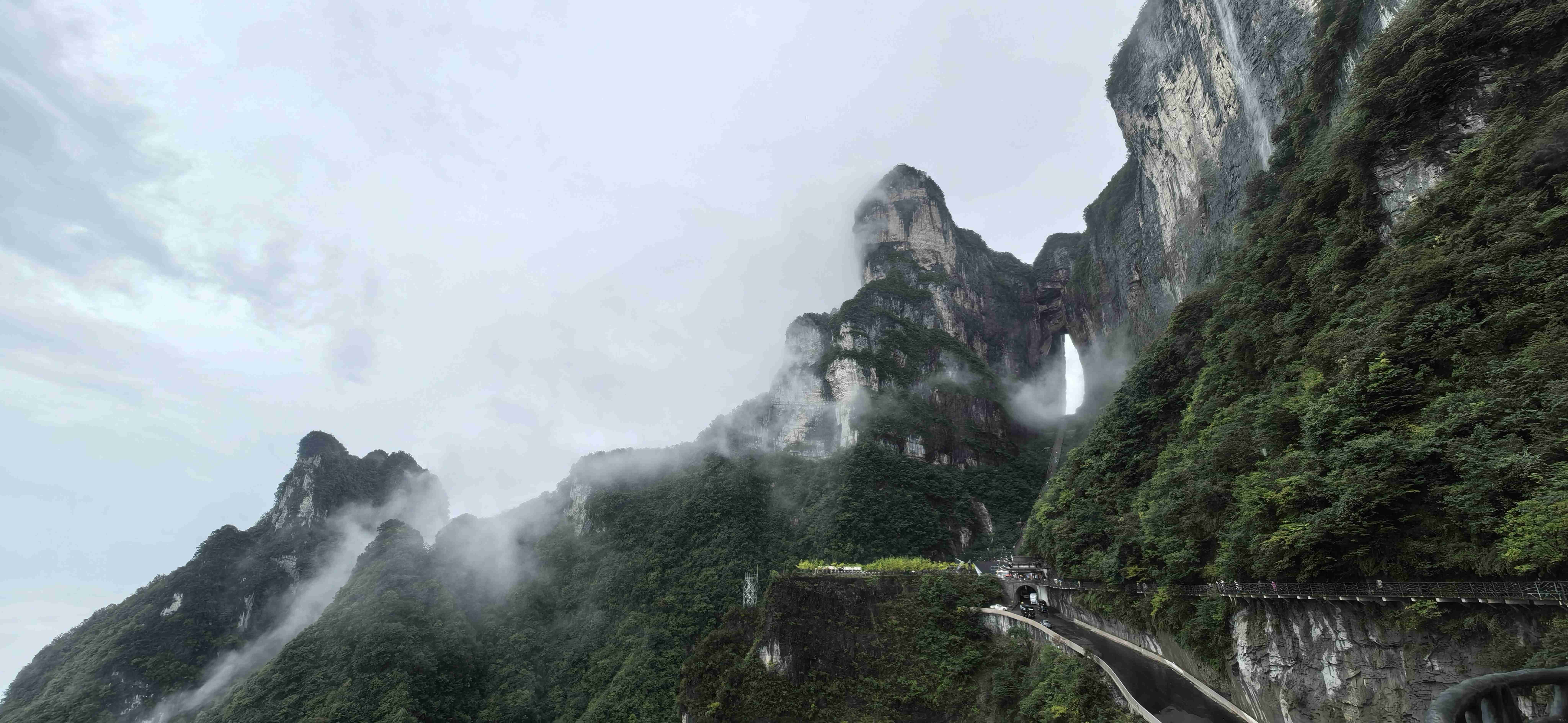 从芙蓉镇出发时,雨丝仍缠绵不绝,淅淅沥沥地打在车窗上,晕开一片朦胧的水痕。车窗外,湘西的青山被雨雾裹着,像一幅晕染未干的水墨画,我们这群怀揣期待的旅人,便在这水墨意境里,朝着张家界天门山缓缓前行。下午3点左右,车子终于驶入张家界市区,刚下车,导游便指向远方:“那就是天门山景区的方向。”可抬眼望去,雨季的浓雾像厚重的纱幔,将远方的山峦遮得严严实实,连一丝轮廓都寻不见,心底不禁掠过一丝失望——难不成此行要与天门山的美景擦肩而过?