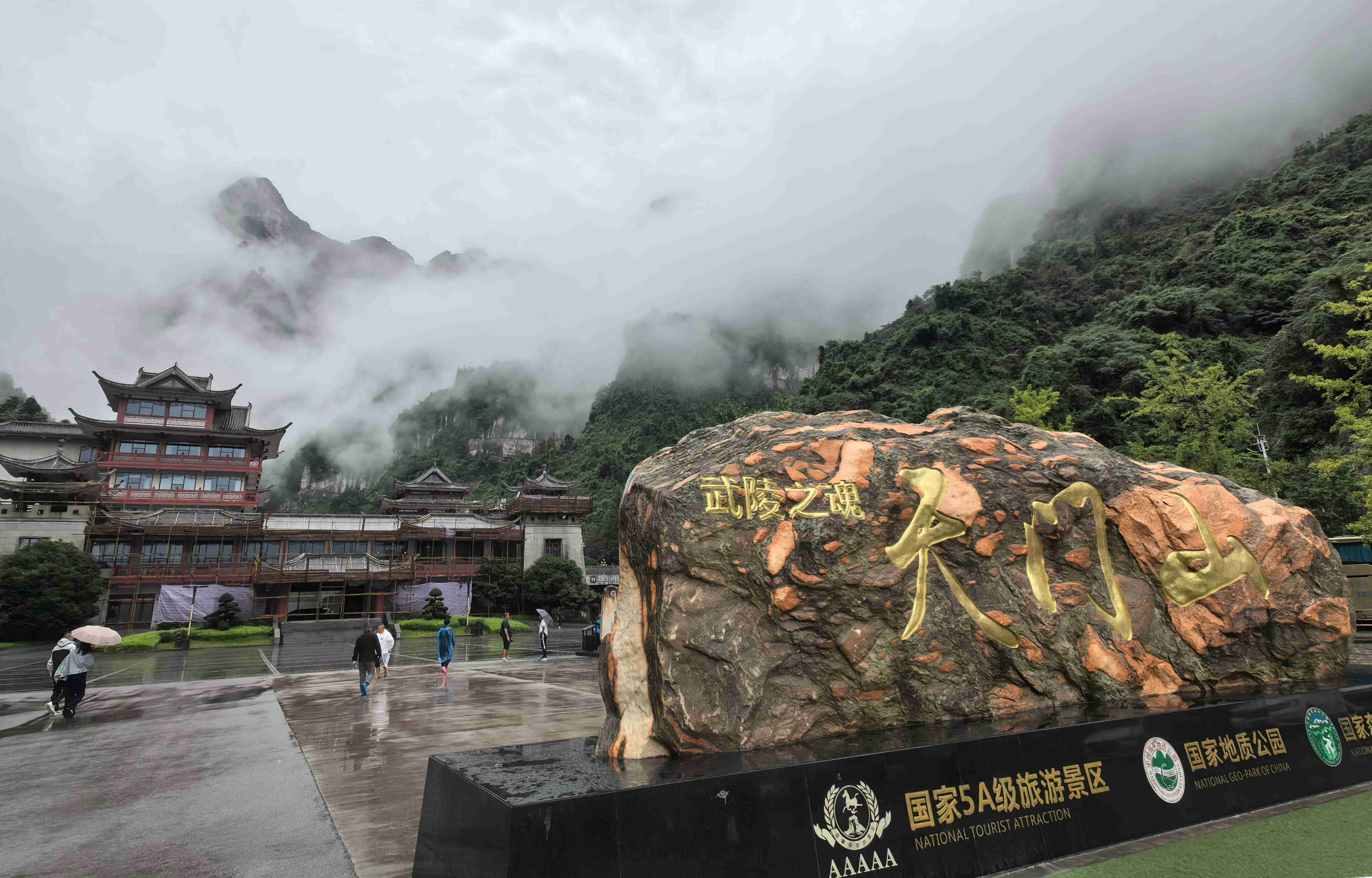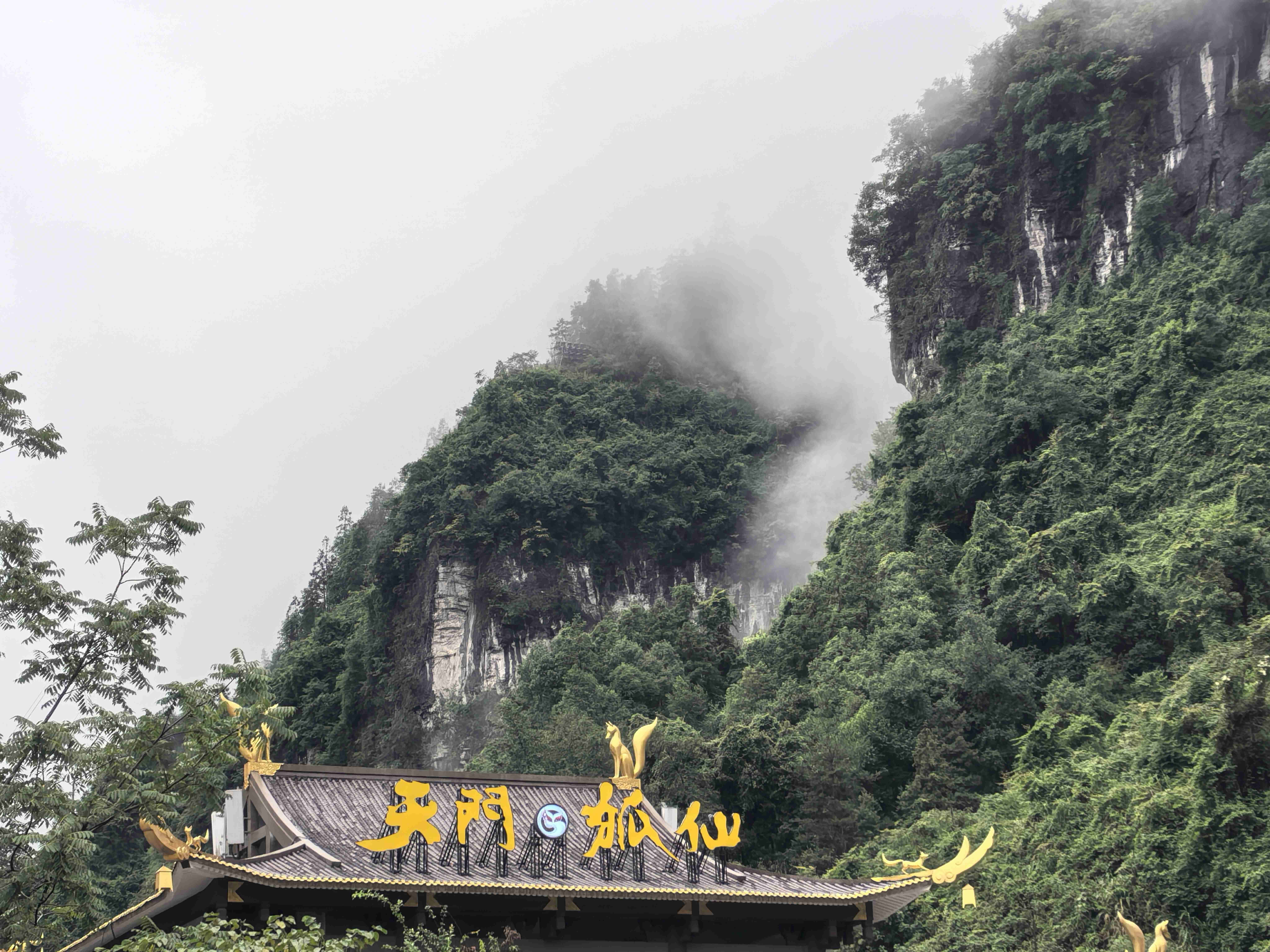 怀着这份忐忑,我们坐上景区观光车,沿着盘山公路向天门山进发。车轮碾过湿润的路面,两旁的绿植愈发苍翠,雨雾中的竹林不时掠过车窗,带着清新的草木香。行至山门,刚推开车门,眼前的景象便瞬间驱散了所有失落:“武陵之魂——天门山”的巨石招牌矗立在入口处,金色的字体透着苍劲。招牌后方,青山在薄雾中若隐若现,峰顶藏在云海深处,只露出些许黛色的轮廓,宛若仙境中的蓬莱仙岛。不远处,上山的缆车吊箱正缓缓升空,一帧帧穿进翻腾的云海,仿佛载着游人驶向天宫。同行的伙伴们纷纷举起相机,快门声此起彼伏,刚才的失望早已被这突如其来的美景冲得烟消云散。