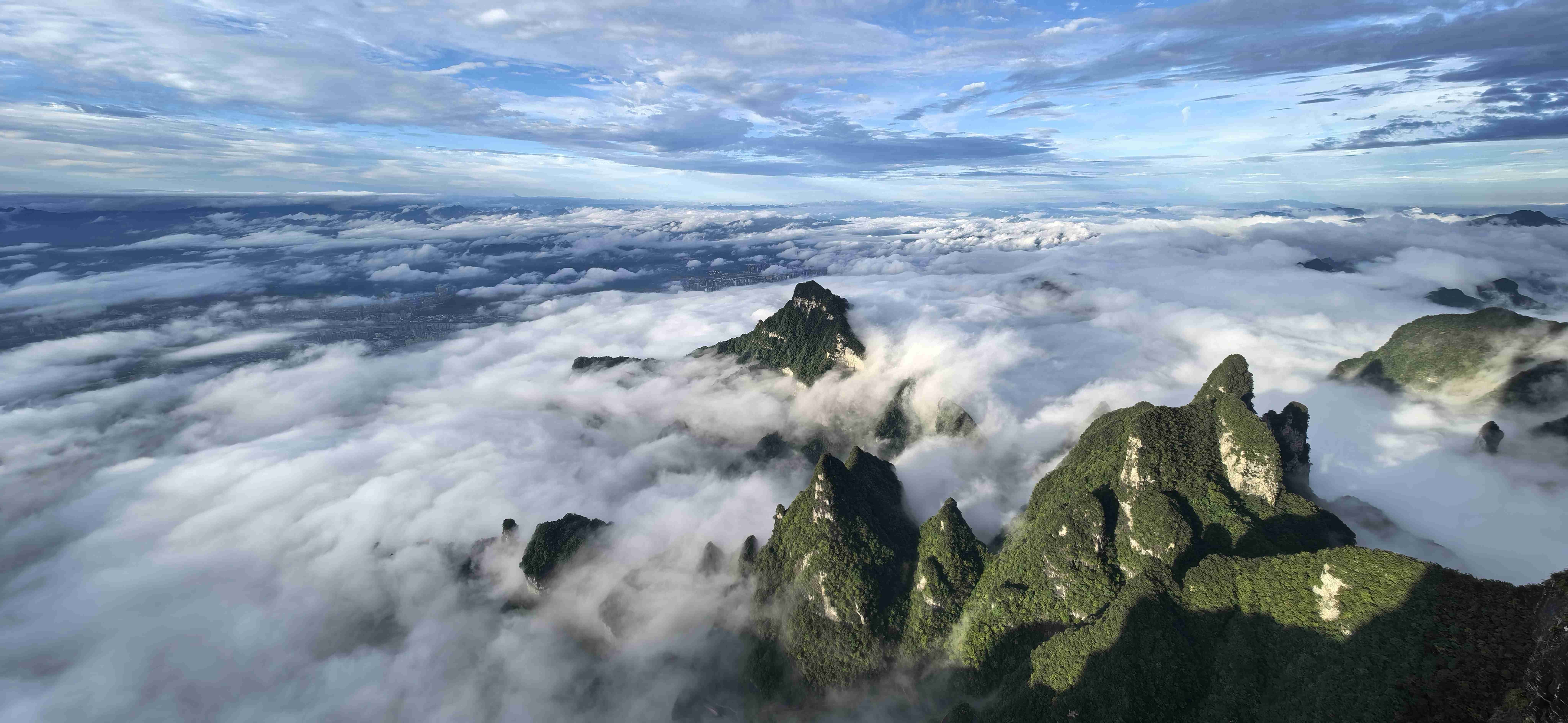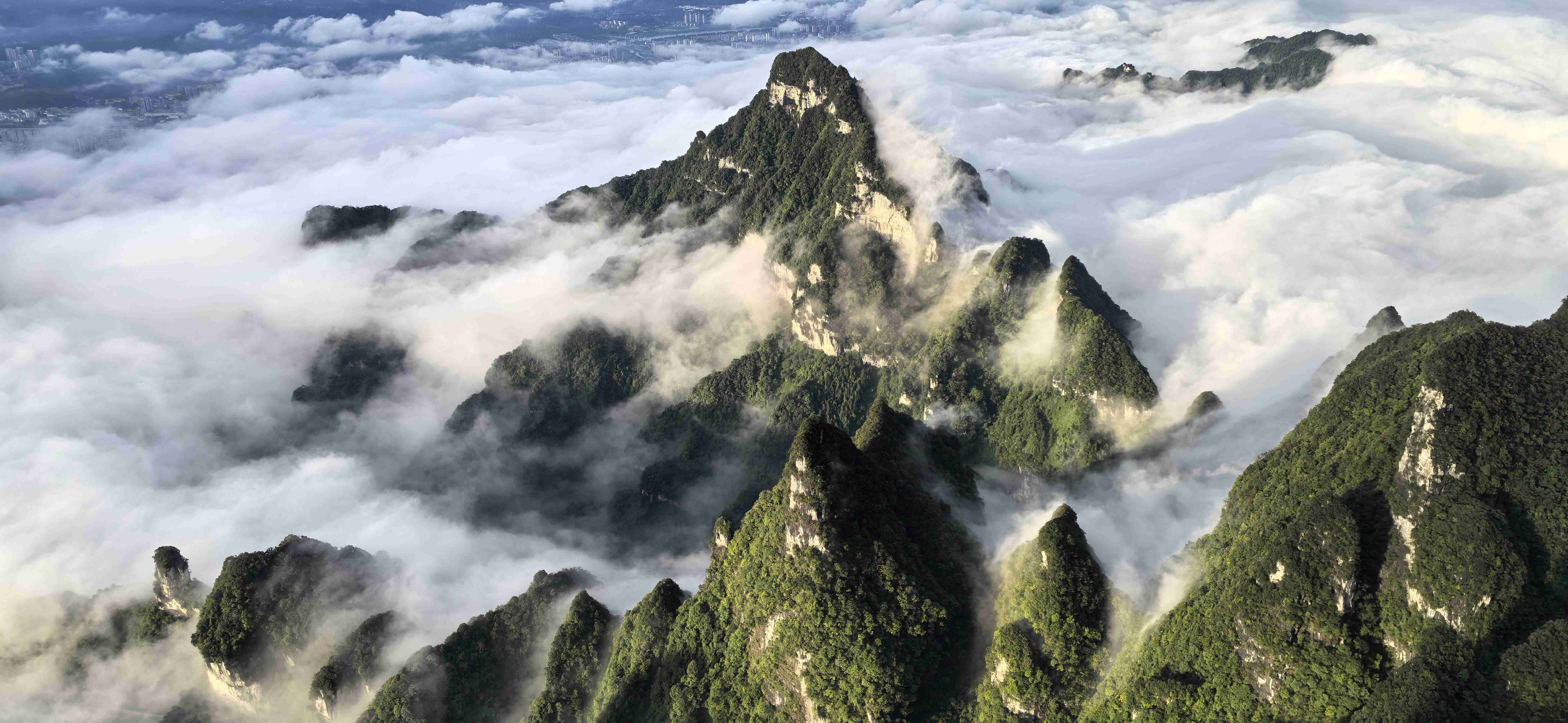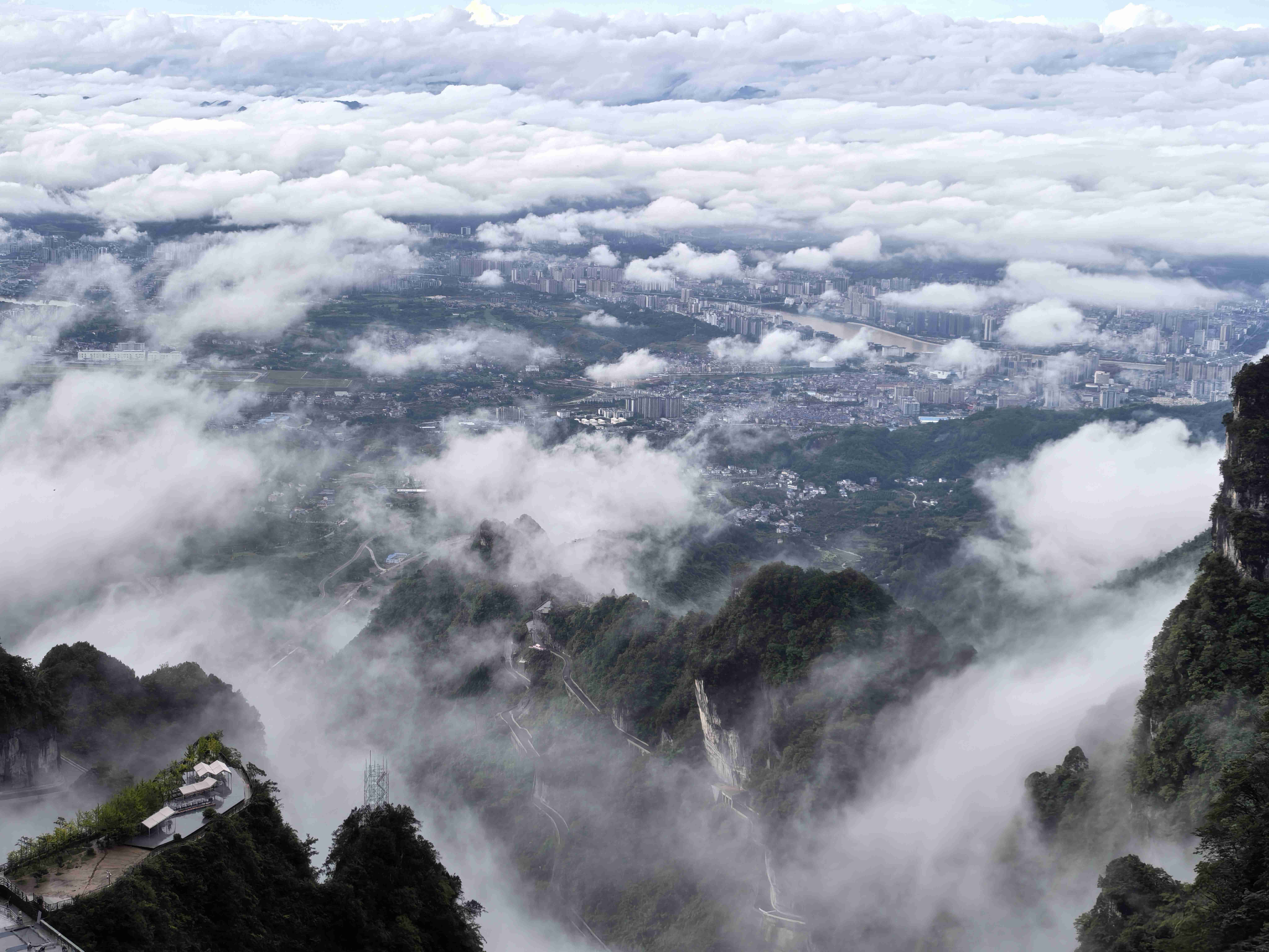 极目远眺,张家界市区的全貌尽收眼底:鳞次栉比的楼房在山脚下铺开,街道像一条条细小的银带,而远处的武陵山脉,奇峰罗列,在飘渺的云朵下舒展身姿,与市区的烟火气交织在一起,构成一幅壮阔又不失细腻的巨型山水画。