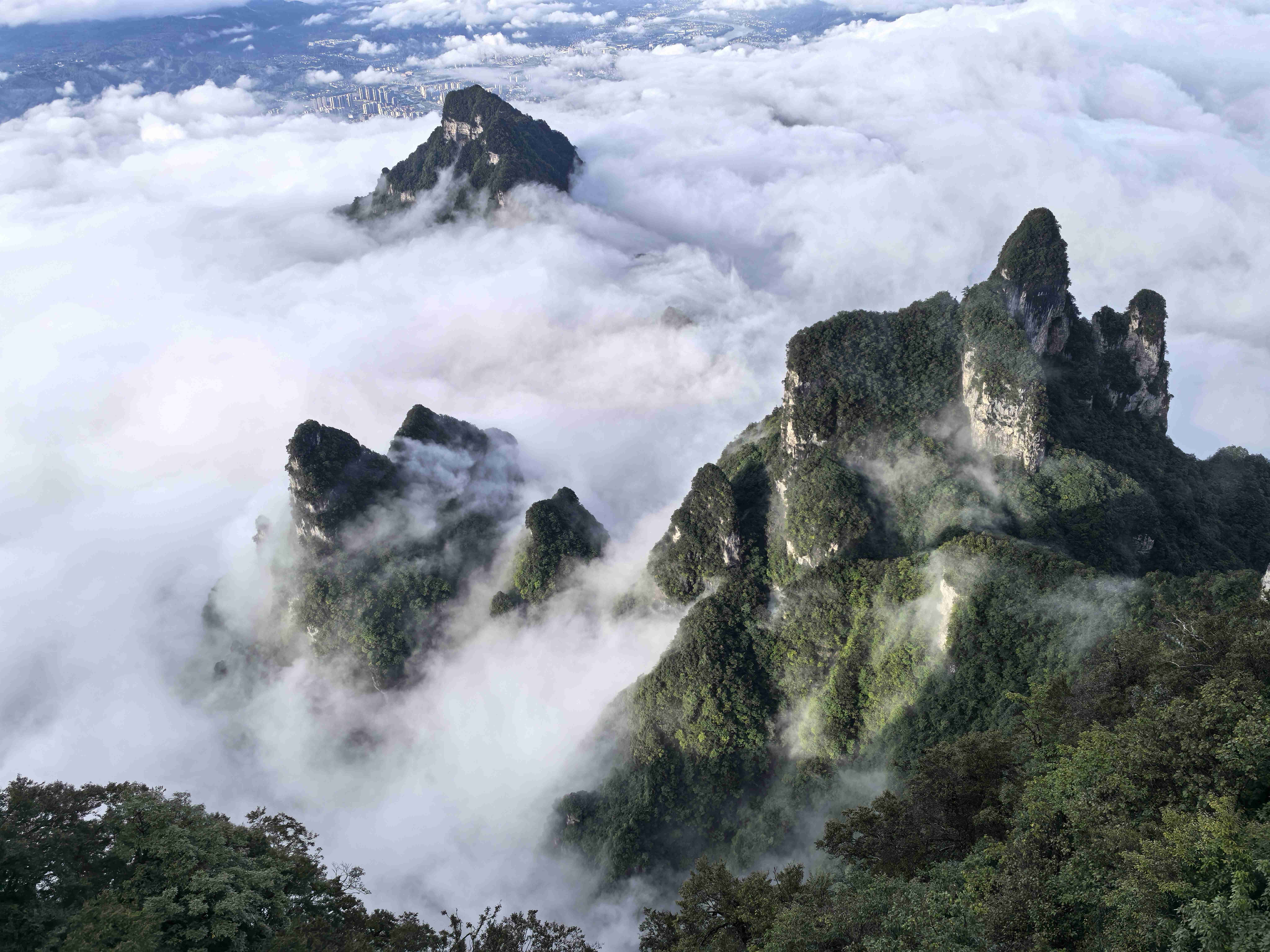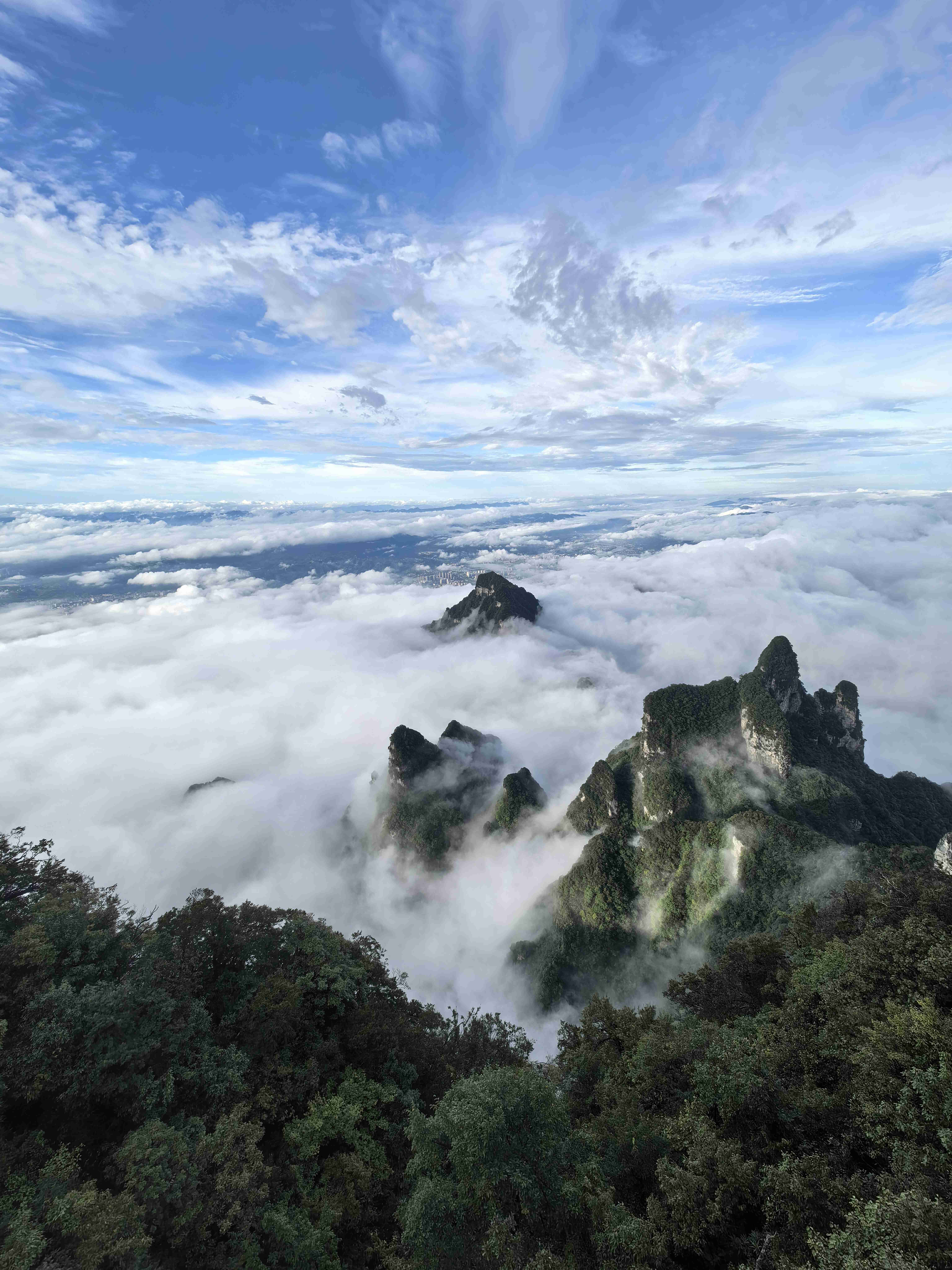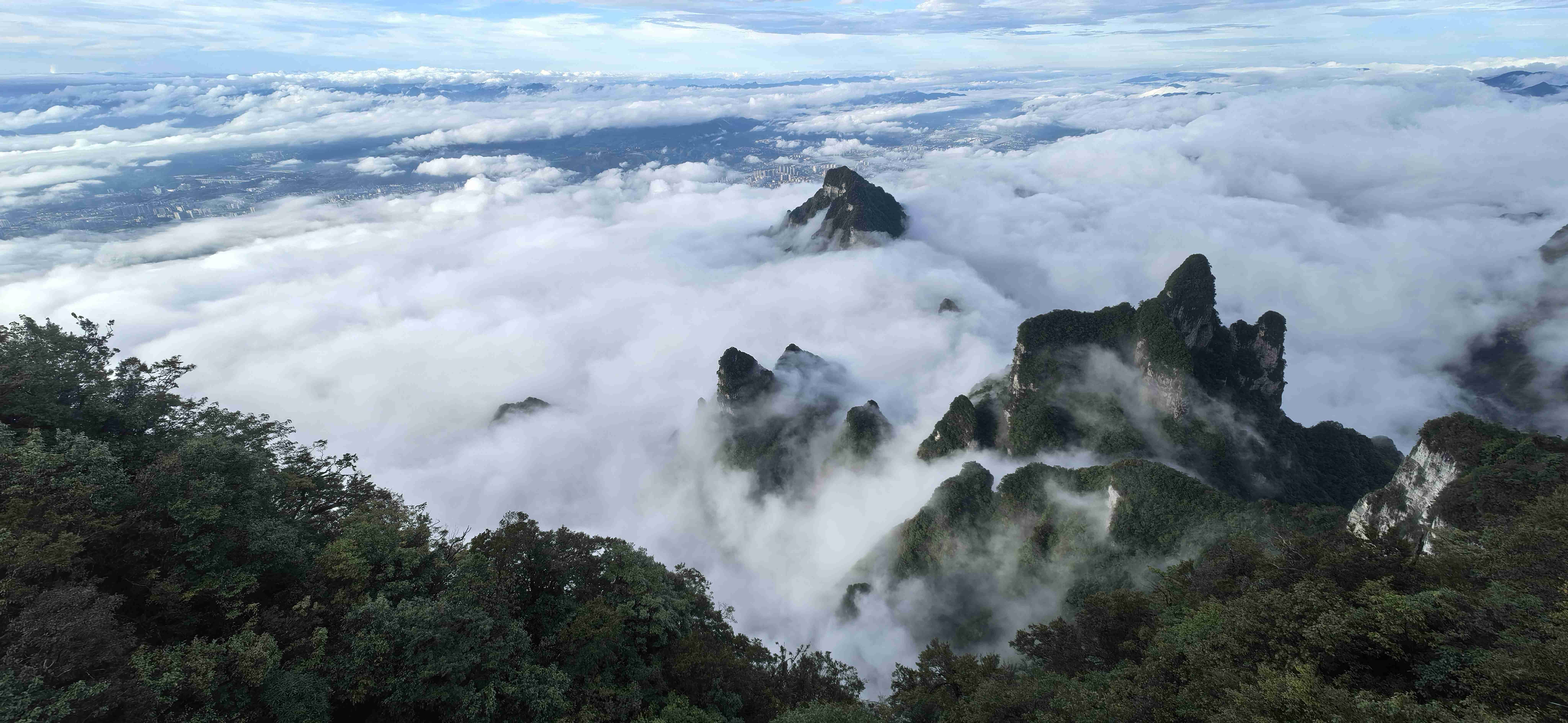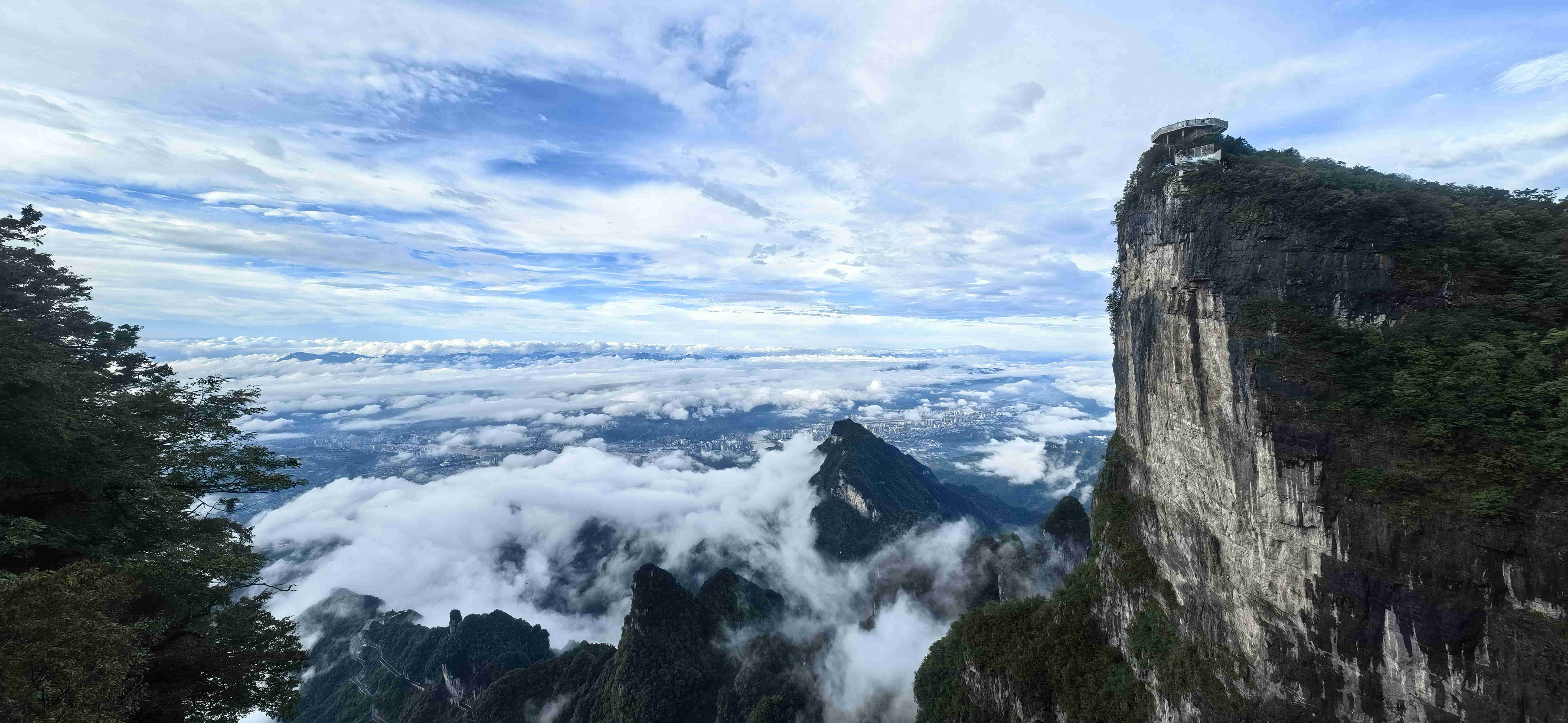 极目远眺,张家界市区的全貌尽收眼底:鳞次栉比的楼房在山脚下铺开,街道像一条条细小的银带,而远处的武陵山脉,奇峰罗列,在飘渺的云朵下舒展身姿,与市区的烟火气交织在一起,构成一幅壮阔又不失细腻的巨型山水画。