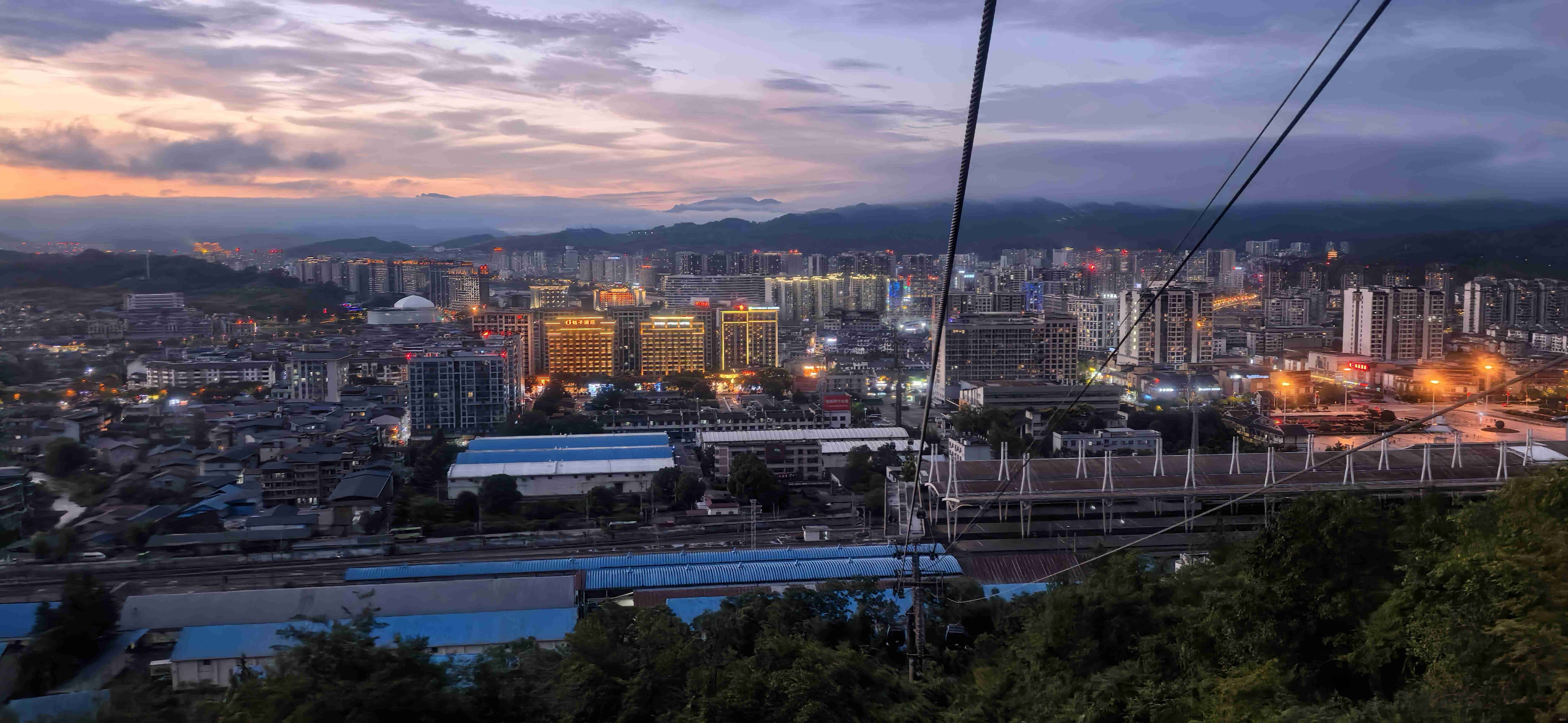 不知不觉间,夕阳渐渐沉入山峦,晚霞将天空染得通红。我们依依不舍地踏上下山的索道,导游说,这是国内唯一一座直接建在市区的索道,从市区出发,便能直达天门山顶。坐在缆车吊箱里,天空渐渐暗了下来,西方的晚霞依旧绚烂,红艳艳的霞光与山峦交相辉映,而缆车吊箱像一个个挂在晚霞中的灯笼,缓缓向山下移动。