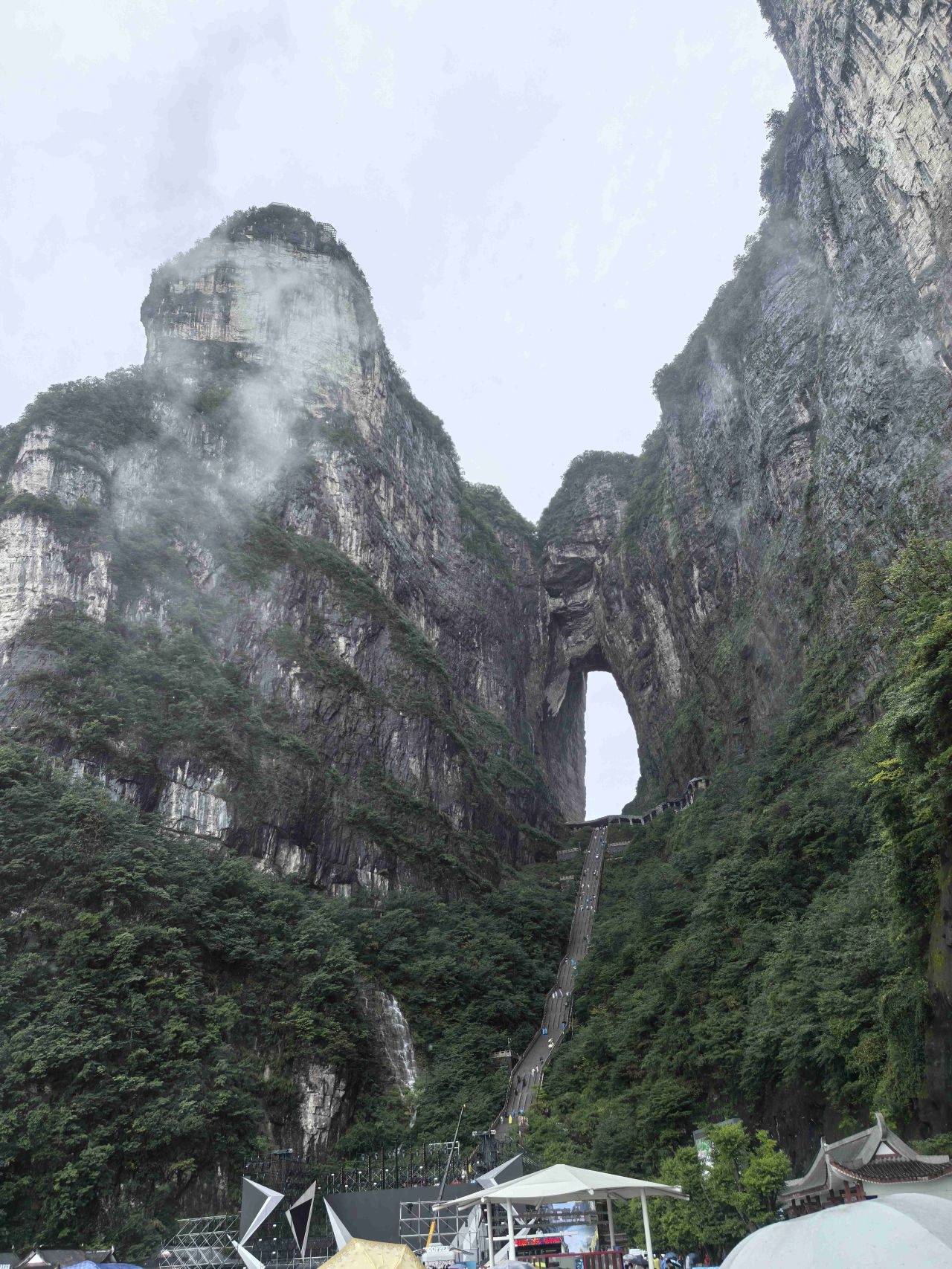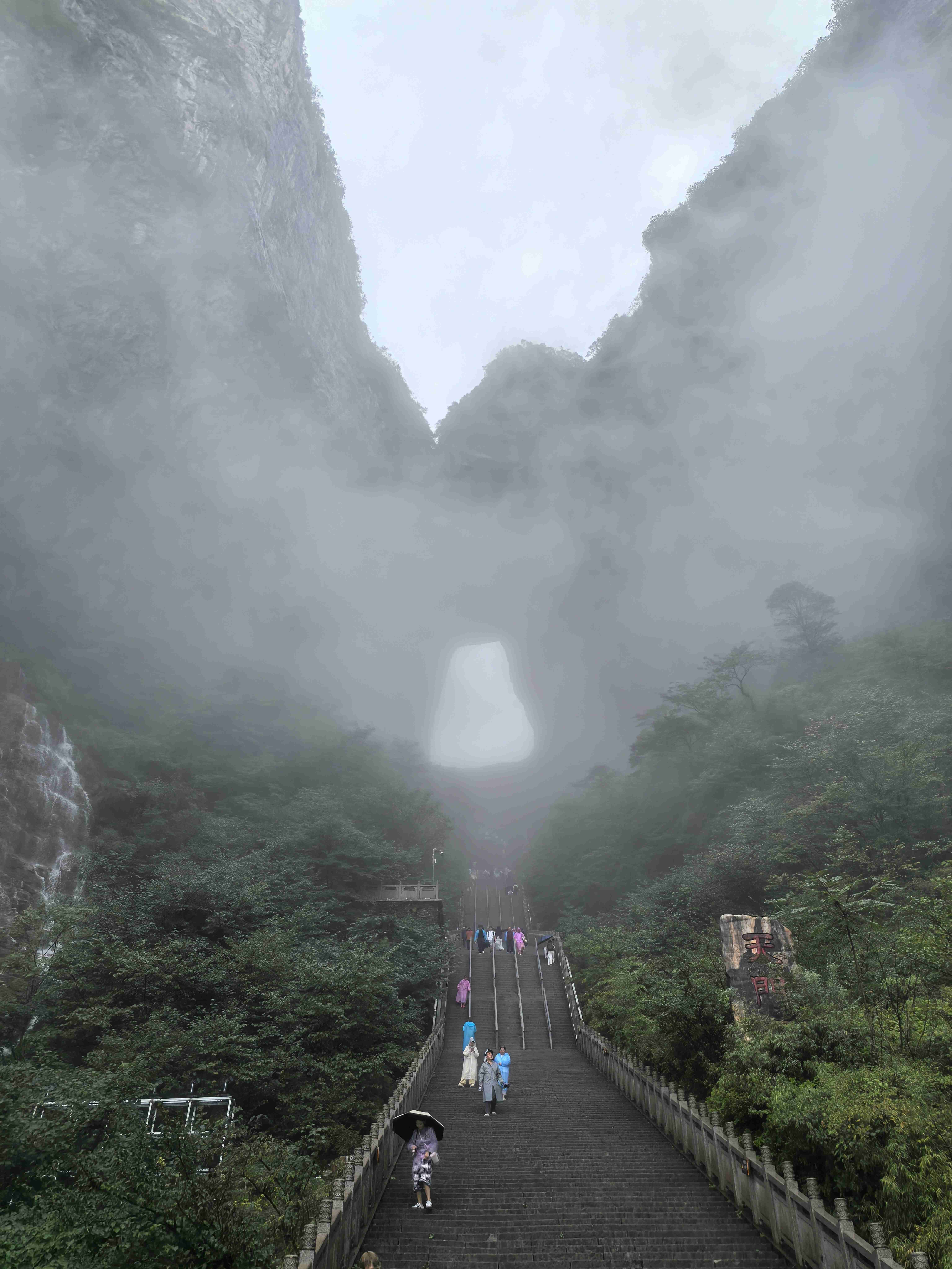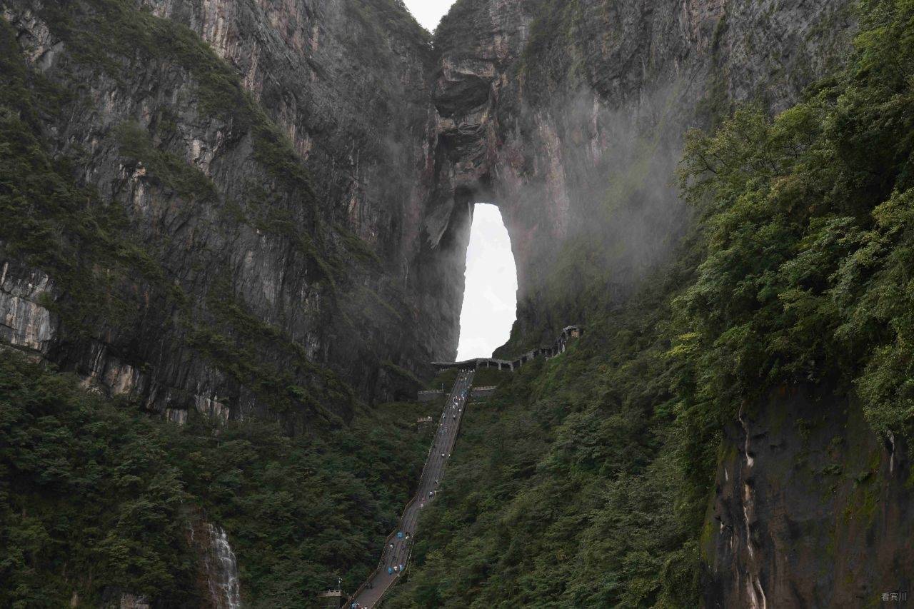 等我气喘吁吁地赶到观景台时,大部队早已在那里等候,见我过来,有人笑着打趣:“再晚来一会儿,天门洞的奇观可要藏起来了!”我连忙挤到观景台前,顺着众人的目光抬头望去——只见前方巨大的石崖间,一个天然形成的石洞豁然洞开,宛如一扇通往天界的巨门。而通往洞口的999级台阶,顺着山势蜿蜒向上,远远望去,竟像天门洞口中垂下的“舌苔”,将天地巧妙地连接起来。