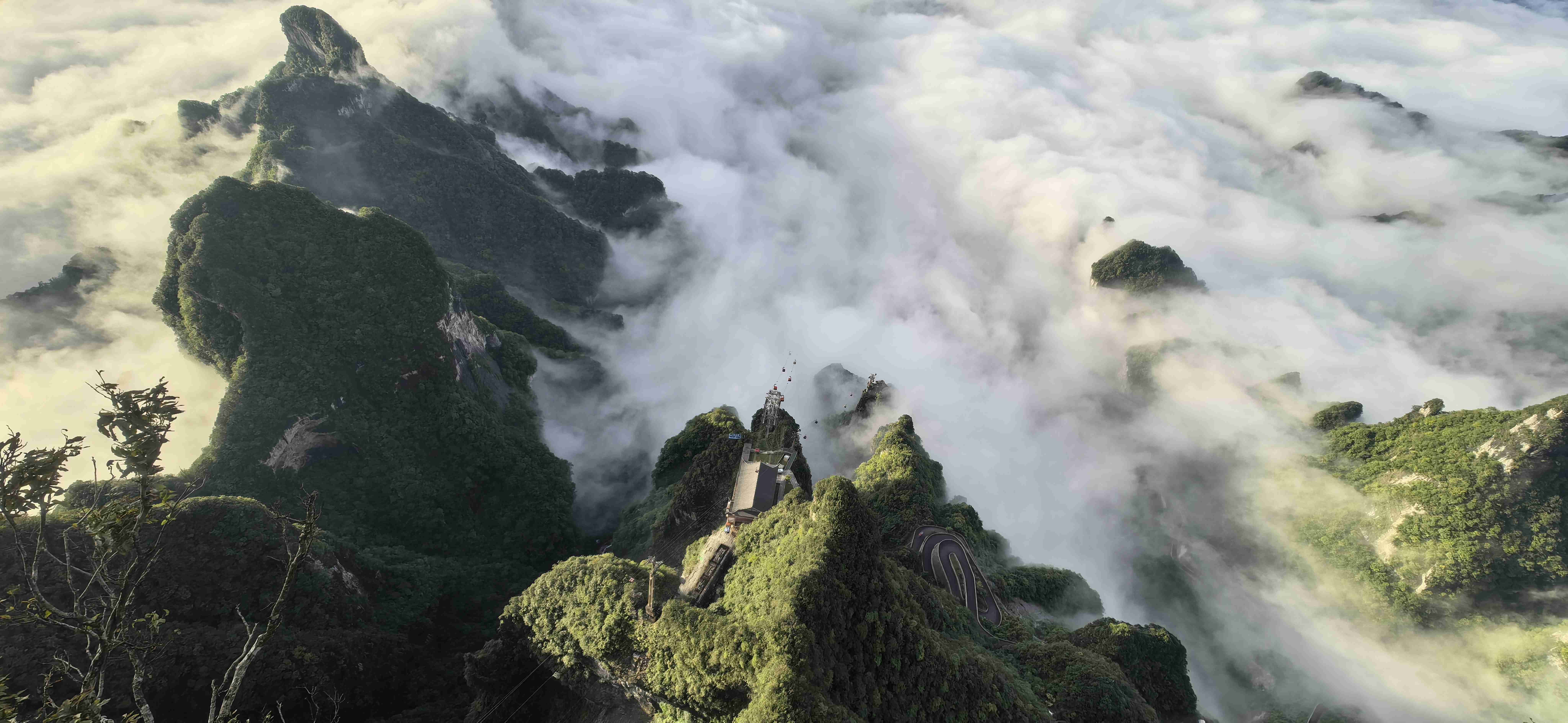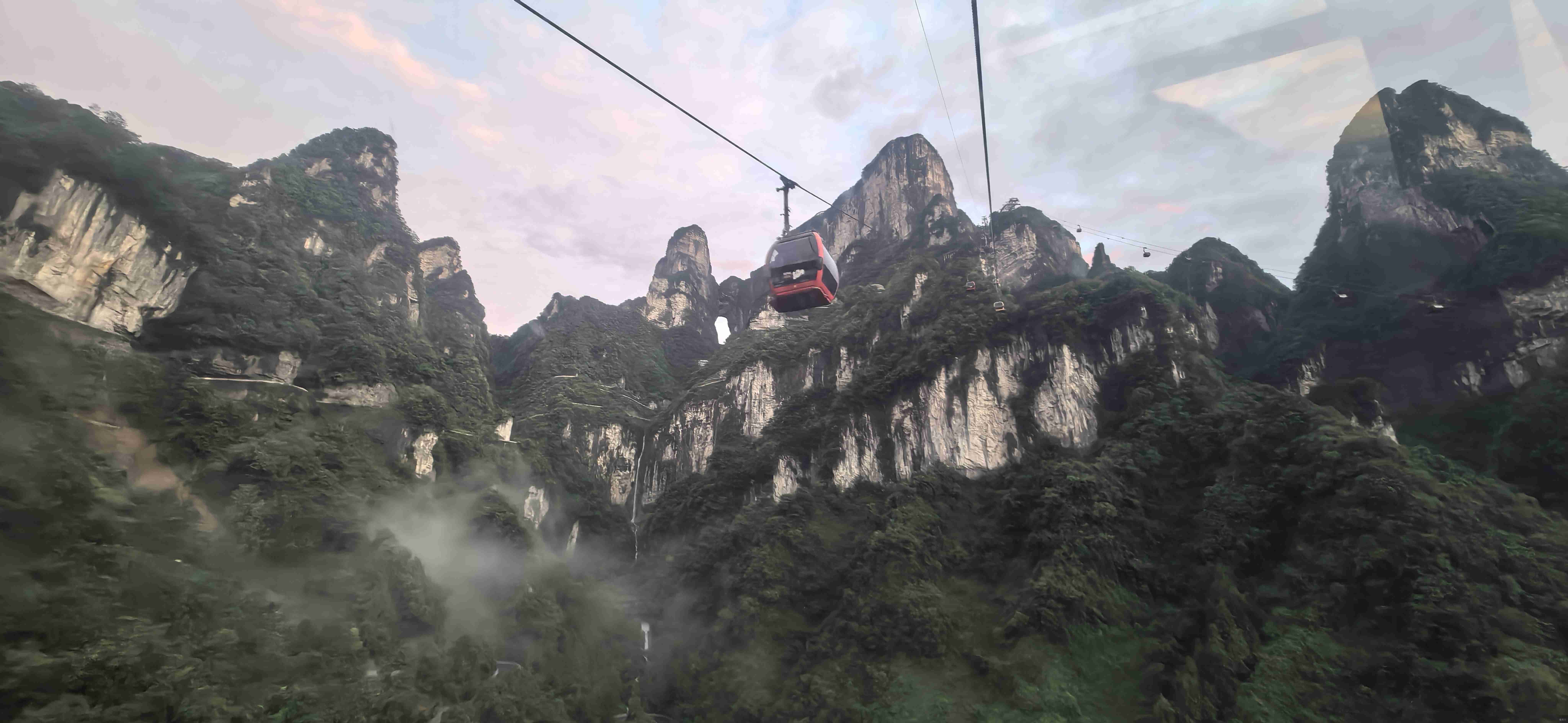 办完入山手续,我们先乘观光扶梯攀升,再转乘缆车直上天门山。缆车缓缓上升,窗外的景致愈发壮阔:原本近在咫尺的山峦渐渐变小,云雾在山谷间流动,时而将山峰完全包裹,只留一片白茫茫的云海;时而又悄然退去,让嶙峋的石峰露出真容,像是大海中浮现的小岛。