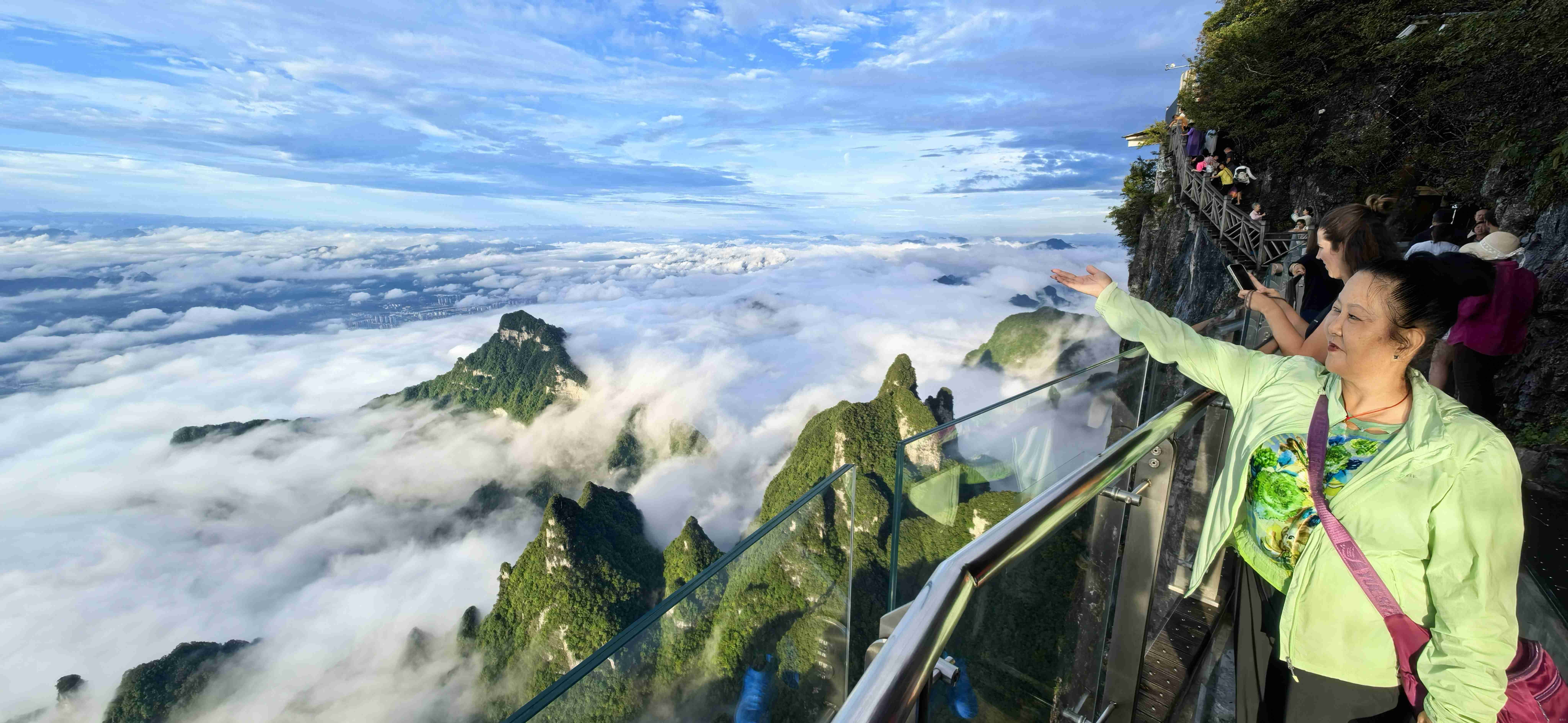 天门山的登山扶梯果然名不虚传,号称“世界第一”的七级扶梯串联在一起,像一条银色的长龙盘踞在山体中。不过十几分钟,我们便被直接送到了山顶。刚踏上山顶的平台,一阵清风扑面而来,带着云海的湿润气息。