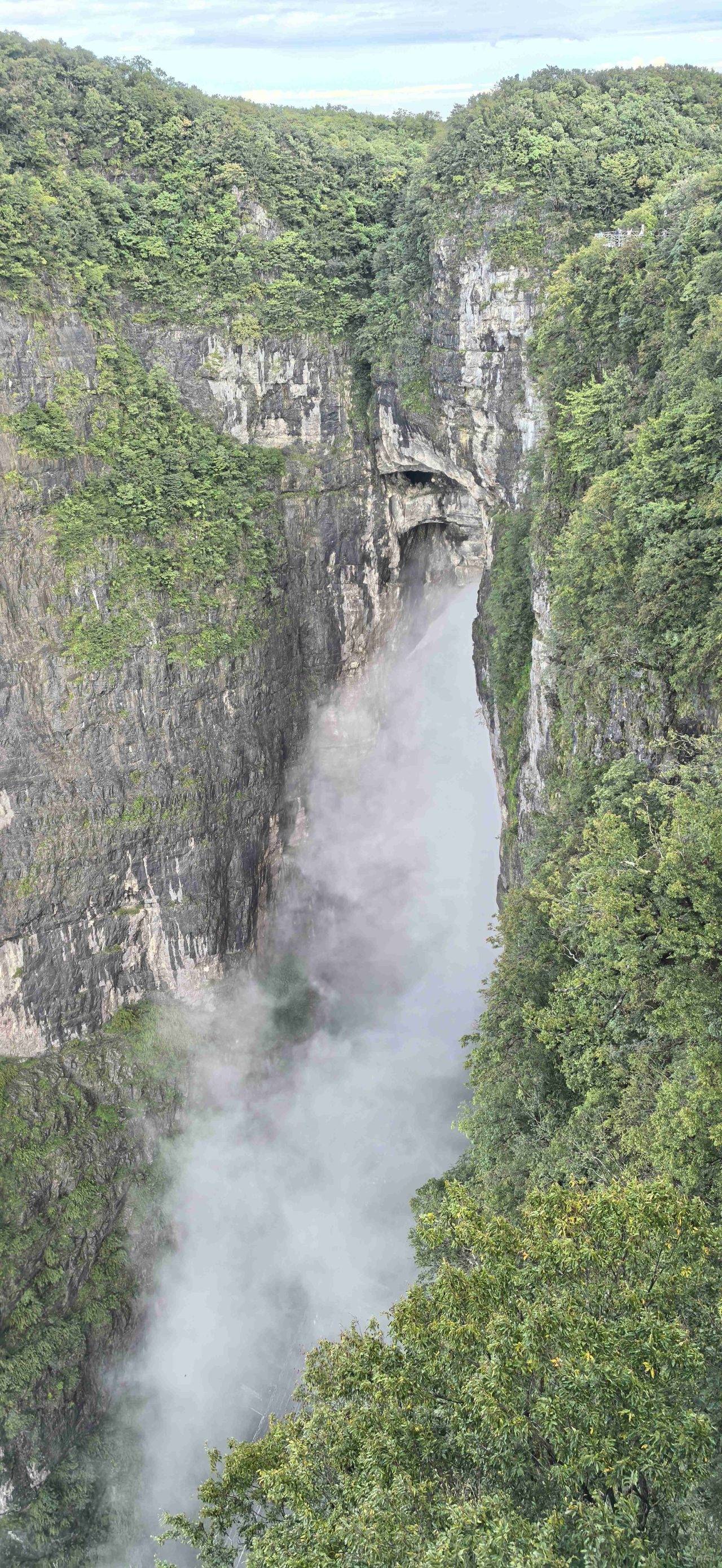 我们连忙低头望去——只见四周山峦的云雾早已散尽,唯有一股洁白的云雾,正从天门洞的洞口缓缓流淌而出,像刚挤出的牛乳般细腻柔滑,又似轻纱般轻盈,顺着山势慢慢往下倾泻。云雾流过999级台阶,绕过山间的绿植,在山谷间形成一片薄薄的云毯,阳光透过云雾,在云毯上洒下金色的光斑,美得让人窒息。我曾在画册里见过“天门吐雾”的照片,却从未想过能如此身临其境——那云雾仿佛有生命般,时而浓稠,将天门洞遮得只剩一道轮廓;时而稀薄,露出洞口的岩石纹理,每一秒都在变幻着姿态。我只顾着不停按动快门,生怕错过这稍纵即逝的美景,连呼吸都变得小心翼翼,生怕惊扰了这份仙境般的宁静。