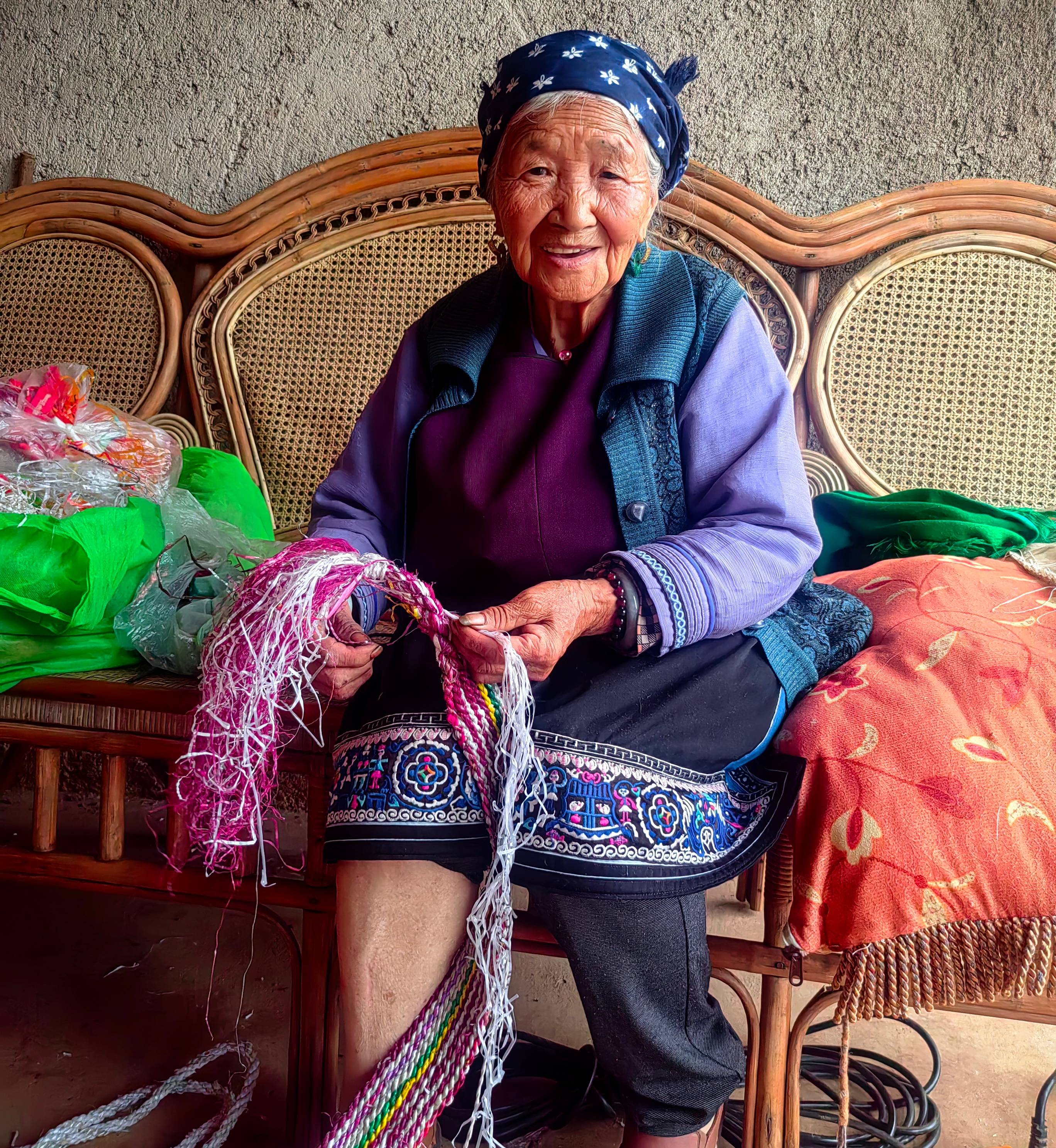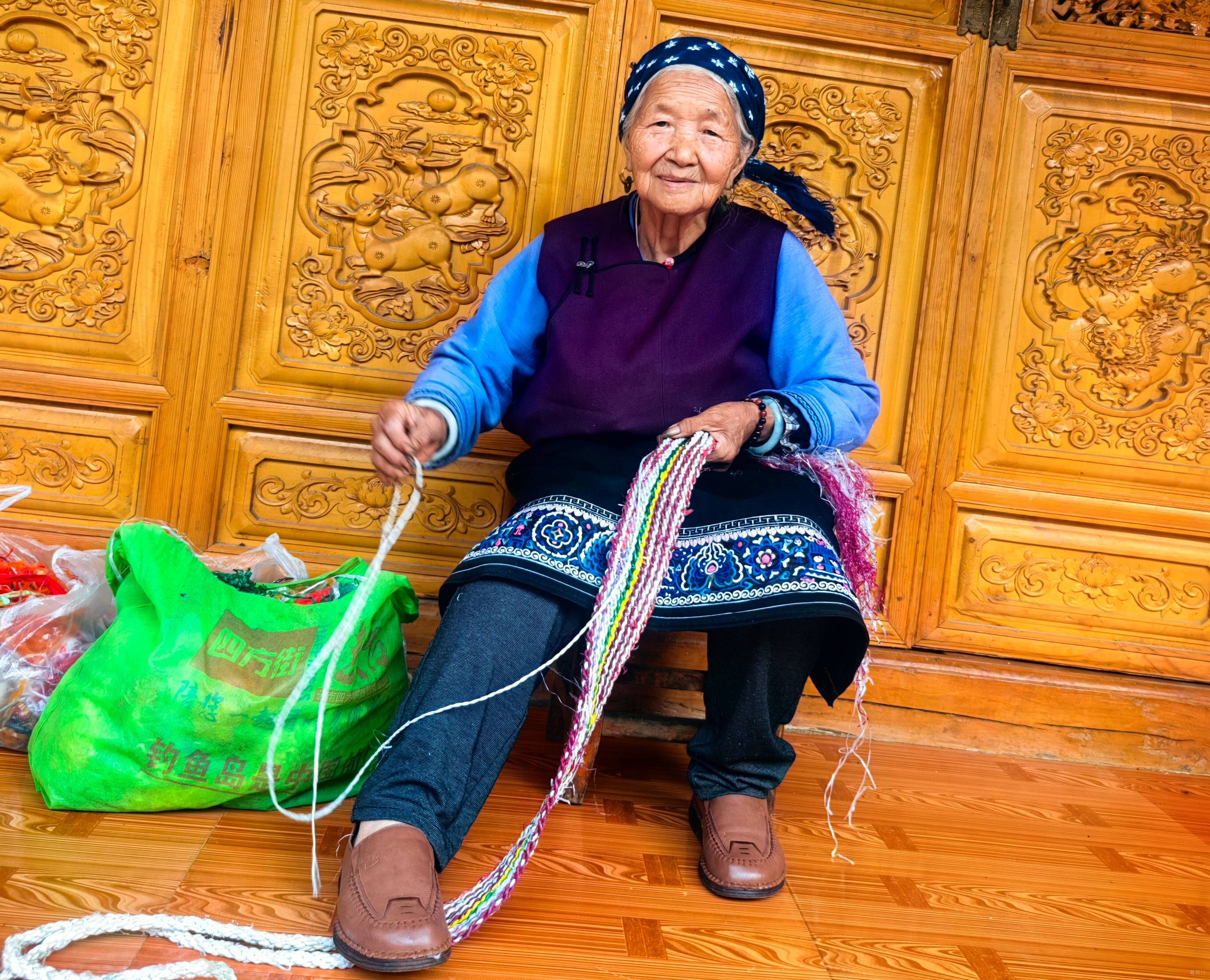 奶奶做背绳也是从原材料开始就自己准备,她经常找来一些各种颜色的口袋,一根一根的线被抽出来,左一捆右一捆的放着。遇到颜色独特一点的口袋奶奶就会很开心,因为那样拆出来的线会好看一些,做出来的背绳也会很独特。有时候我去看奶奶,经常看见她裤脚拉起来一只,在认真的搓着背绳。她告诉我牛井县城里买这个背绳的少,有时候做了也卖不出去,还是要回我们镇上卖。村里的人们打核桃,背草,做各种农活都用得。所以80多岁的奶奶还是会经常去镇上的集市卖她做的背绳。现在奶奶又回来和三叔家住了,奶奶说回三叔家之后卖背绳都方便多了。三叔说:“你奶奶天天都问,哪天是星期一啊,我要去镇上卖背绳了”。我们会给奶奶钱,给奶奶买吃的、穿的。也劝她别做那些了,经常做伤眼睛,腰也不好,但是奶奶就是不听,依然坚持做着,我们也就随她了。也许一直有事做,奶奶才那么精神吧!