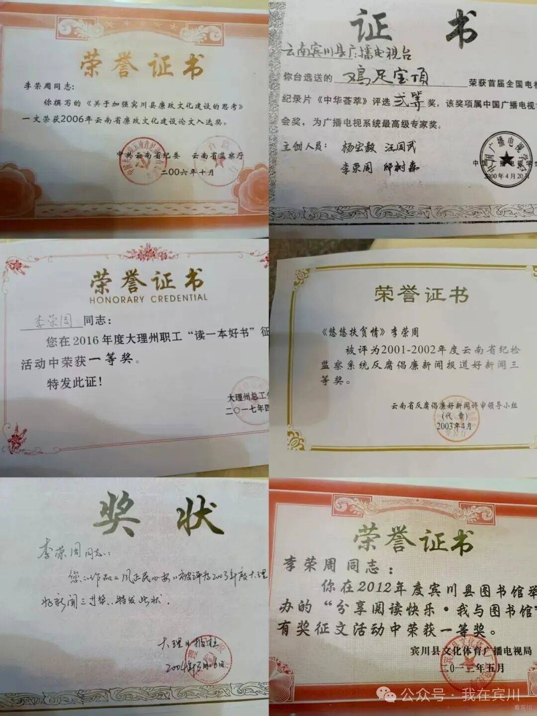 在这些奖项里,有2项获得国家级认可、7项获得省级肯定、10项州级荣誉、16项县级表彰,其中最让宾川人熟知的,莫过于2017年8月的那篇《鸡足山赏月》。彼时,新华网股份有限公司与中共大理州委宣传部联合主办“千字美文抒写千年大理——风花雪月·乡愁大理”大型网络征文,李荣周笔下的鸡足山月色,既有“山月随人归”的意境,又有“此月是乡月”的乡愁,最终斩获三等奖。这篇文章,让更多人透过文字看见宾川的浪漫,也让鸡足山的月亮成为宾川的一张“文化名片”。