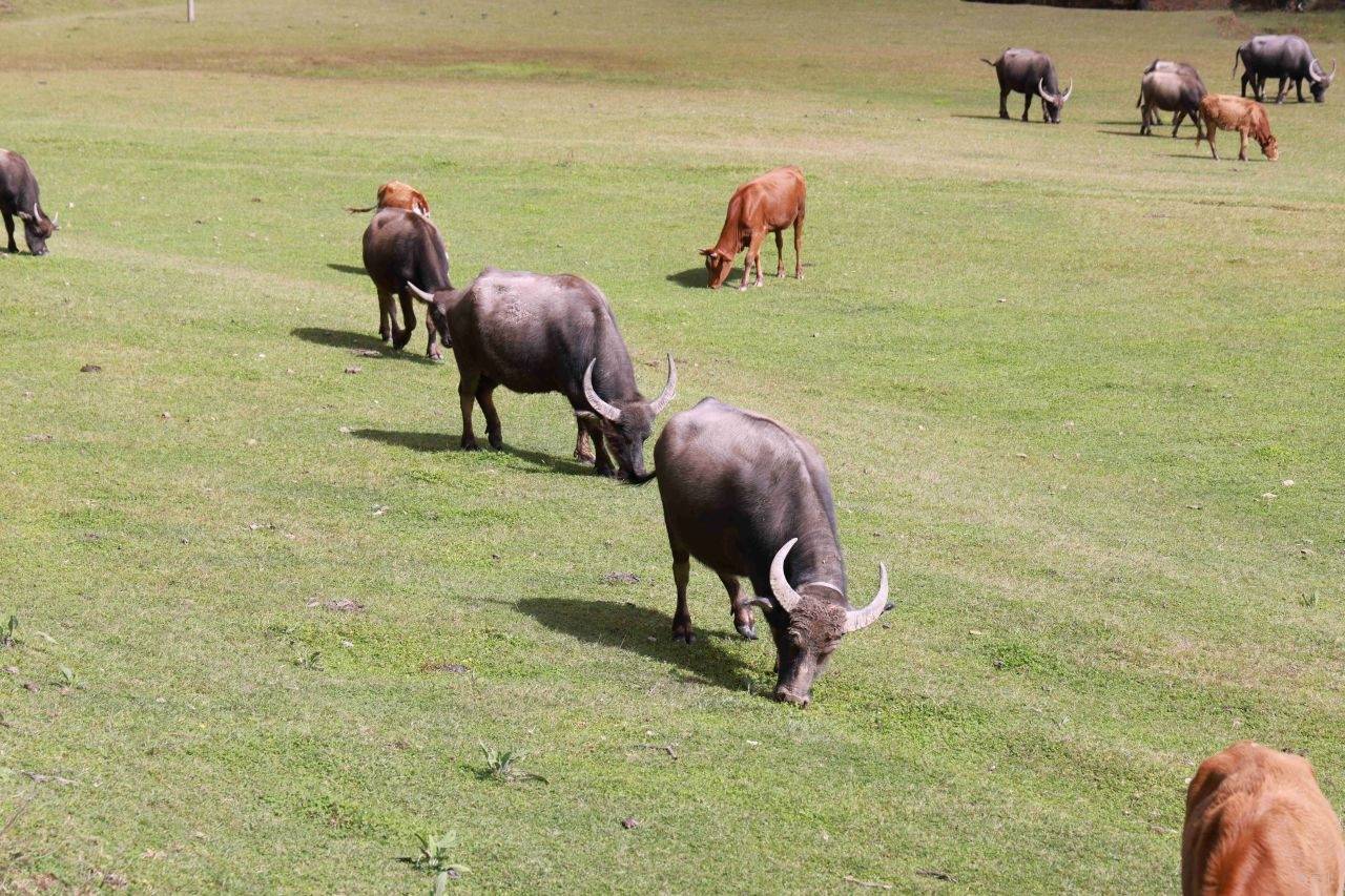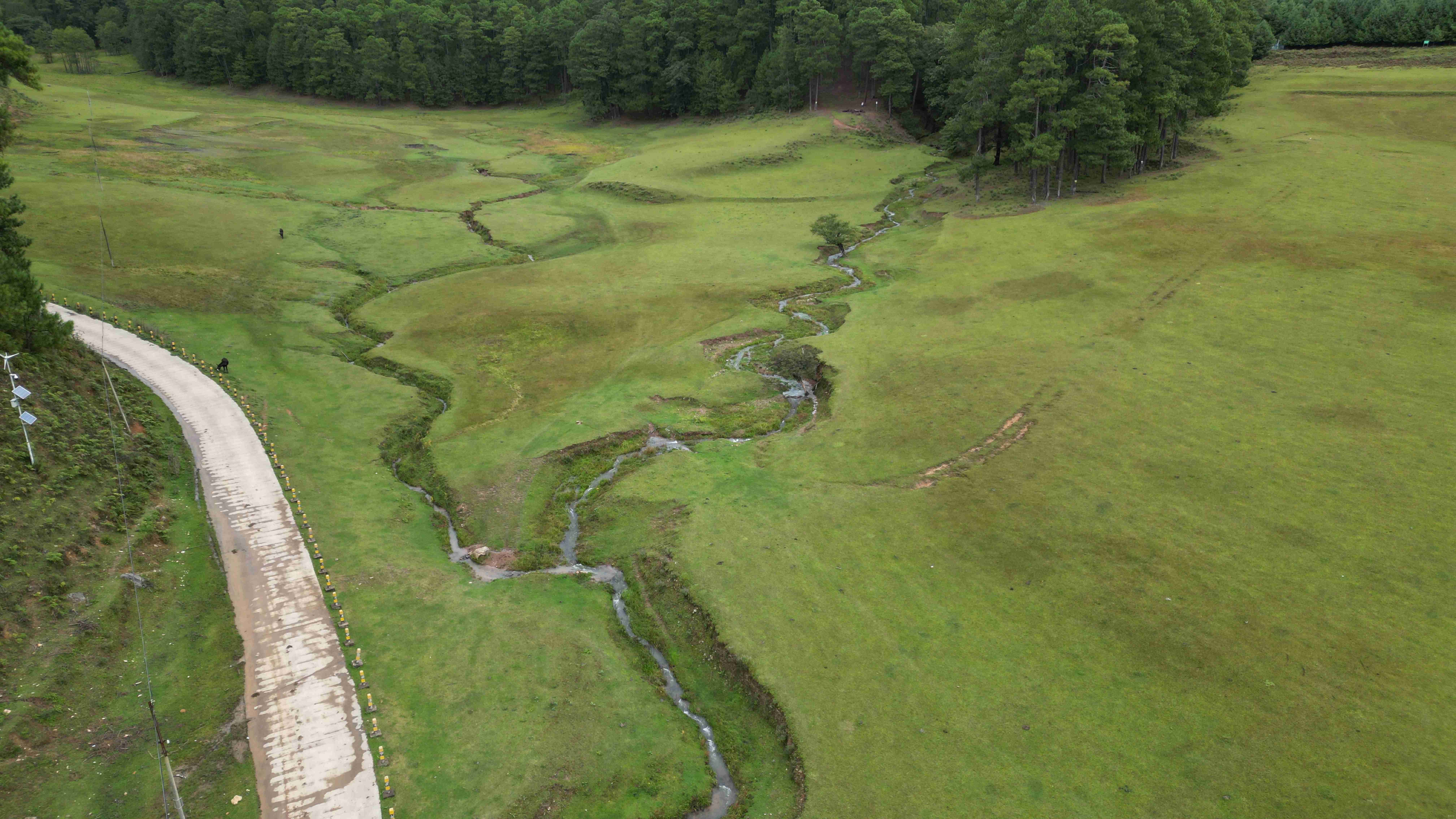 升起无人机,从空中俯瞰,草甸中的小溪像一条条丝带,又像一棵枝繁叶茂的巨树,根系深深扎进草甸里,与周围的绿色融为一体。蓝天白云下,黄牛、水牛、山羊慢悠悠地挪动着,偶尔抬头看看天上的无人机,又低下头继续吃草;游人们三三两两地散在草甸上,有的铺着野餐垫聊天,有的举着相机拍照,孩子们追着蝴蝶奔跑,笑声在空旷的草甸上回荡。