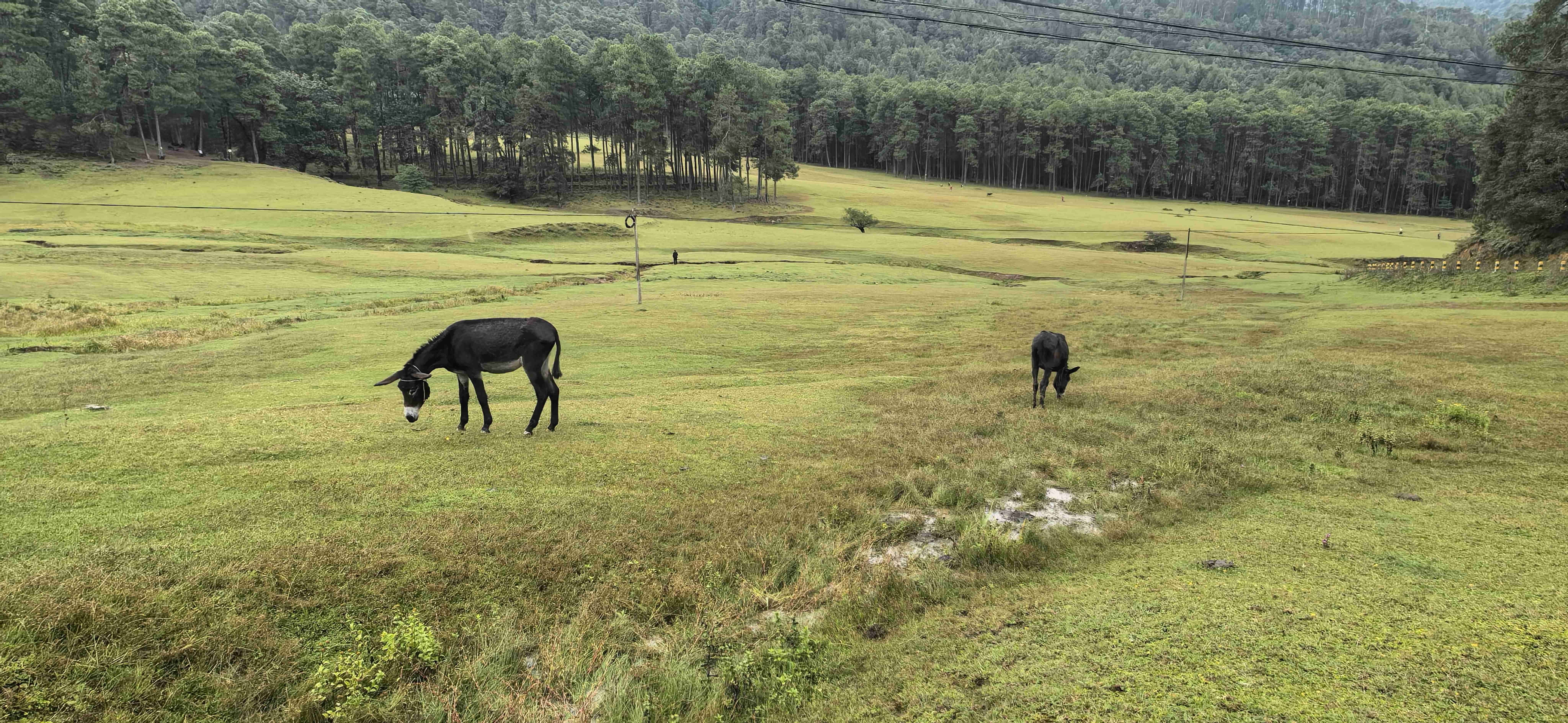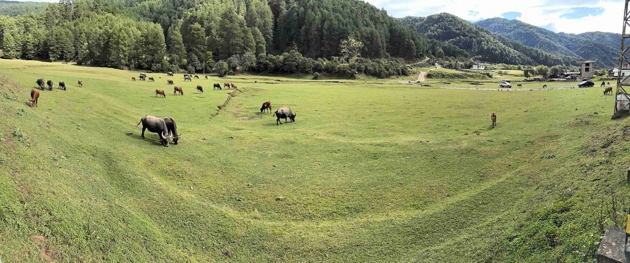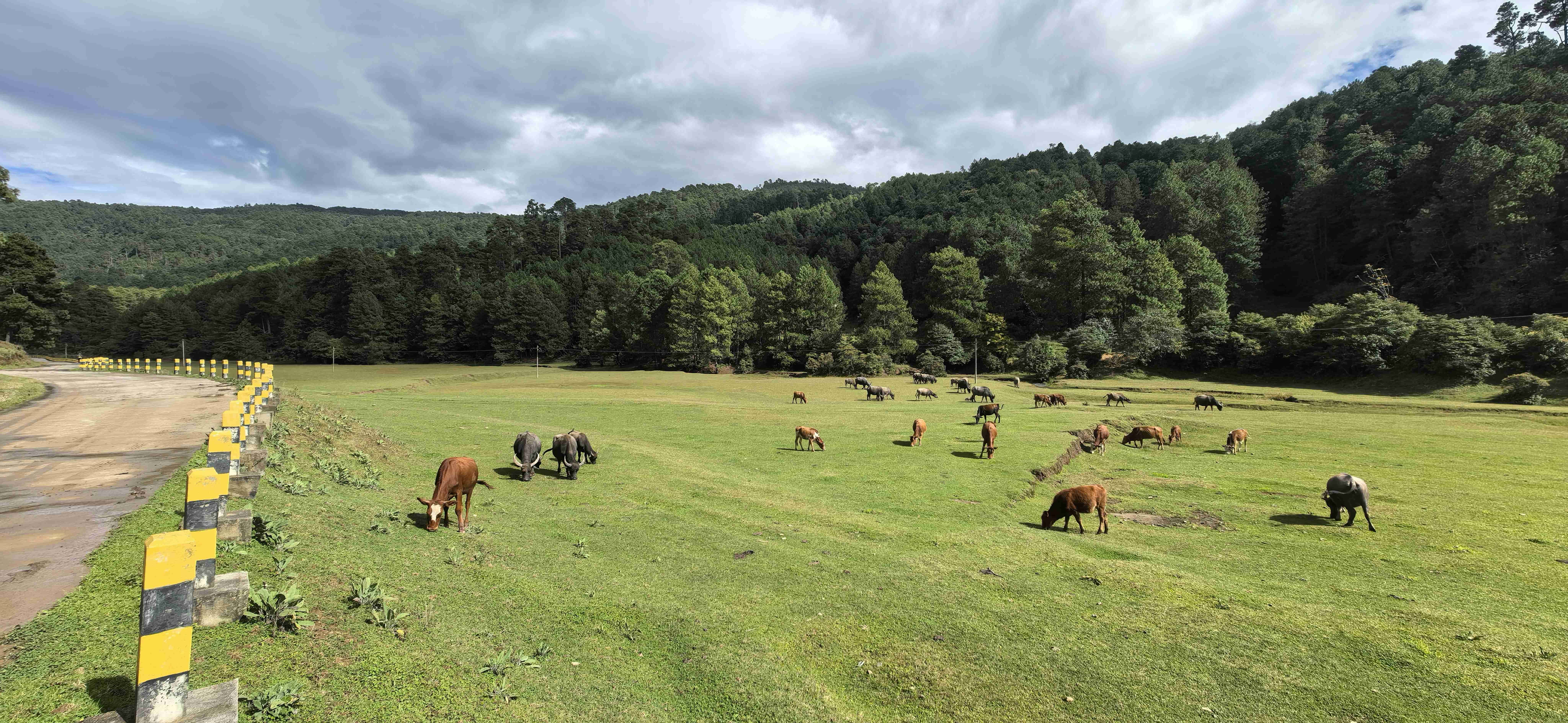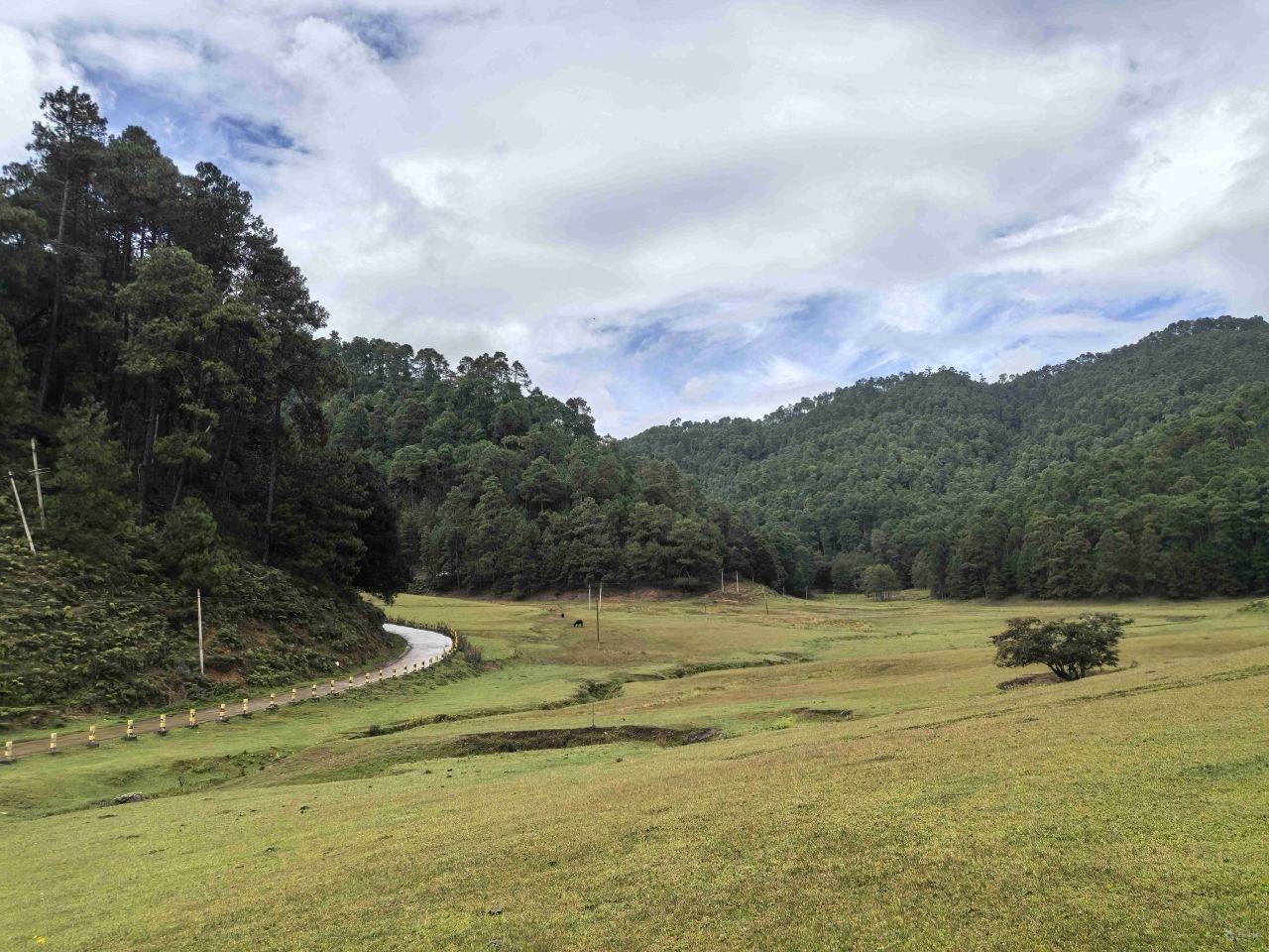 车子驶出一片茂密的树林,眼前的景象让我们不约而同地惊呼出声:一大片开阔的高山草甸铺展在眼前,像一块碧绿的地毯从山脚延伸到山腰,牛羊马驴散落在草甸上,低着头悠闲地啃着草,尾巴时不时甩一下驱赶蚊虫。公路从草甸边缘轻轻绕过,一块巨大的石头上,“大浪坝”三个用绿油漆描过的大字格外醒目,与周围的草甸、森林融为一体,毫无违和感。