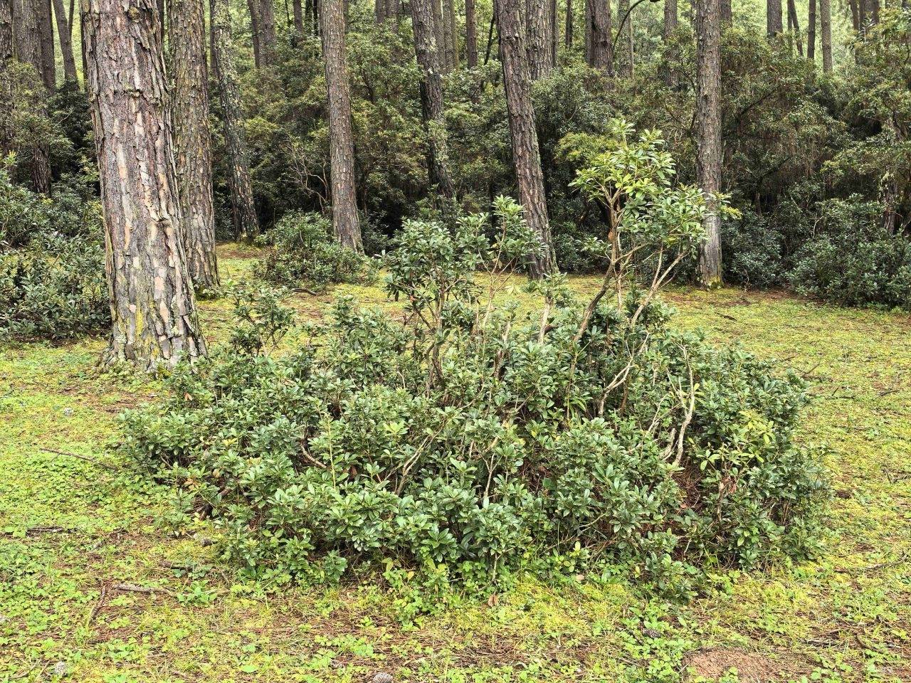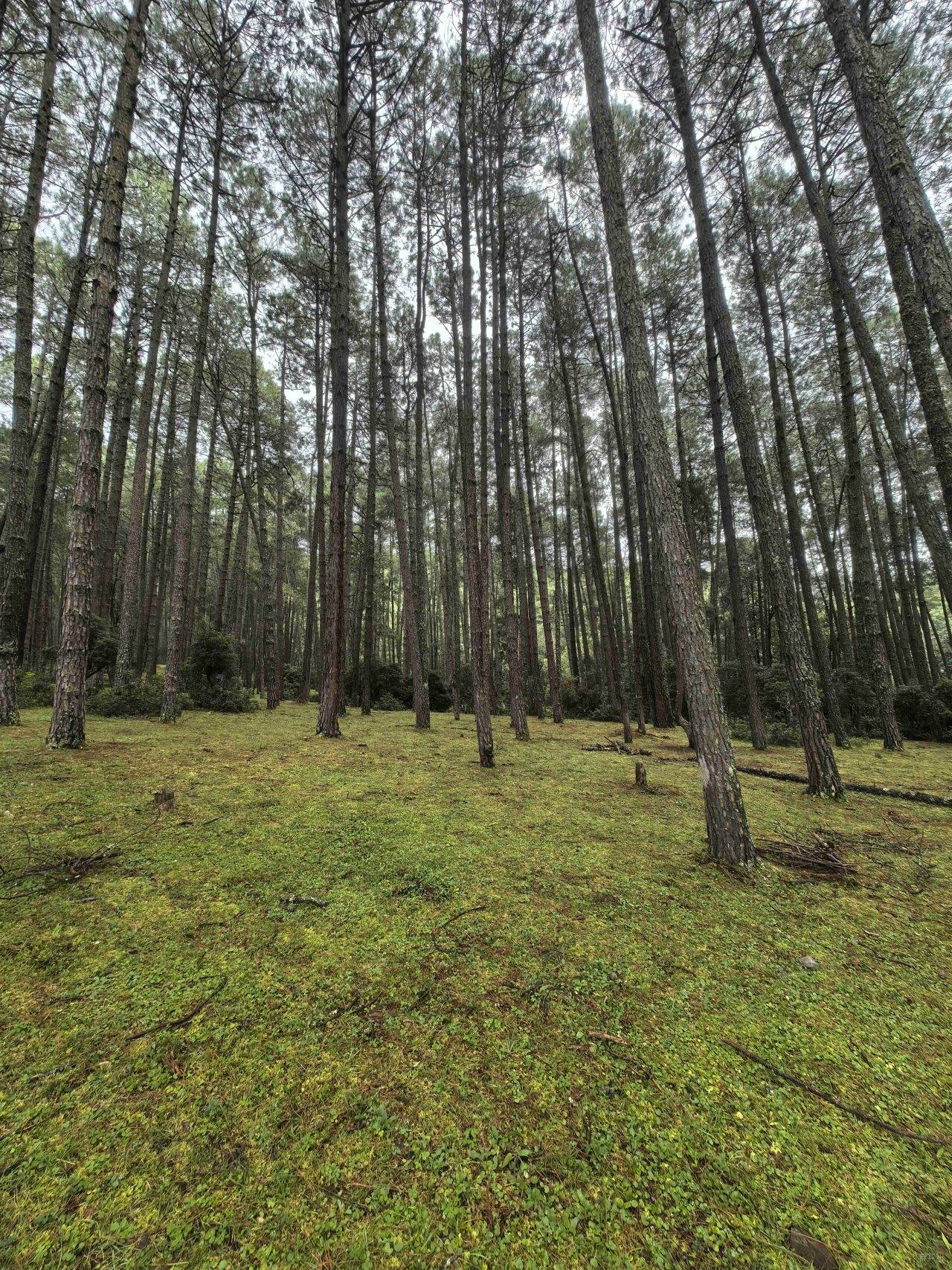 我们沿着草甸旁的小径往里走,钻进参天的松林里。抬头仰望,笔直的树干直插云霄,阳光透过枝叶的缝隙洒下,在地上投下斑驳的光影;脚下的落叶软软的,踩上去发出“咯吱”的轻响;野生蓝莓(当地人称“雀米果”)的果实已经变色,从青绿变成浅紫,摘一颗放进嘴里,酸酸的滋味在舌尖散开;苦里巴花缀在枝头,白黄色的小花引着蜜蜂嗡嗡地飞来飞去。