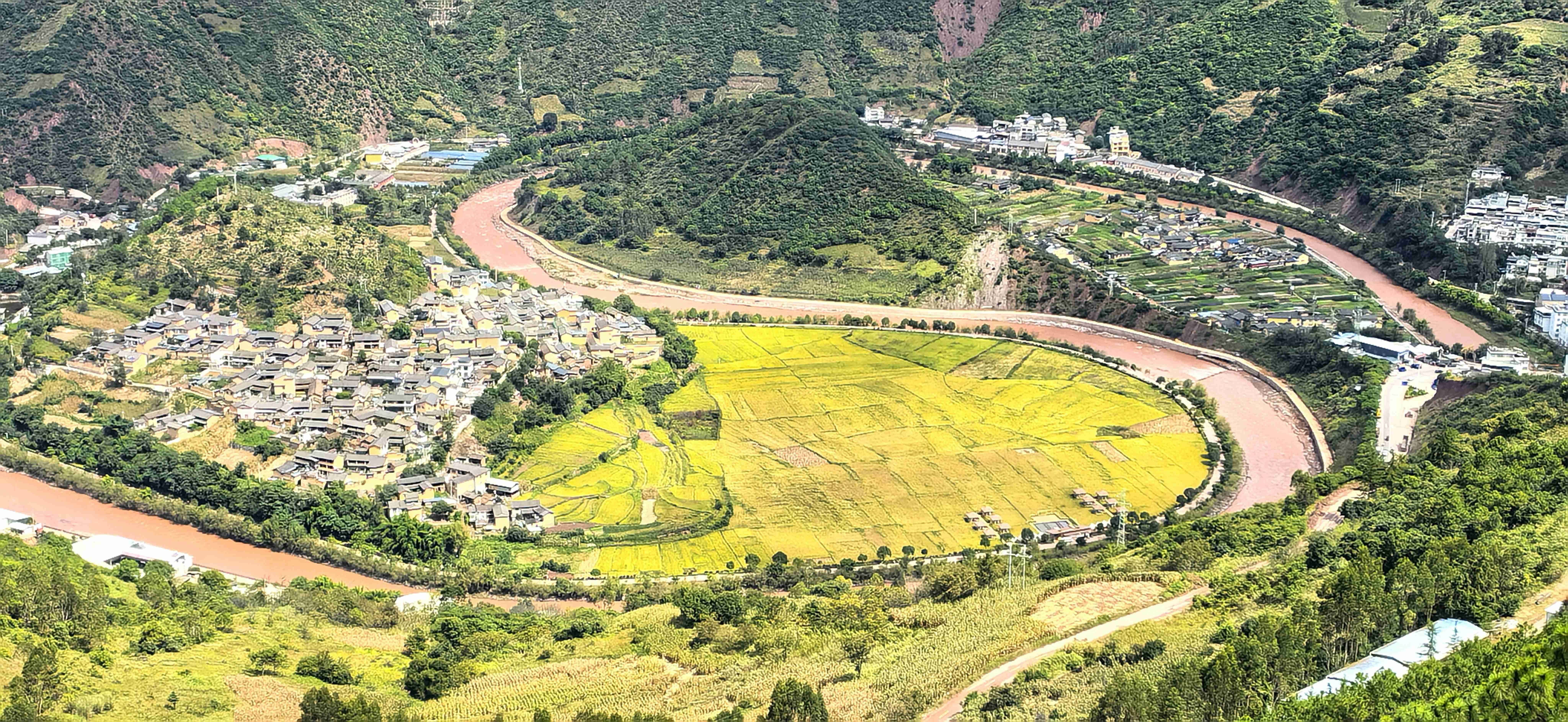 金秋十月的观景台,与五月相比简直是天壤之别。彼时还是嫩柳抽芽的时节,如今却满眼都是成熟的色彩:从观景台俯瞰,云龙河像一条绸带,在群山间蜿蜒出天然的八卦太极图案。太极中心的田畴里,稻谷泛着金黄,在阳光下闪着光泽;周边的古村静谧地卧在八卦里,青瓦白墙与金黄的稻田相映,像一幅被精心装裱的田园画。好友举着相机拍个不停,我却忍不住频频看表——心里的牵挂,还是在天池那边。