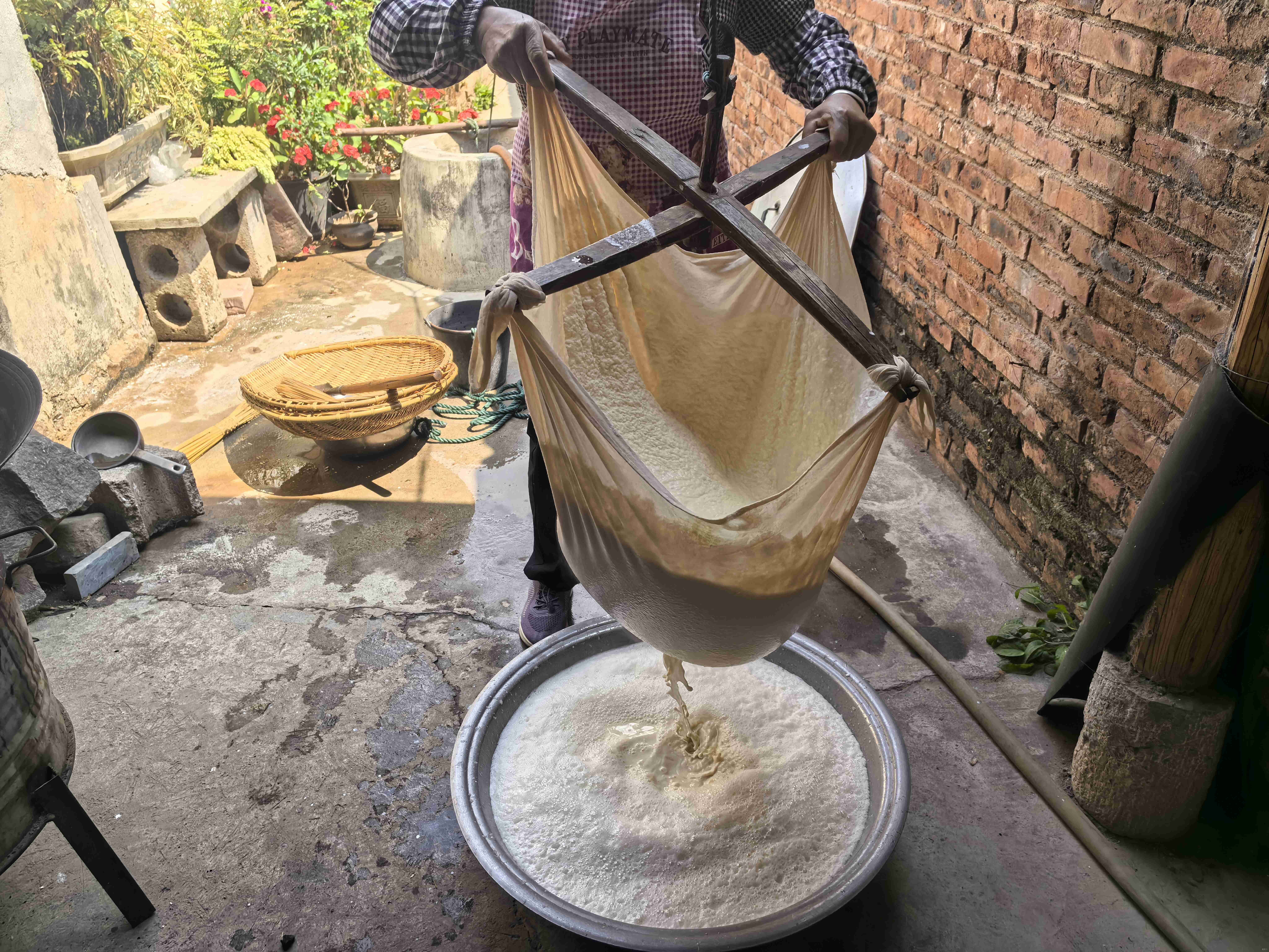如果把那豆面先用水调成稀面糊,在用纱布进行过滤。过滤过的浆液沉淀出的叫小粉。滤后剩下的渣就叫豆腐渣。这豆腐渣一般就是用来渥成制豆瓣酱的主料,也可以直接炒了吃。那小粉要晒干收藏,以后每次可以取一份出来调成浆液就可以制成稀豆粉,凉粉。一种我们叫小豆腐的食品,妈妈年轻时常做,每次制凉粉时都会有一小点,可惜现在妈妈已经离开了两年多,在几个月就三年了。可惜的是我也忘了那是怎么做的了,在百度上查了许久,搜索出来总说就是现在的包浆豆腐,其实根本就不是一样的,那小豆腐其实比一般豆腐要粗糙一些,现在的萂村坝子也常有,隔不久就会去买了回来凉拌着吃,比一般的豆腐拌出来好吃得多。