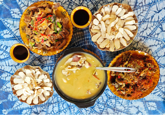 小陶山里长大的人,厚道实诚,经营多年,诚信深为食客和买家认可,于是整个云南吃菌子的季节,一家人便全忙碌于采菌收菌,加工邮寄。顾客一年比一年多,忙得不亦乐乎。其实我对小陶的生意并不在心,而是对陶缘居煮菌的厨艺念念不忘,从火塘到味道无不独到鲜美,令人一食难忘。他家松茸煮鸡炖火腿,松茸鲜嫩,鸡是山里人家的飞鸡,火腿是他们家自制的优质土火腿,调料新鲜纯正,汤味鲜美得令人骂牛。是我最爱。不说啦,一说就流口水。再说了,火把村山区小院,不大,知道的人太多,怕我再去占不到位置,而我是那么热爱火塘煮菌子啊!这个午饭我们吃的是山野的鲜美,三个菜加一碟“老友”腌豆腐。三个菜是:一大锅松茸煮土鸡炖火腿;一大盘炒新鲜菌子,混炒的菌子有奶浆菌、青头菌、牛肝菌;两大盘鲜松茸切片醮芥末醮水,边吃边切添加;一大盘凉拌树花青蛙皮,酸辣厚实。全是解馋下饭山中菜,我们六人无不交口称赞,饕口馋舌,大快朵颐,在云南山中吃菌就该是如此的酣畅淋漓,让斯文随山风湮灭。