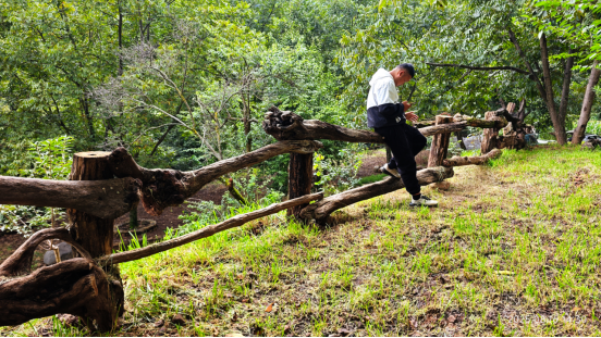 我们在大公石前七八米处的一块平整的,近两平方大的大石头充当的天然石桌前坐下,九个石凳也是用九个平整的天然石头担任。这一块平整的林地是客房前较为开阔的浅草地,有三五棵大的核桃树生长其间,前面边沿用大原木打桩,桩依地成弧形,上下各固定一根大原木相连接做起一道随意的护栏,漂亮写意极了。让我不由想起徐霞客在鸡足山看到的同样的护栏“楼前以桫松连皮为栏,制朴而雅,楼窗疏棂明净。”正是此情此景。