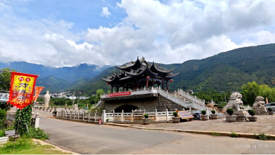 杨崇和红云同学按约来到洗心桥已十二点过,我家早在洗心桥那玩了半早上了。鸡足山资深导游万鹏李万导和皓阳,父子两也赶过来相陪。沙址河温柔地依傍在老太山西麓,河水由南向东汩汩淙淙七弯八拐地向金沙江半推半就地流去,满心欢喜。今年宾川雨水是几十年来未有过的好,洗心桥下沙址河水奔腾欢快,流得底气十足。我们站在高高的古阁楼式风雨廊桥上看沙址的景致,青瓦风雨廊亭的洗心桥雕梁画栋飞檐翘角,在廊桥迎面的廊檐下挂着云南书法大家,宾川县徐霞客研究会会长黄向寔写的“洗心桥”匾,一款两匾,分挂两端,黑底金字,字体厚重饱满,法相庄严。桥头第一对廊柱上挂一对木制阁联,上联“四面青山怡倦眼”,下联“一溪绿水洗尘心”,恰如其分地写出了踏上桥头的释然与放松,很有治愈的松弛感,真是境意相通,心境相融;桥尾第一对廊柱上一对木制阁联是“远看塔影高银汉,静听钟声下翠微”,站在桥尾举头远望金顶宝塔,神思邈远,仿佛鸡足山那些若隐若现的寺院中的暮鼓晨钟声,伴着悠然的神思越过满山的青翠,悠然传来。两对木制阁联和“洗心桥”匾同样的黑底金字,黄向寔撰书,落款时间是2024年仲秋。黄老师诗书俱佳,尤以书法名。其实黄老师诗联格律工整,更是情境相融,诗词联句中见境见情见物,可谓得文章真意。站在桥上,有秋登台的爽意飘逸,使人有超然脱俗的仙家气度。