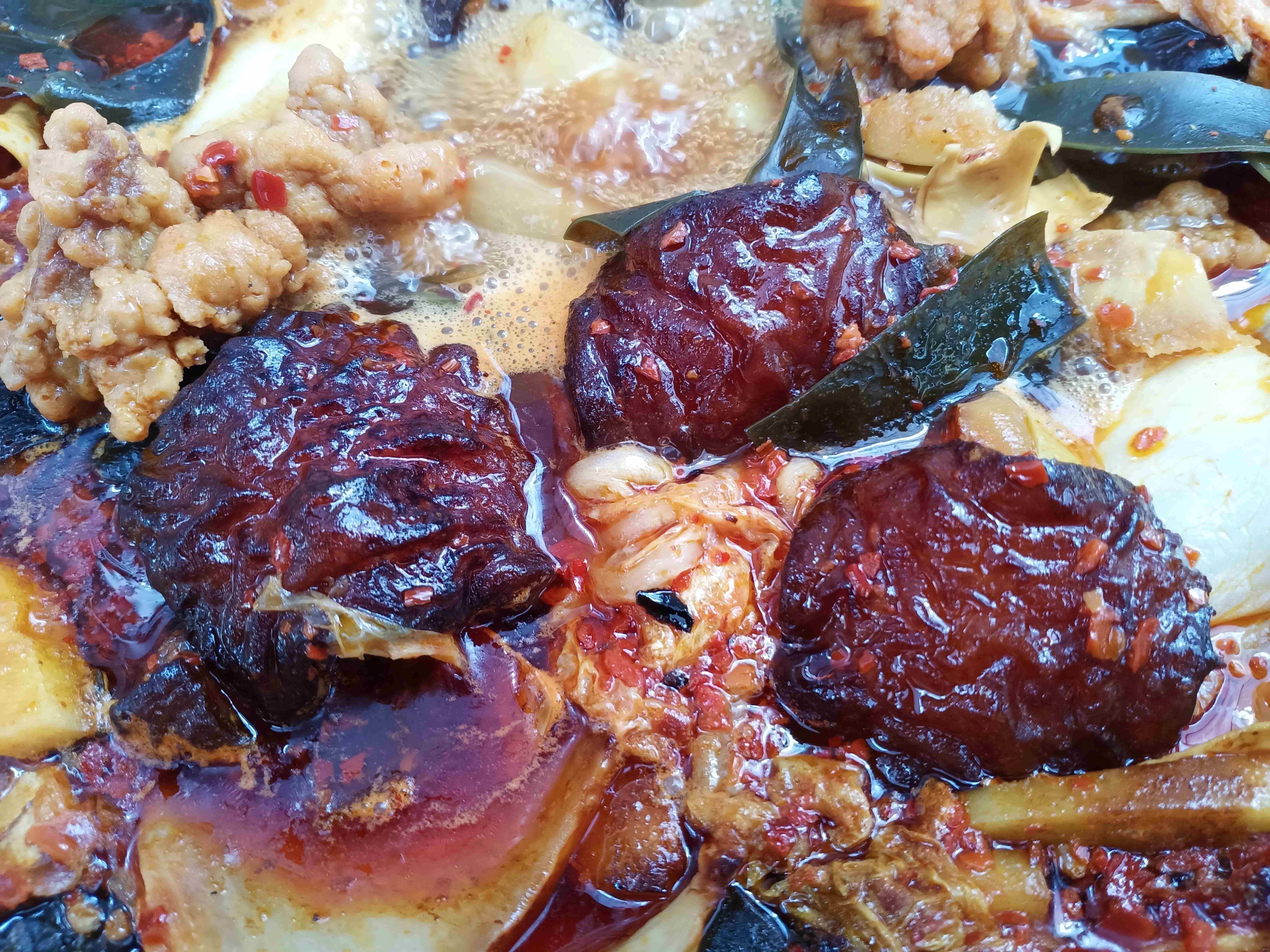但其实做好一锅宾川酸菜并不容易。现在宾川酸菜的主料都是用办理客事的传统主硬菜做主料,创新加上西红柿、酸木瓜等等,各家略有不同,但做法大同小异,风味主打一个开胃下饭。它的主要配菜,比如黑皮、酥肉都是要经过专门的制作厨艺制作加工的。简单的一道黑皮其实已经是一道宾川传统八大碗名菜之一种的全部制作厨艺了,酥肉也一样,但那是另一篇悠长的故事。因而宾川的酸菜它不只是一种简单的混合,那是宾川悠远历史中美食文化里生出的最奇绝明艳而又风味独特的,地方特色最为鲜明的一道大菜,它的鲜美和风姿绝不弱于宾川羊肉粉蒸和海稍鱼,它是宾川人基因里在寒冷冬天反而蓬勃生发的乡情,乡思和乡愁。也是冬天大理人对宾川最为垂涎的食欲,是云南横断山中最具独特风情的地方美食。