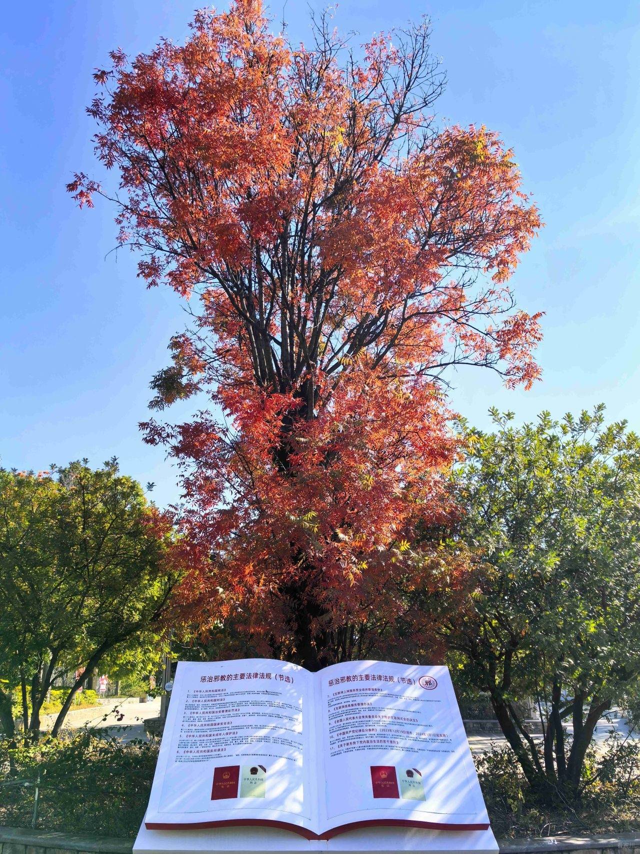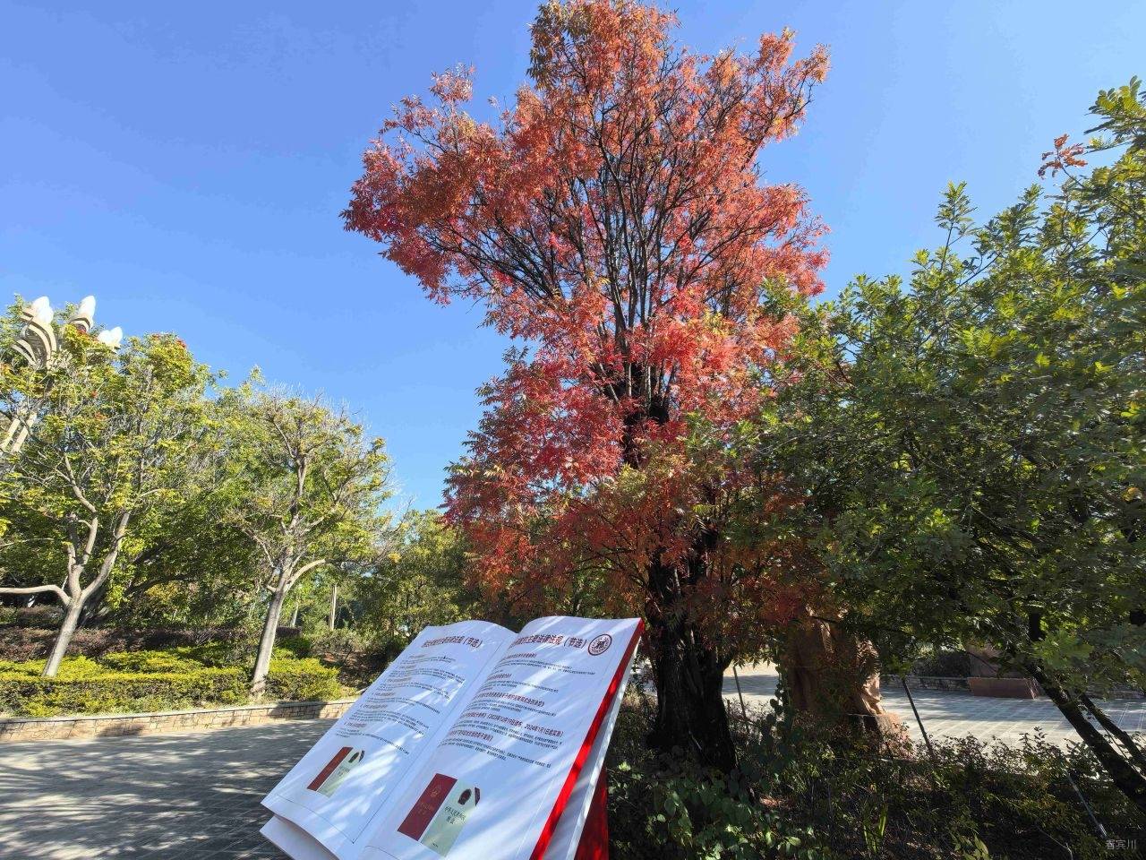 法治广场上的那株古树,是每年最先“红透”的存在。从树根到树间,枝干上的叶片红得热烈而纯粹,像一团燃烧的火焰,在晨光中格外惹眼。树下立着翻开书页的法治读本雕塑,灰白的石质书页与赤红的枫叶相映,竟生出一种奇妙的和谐——自然的热烈与人文的肃穆,在此刻完成了完美的交融。广场四周,彩林层层叠叠,红的、黄的、绿的树叶交织在一起,抬头望去,像是上帝打翻了调色盘,将最绚烂的色彩都泼洒在了这片天地。