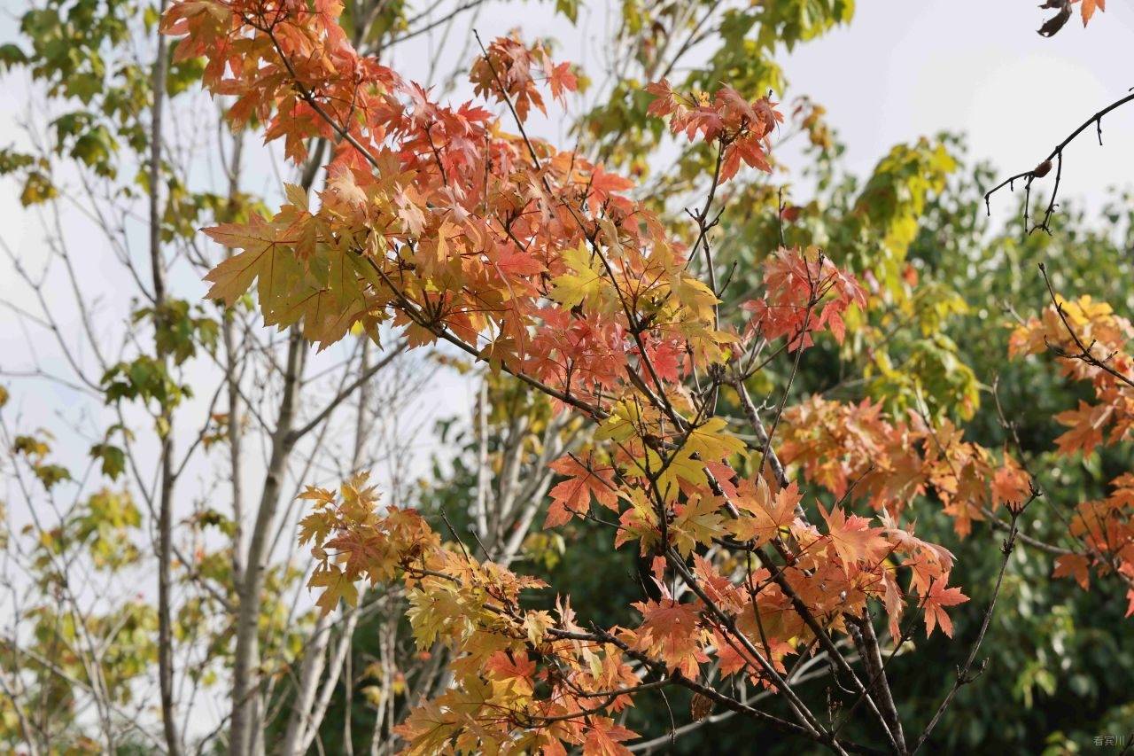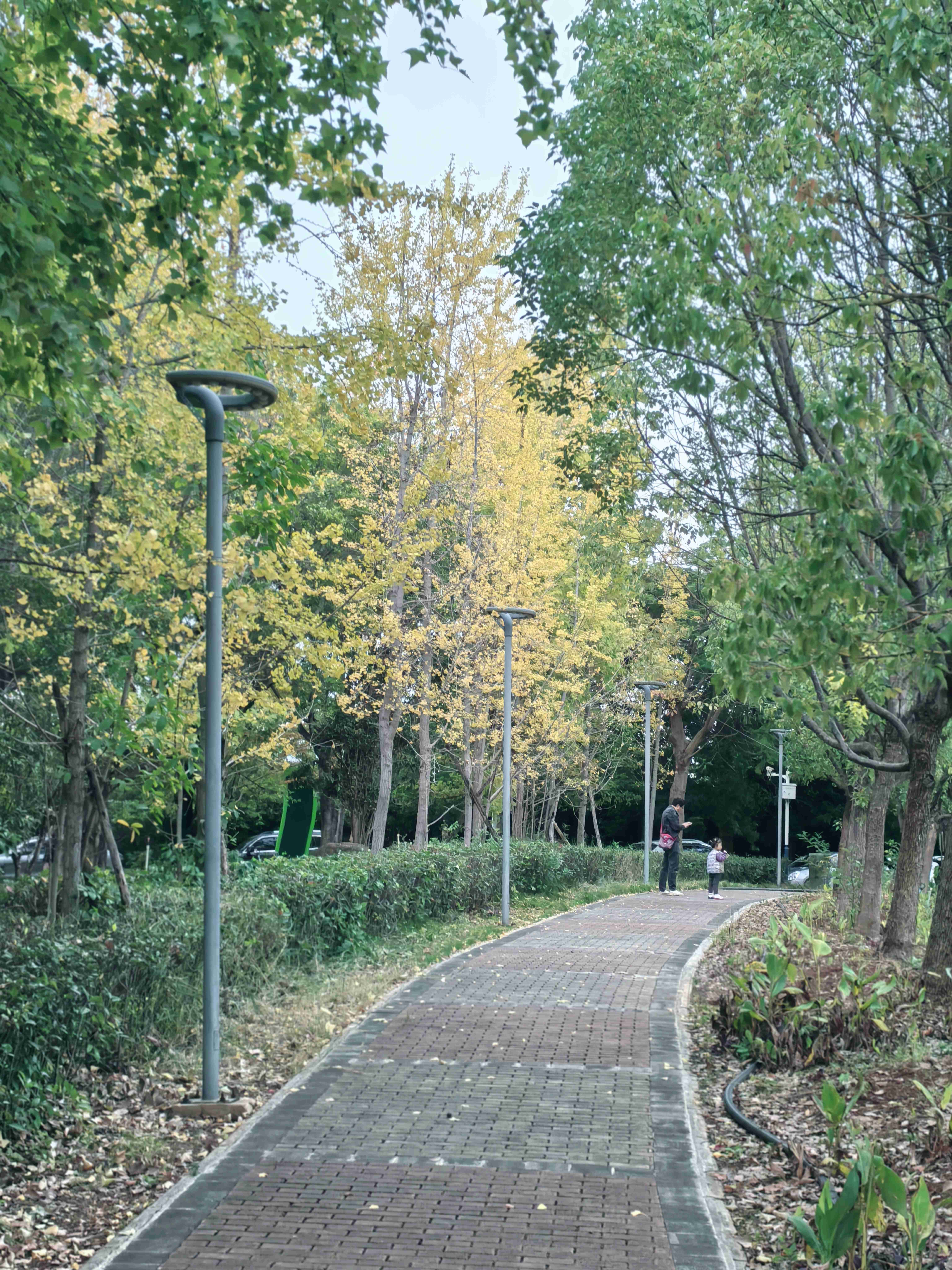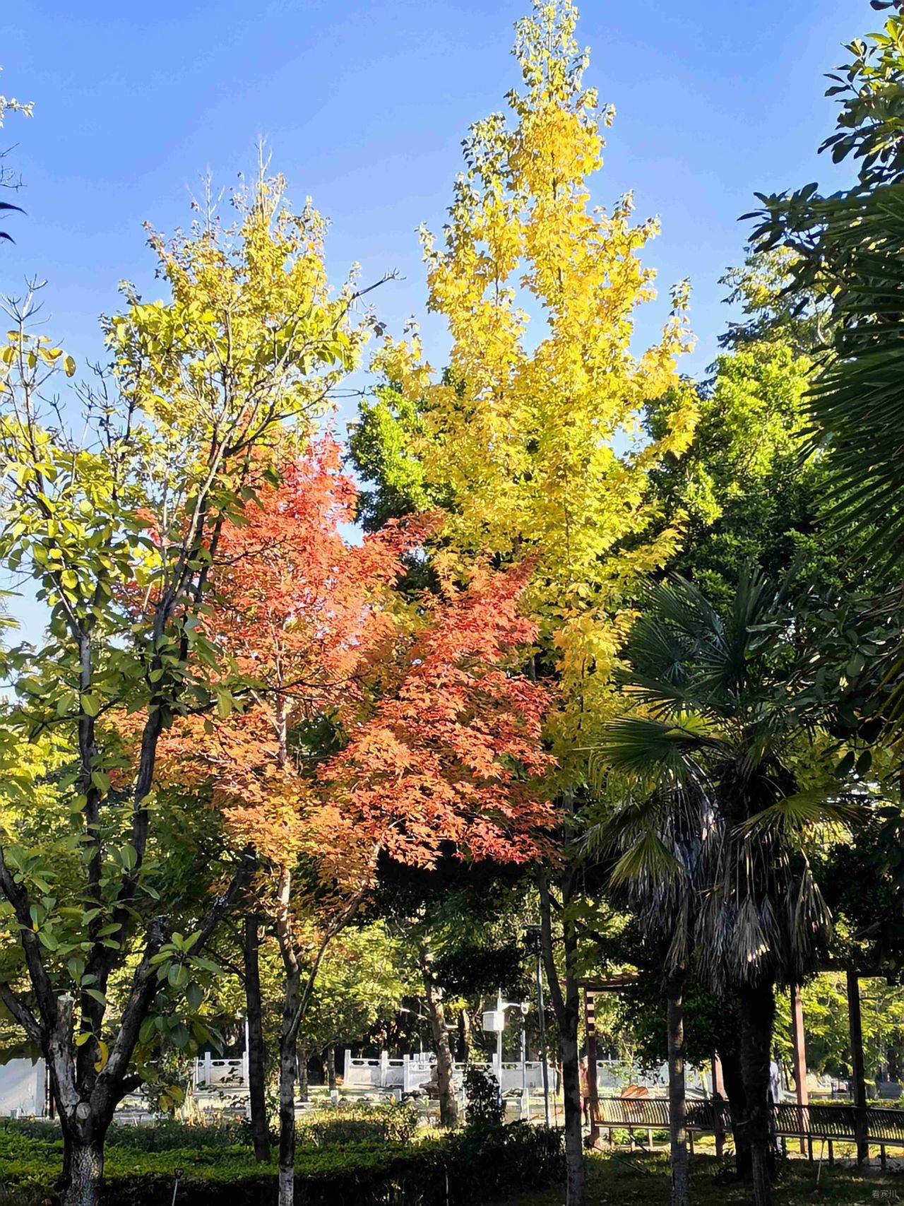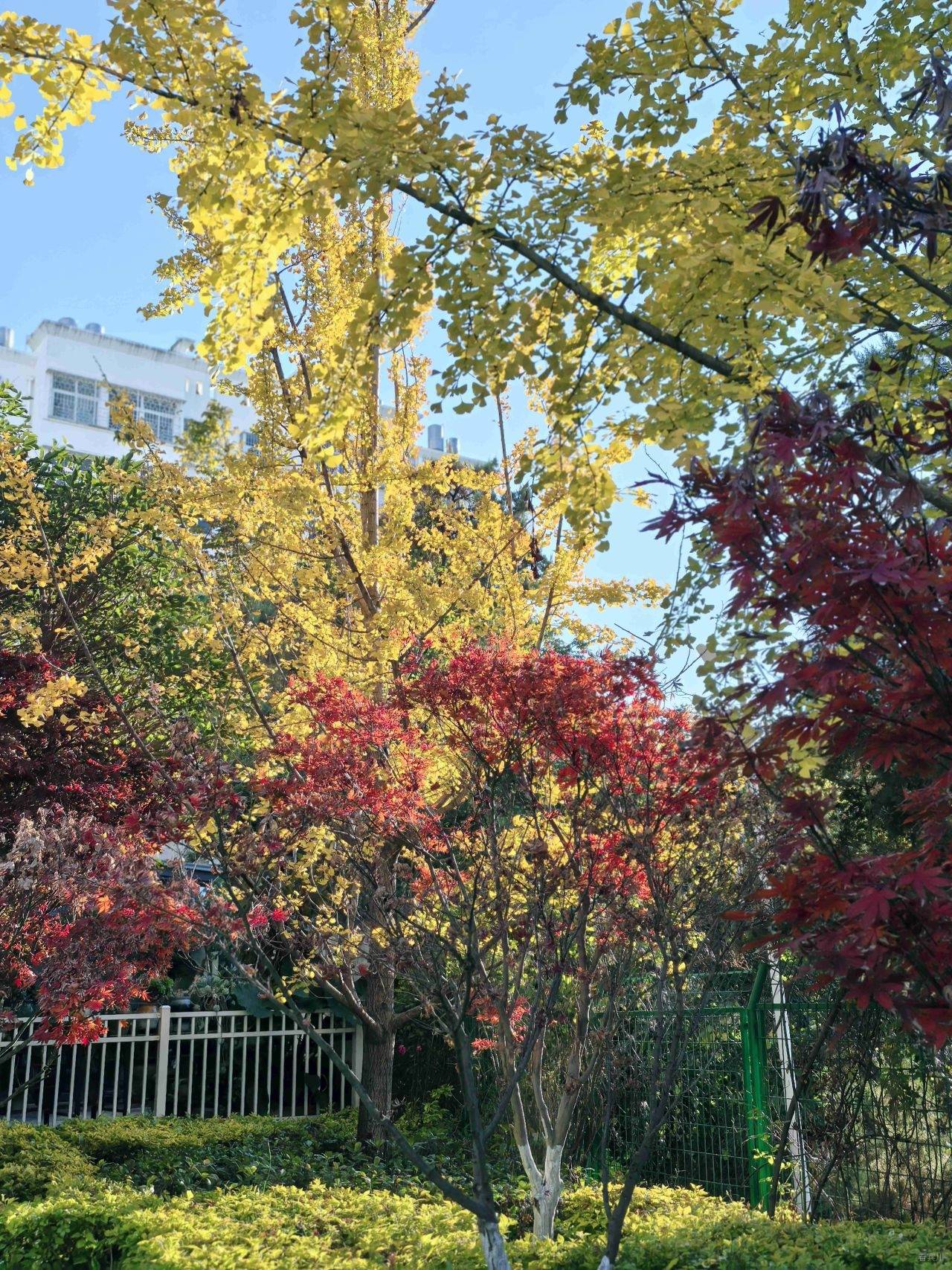 我沿着公园的步道慢慢走,才惊觉这里的绿化竟如此用心。各类树木高低错落、搭配规整,红枫的热烈、银杏的明媚、叶蓉的苍翠,还有不知名的灌木缀着橙黄的叶片,七彩斑斓的景致铺展开来,一步一景,景景如画。阳光渐渐升高,薄雾散尽,整个公园都亮堂起来,叶片上的露珠折射出细碎的光,像撒了满地的星星。