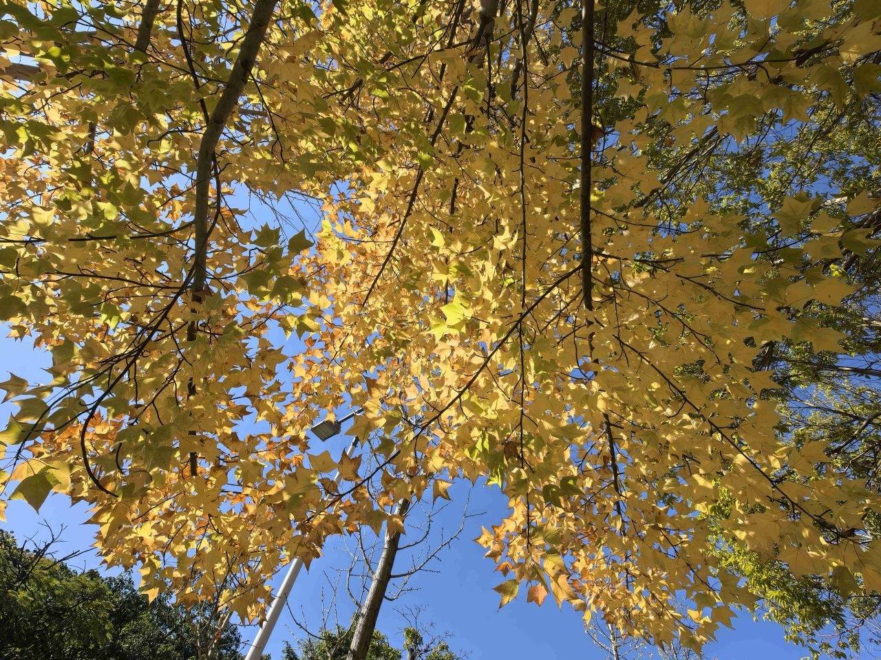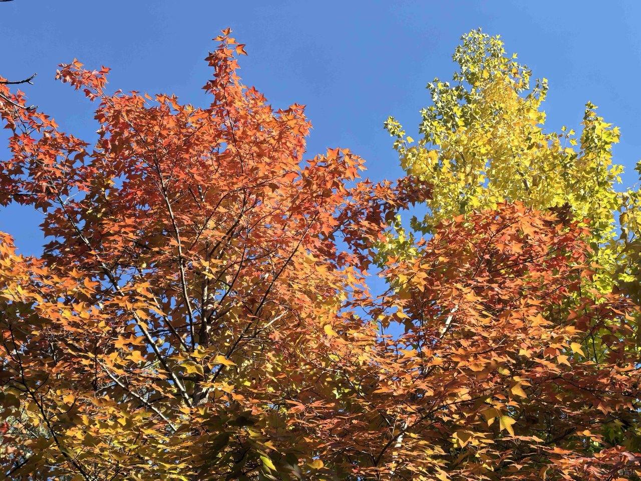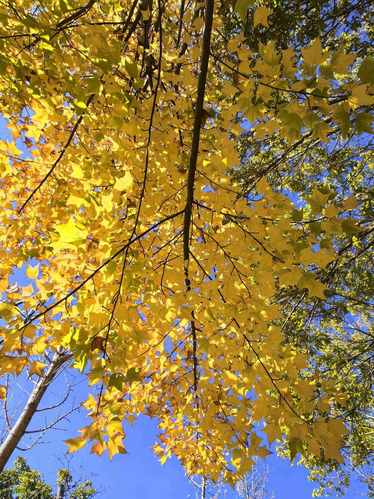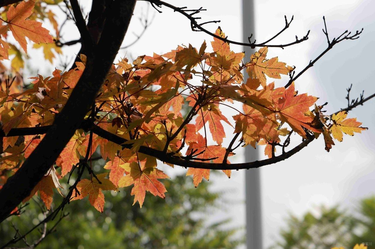 我沿着公园的步道慢慢走,才惊觉这里的绿化竟如此用心。各类树木高低错落、搭配规整,红枫的热烈、银杏的明媚、叶蓉的苍翠,还有不知名的灌木缀着橙黄的叶片,七彩斑斓的景致铺展开来,一步一景,景景如画。阳光渐渐升高,薄雾散尽,整个公园都亮堂起来,叶片上的露珠折射出细碎的光,像撒了满地的星星。