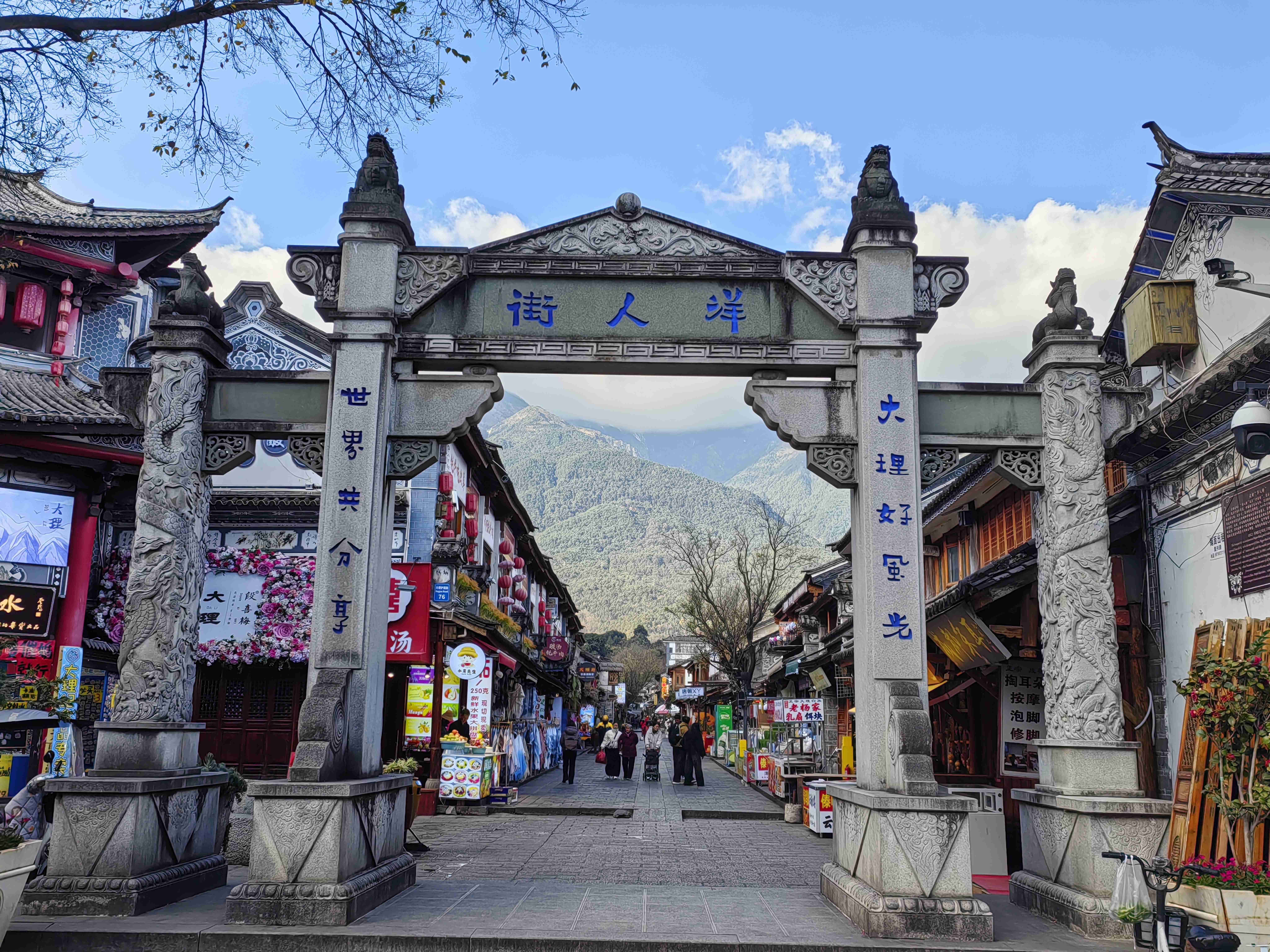 一路走走停停,红龙井畔人流如织,溪水潺潺,岸边垂柳依依,不少游人在此驻足休憩,享受着片刻的宁静。洋人街依然繁华,咖啡馆、西餐厅与传统小吃店相邻,金发碧眼的游客与本地居民擦肩而过,语言不同,笑容却同样真诚。街口的石牌坊上“大理好风光,世界共分享”几个大字格外醒目,恰如其分地诠释了这座古城的包容与魅力。