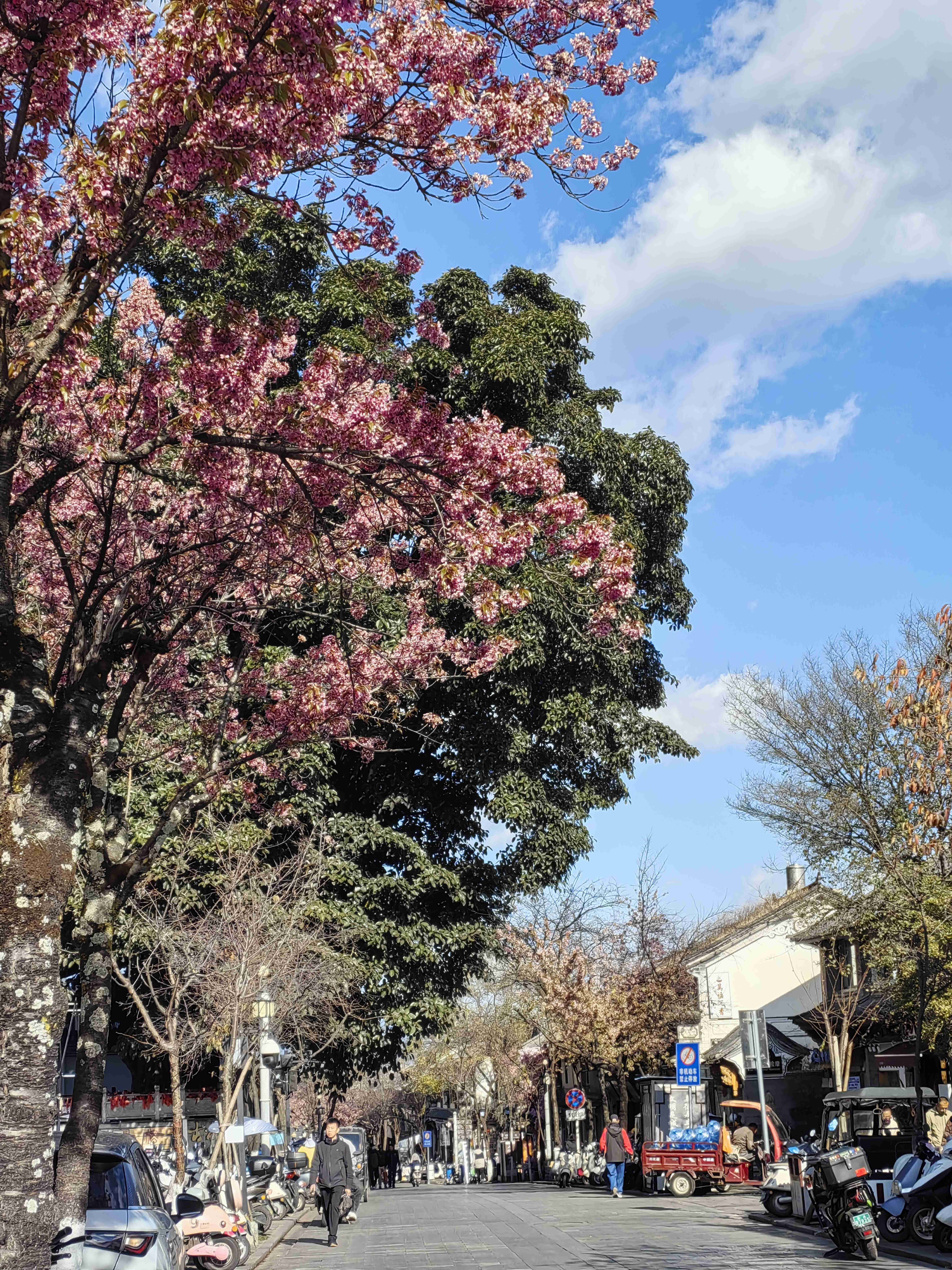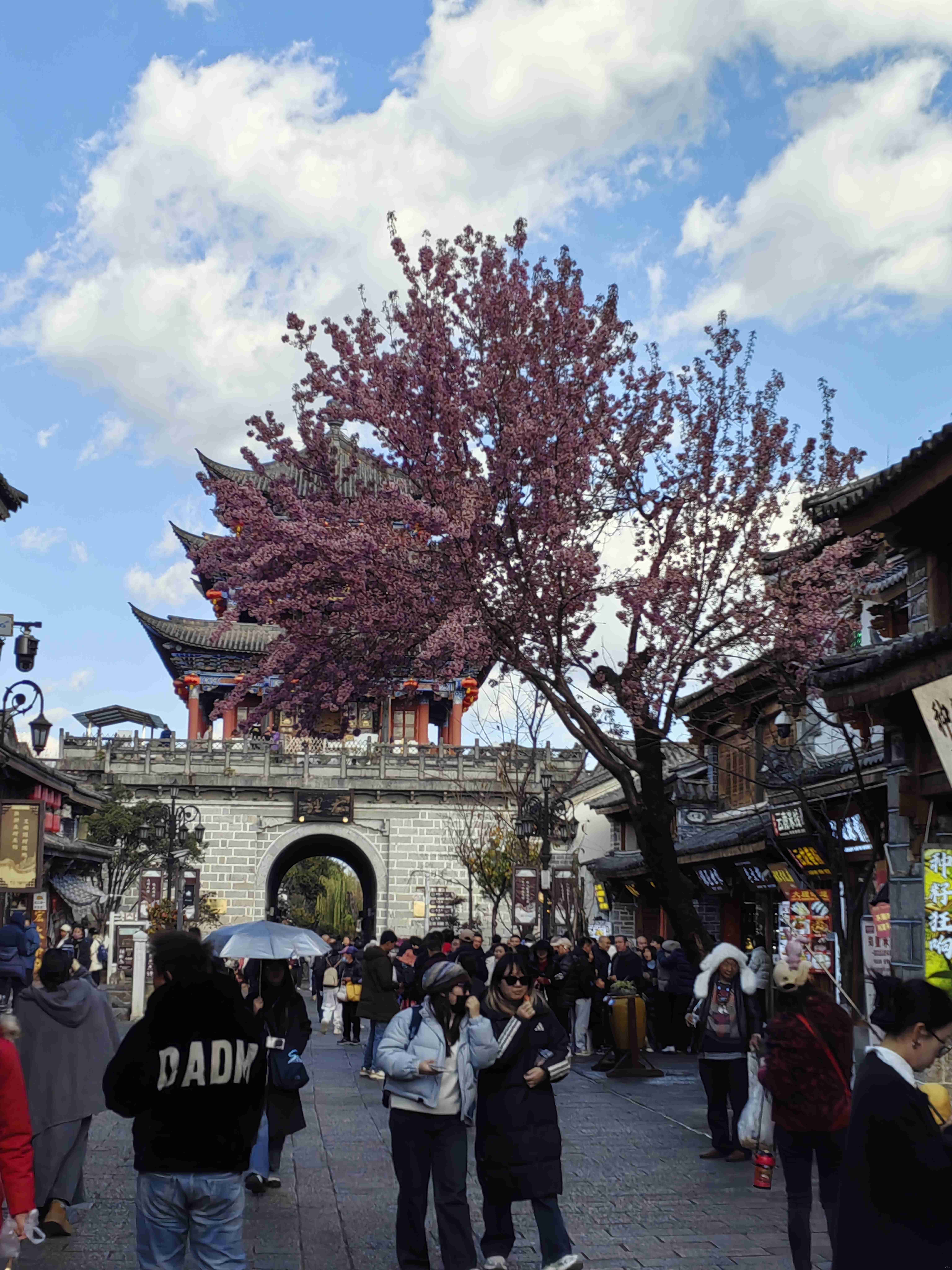 踏入南门,青石板路蜿蜒向前,被千百年来的脚步磨得温润光滑。路两旁的冬樱花盛开,花树下的店铺鳞次栉比,门窗精巧,挂着五颜六色的幌子,随风轻轻摇曳。店内商品琳琅满目,新式文创产品与传统手工艺品相映成趣:包装精美的乳扇、鲜花饼散发着香甜,色彩斑斓的扎染布随风飘动,银匠师傅正专注地敲打着手镯,叮当声清脆悦耳。身着民族服饰的店员热情招揽着顾客。