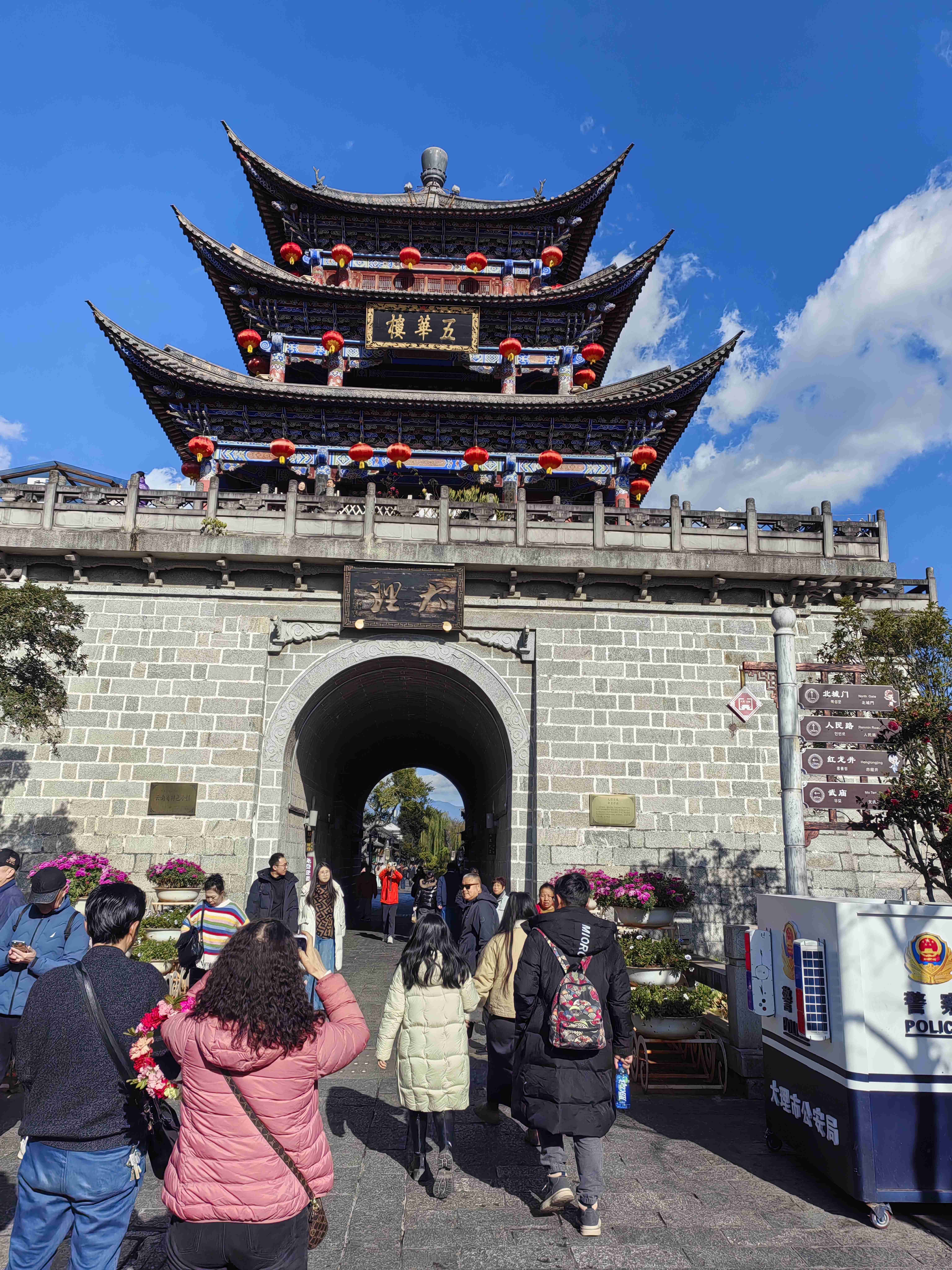 车子驶出下关往北方向前行,不多时,大理古城的南门便撞入眼帘。青灰色的城墙巍峨矗立,历经岁月洗礼的砖石纹路里,藏着说不尽的故事。“文献名邦”四个鎏金大字高悬城头,笔力遒劲,在阳光下熠熠生辉,瞬间点明了这座古城的文脉底蕴。城门前游人如织,相机快门声、孩童的嬉笑声、商贩的吆喝声交织在一起,热闹却不喧嚣,反倒添了几分鲜活的烟火气。