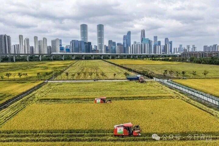 2025年10月21日,收割机在浙江省杭州市萧山区世纪田园粮食功能区的稻田里收割水稻,远处高铁列车飞驰而过(无人机照片)。新华社记者 徐昱 摄