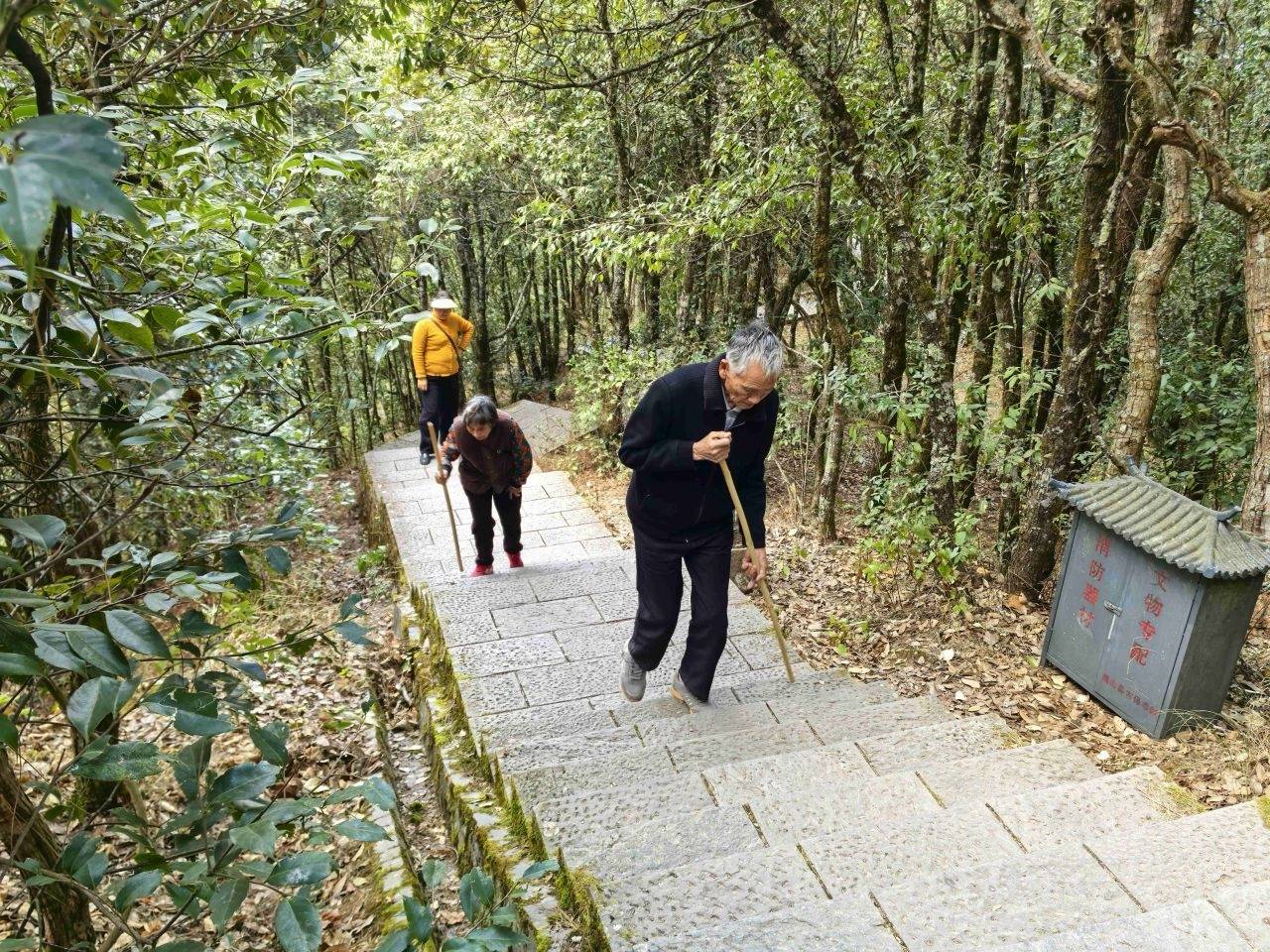 刚进山门,路边堆放着一捆捆竹竿拐棍,粗细适中,正是二老登山所需。我精心挑选两根,正准备付钱,一位年轻姑娘笑着走过来说,这是公益服务,只需扫码交5元押金,下山归还即可全额退还。暖心之举,让一路奔波的疲惫烟消云散,老父亲更是心情大好,笑容满面。