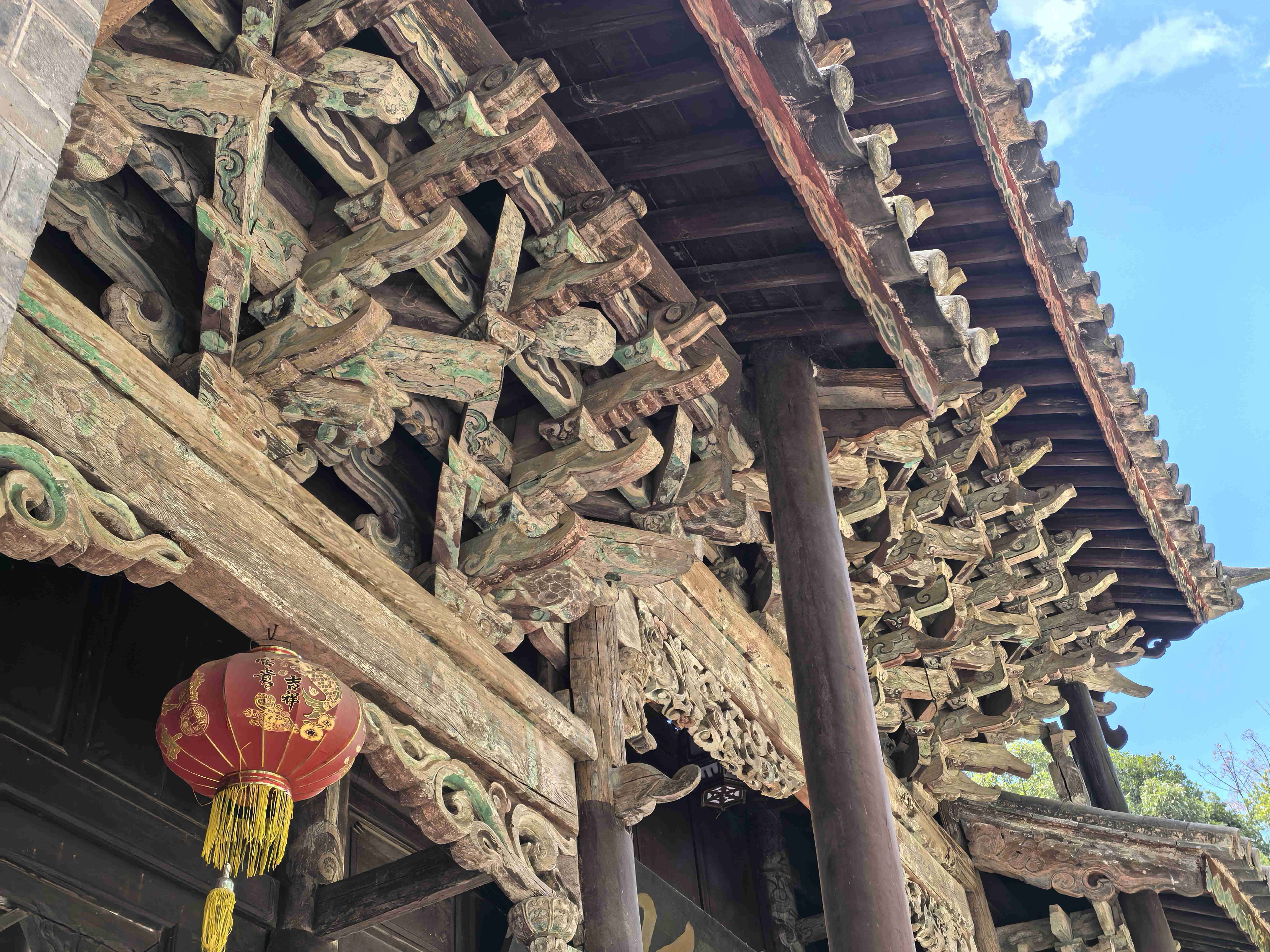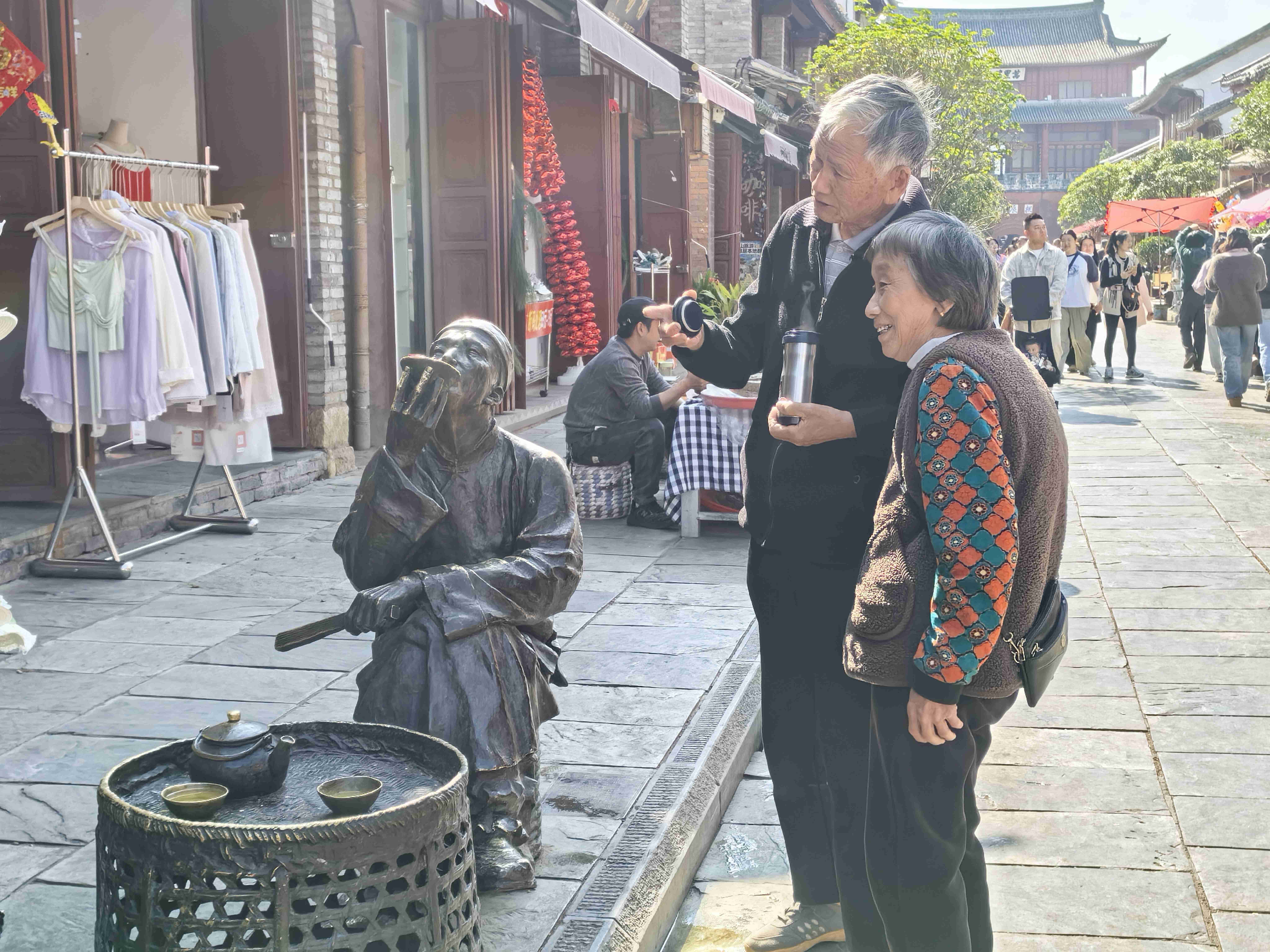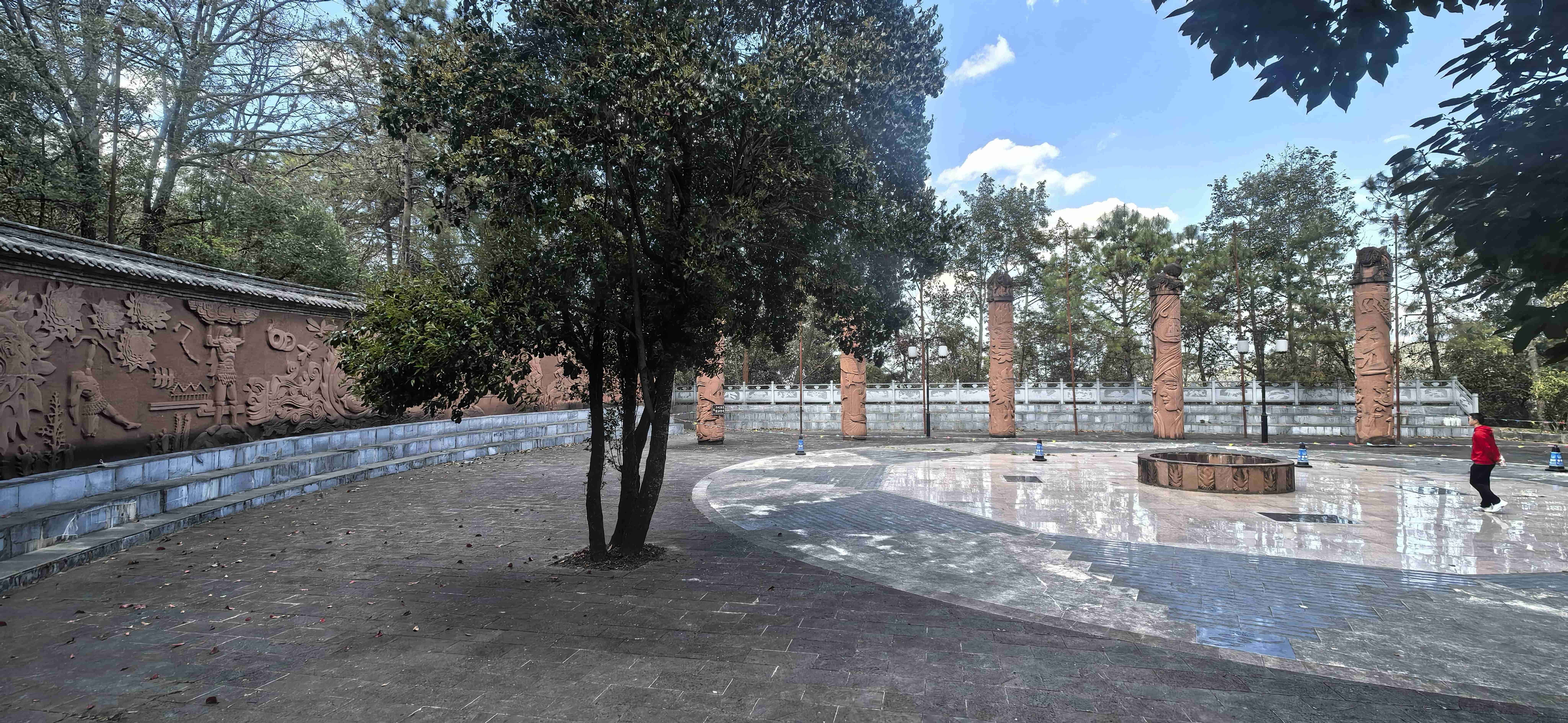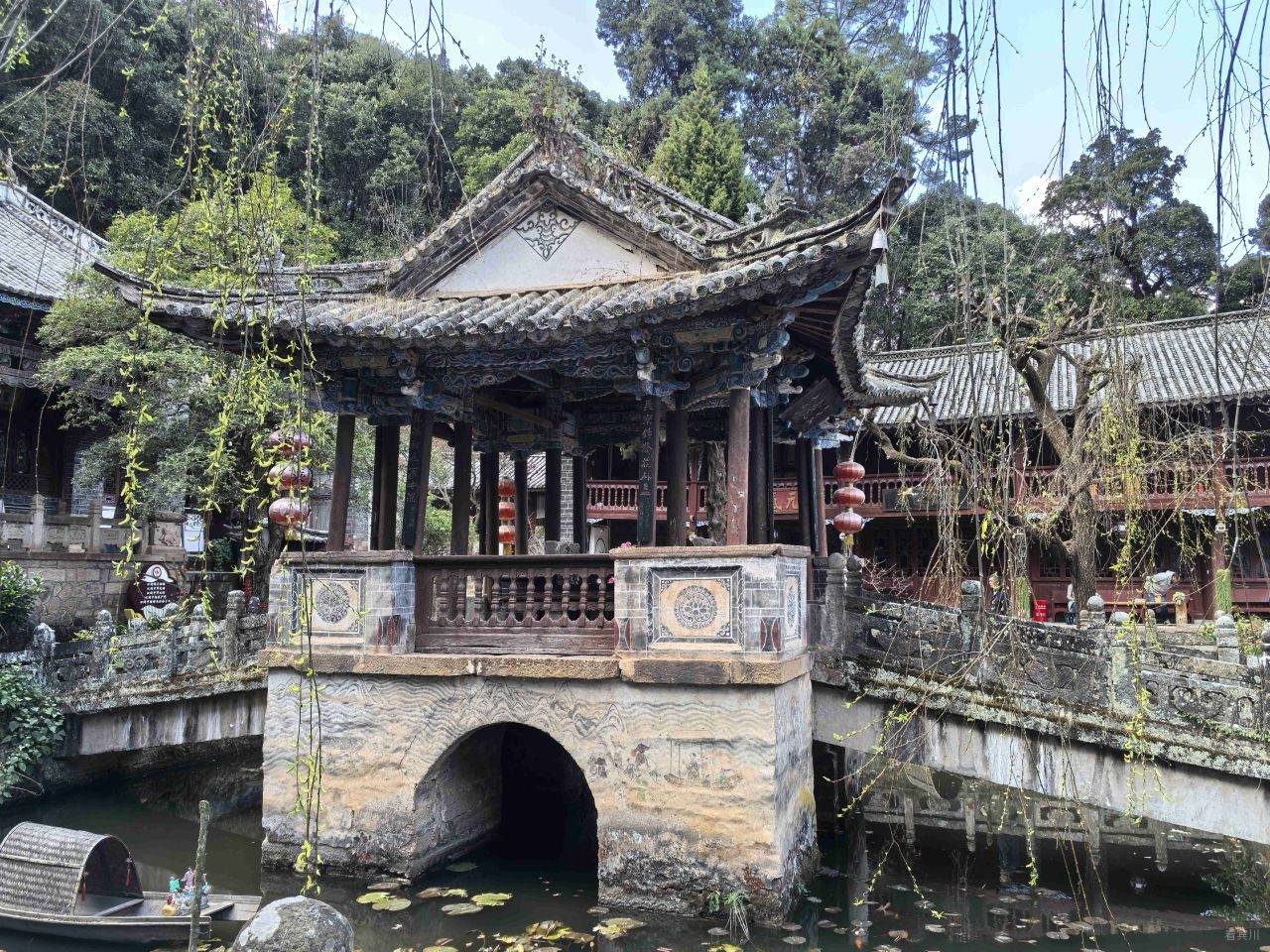继续前行,游览文昌宫,父亲被宫前一片苍劲古树深深吸引。我一边搀扶,一边轻声介绍:巍宝山是国家级森林公园、国家AAAA级旅游景区,主峰海拔2509米,山中古木参天,浓荫蔽日,尤其是千年高山栲群落,是生态保护的珍贵杰作。文昌宫内,清代壁画《松下踏歌图》生动再现了彝族打歌的热闹场景,是民族文化的珍贵遗存。