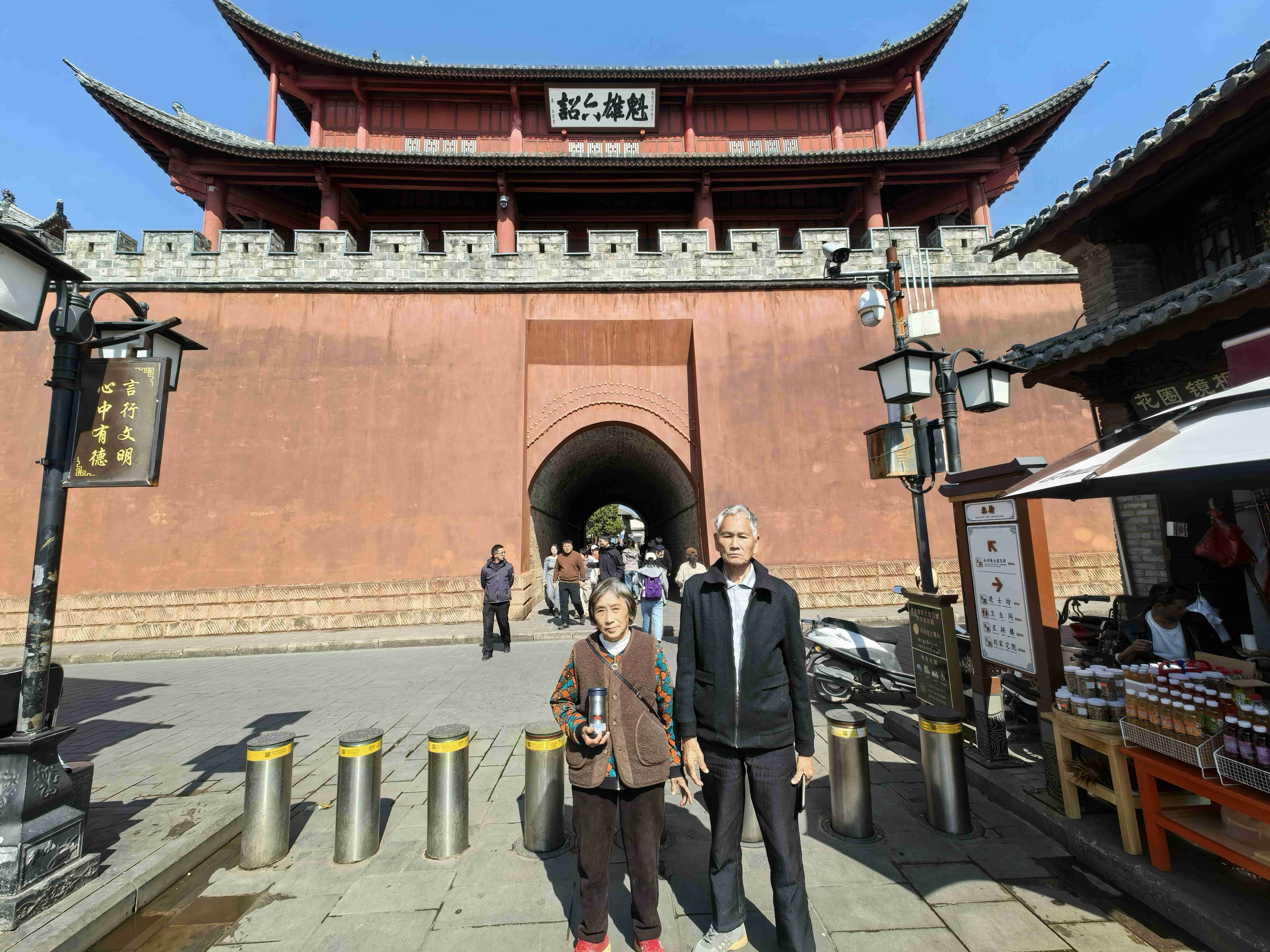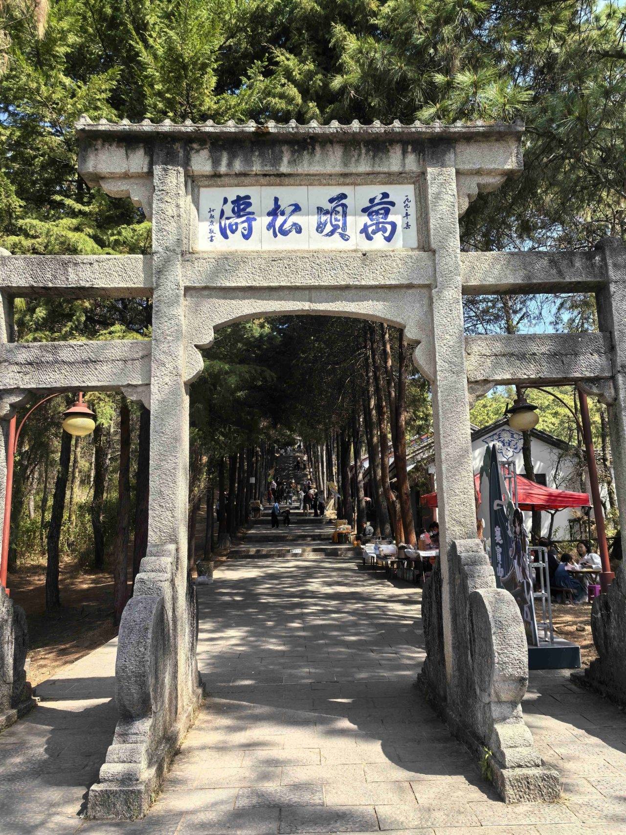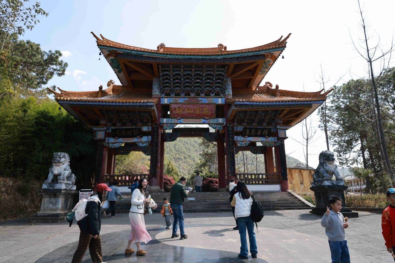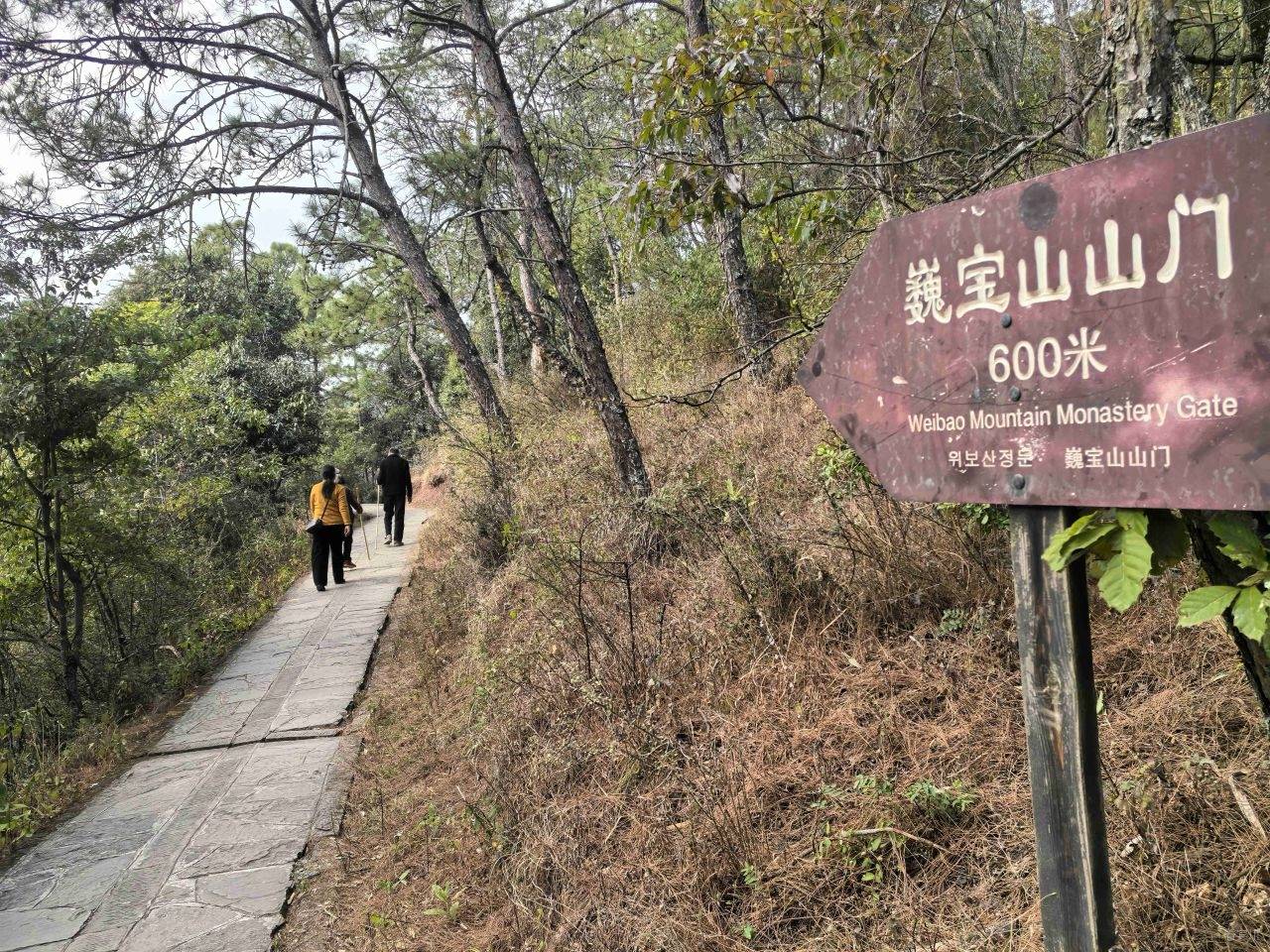 盘山公路弯多而急,路面虽好,母亲却渐渐有了晕车之感。所幸,巍宝山山门牌坊已近在眼前。下车后,我们在游客服务中心稍作休息,补充食物与体力,母亲的不适慢慢消散,精神也好转起来,登山的决心,依旧坚定。