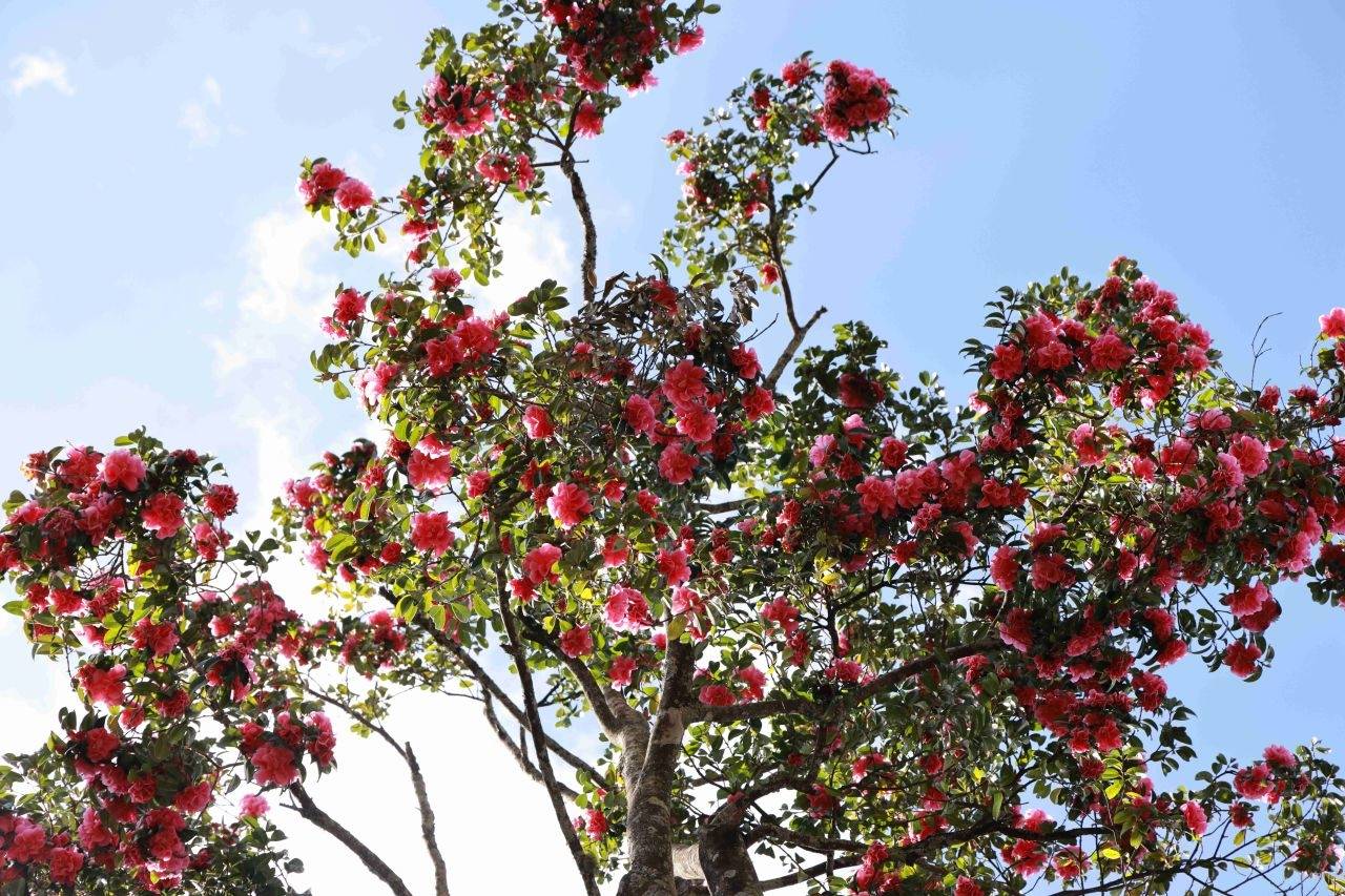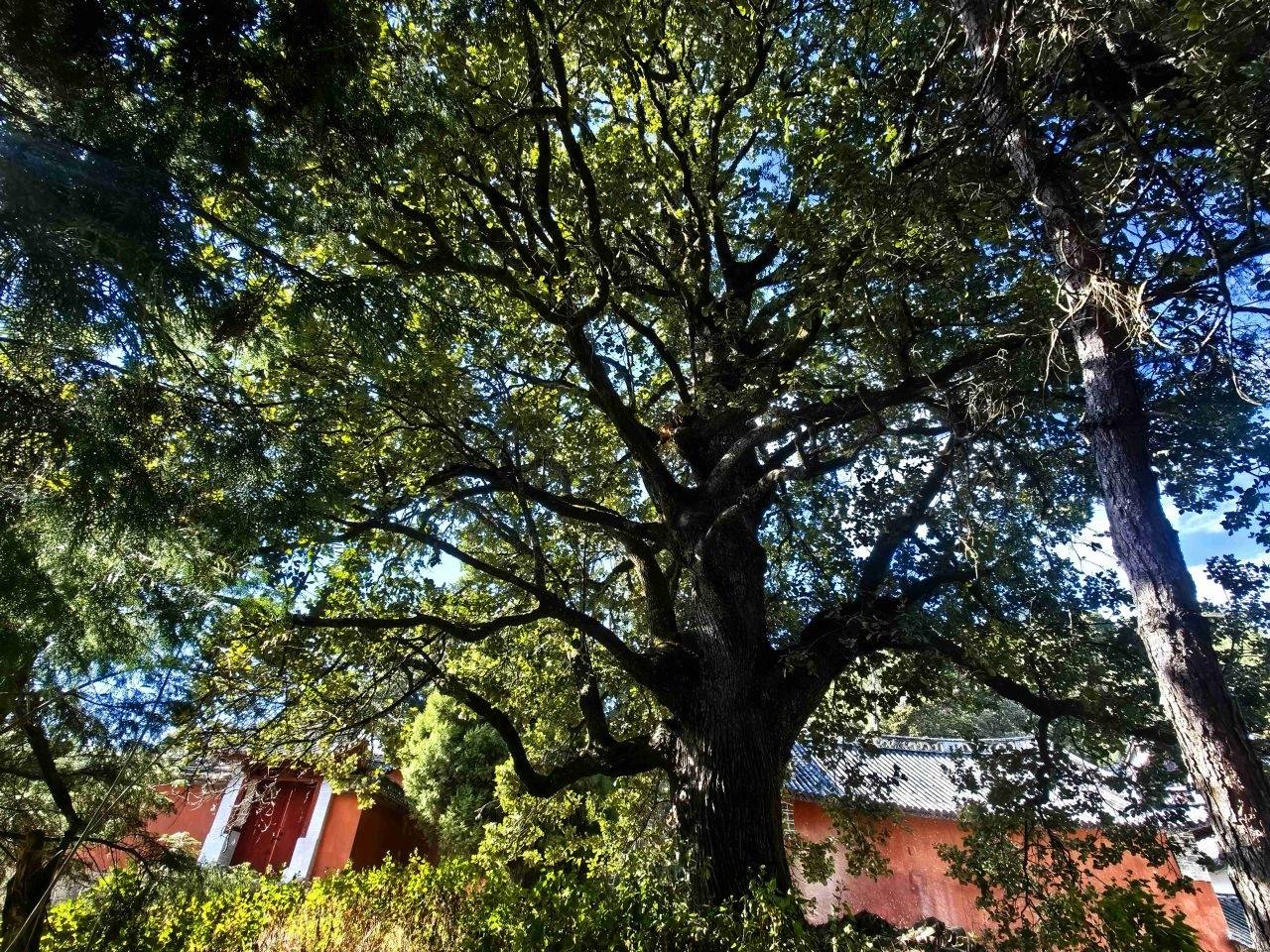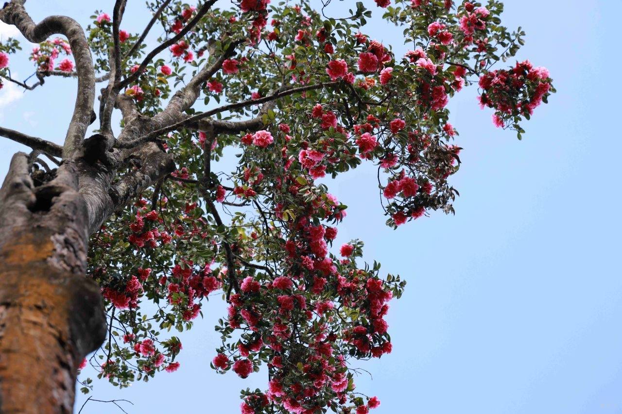 我一直以为,巍宝山的古茶花藏于大小寺,直到走进灵官殿,才惊喜地发现,飞檐翘角之间,一株高大古茶花傲然挺立,花开正艳。阳光下,满树银红,耀眼夺目。这株茶花为桂叶银红,树龄400多年,树高18.43米,胸径39.6厘米,2012年获评上海大世界吉尼斯纪录,被誉为“中国人工栽培最高的山茶花树”,曾得到国际茶花协会专家的高度赞誉,一树芳华,名动四方。