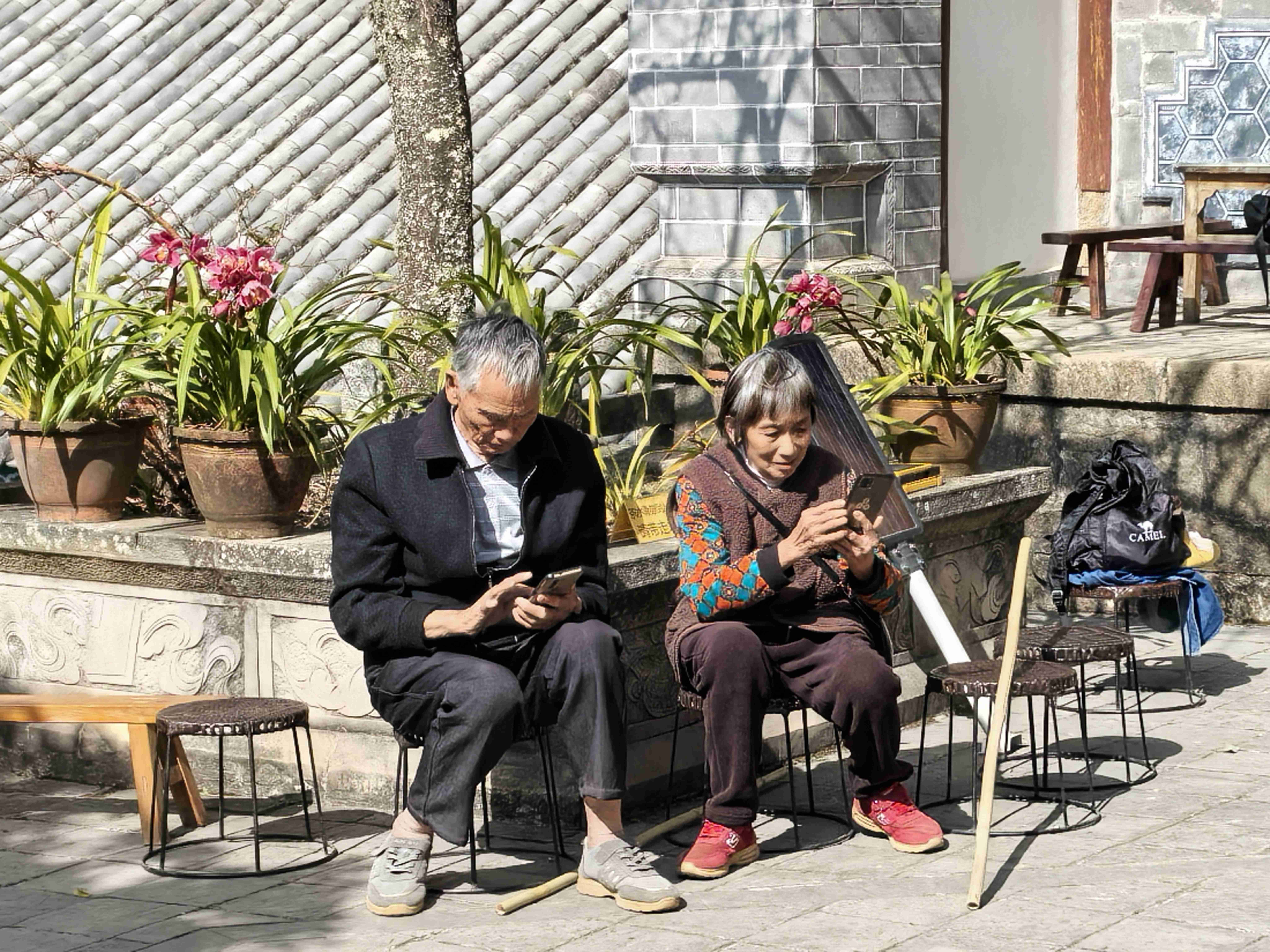 斗姥阁雄踞巍宝山顶,石阶陡峻,父母执意不要搀扶,一步一步,稳稳向上,终于踏上大殿平台。观中师傅备有解暑解渴的糊米茶和座椅。二老坐定,喝着热茶,望着满山风光,脸上露出释然与欣慰的笑容。两位老人相加已是162岁,历经山路崎岖,终于完成了多年的心愿。他们拿出手机,开心地拍照留念,谈笑风生。