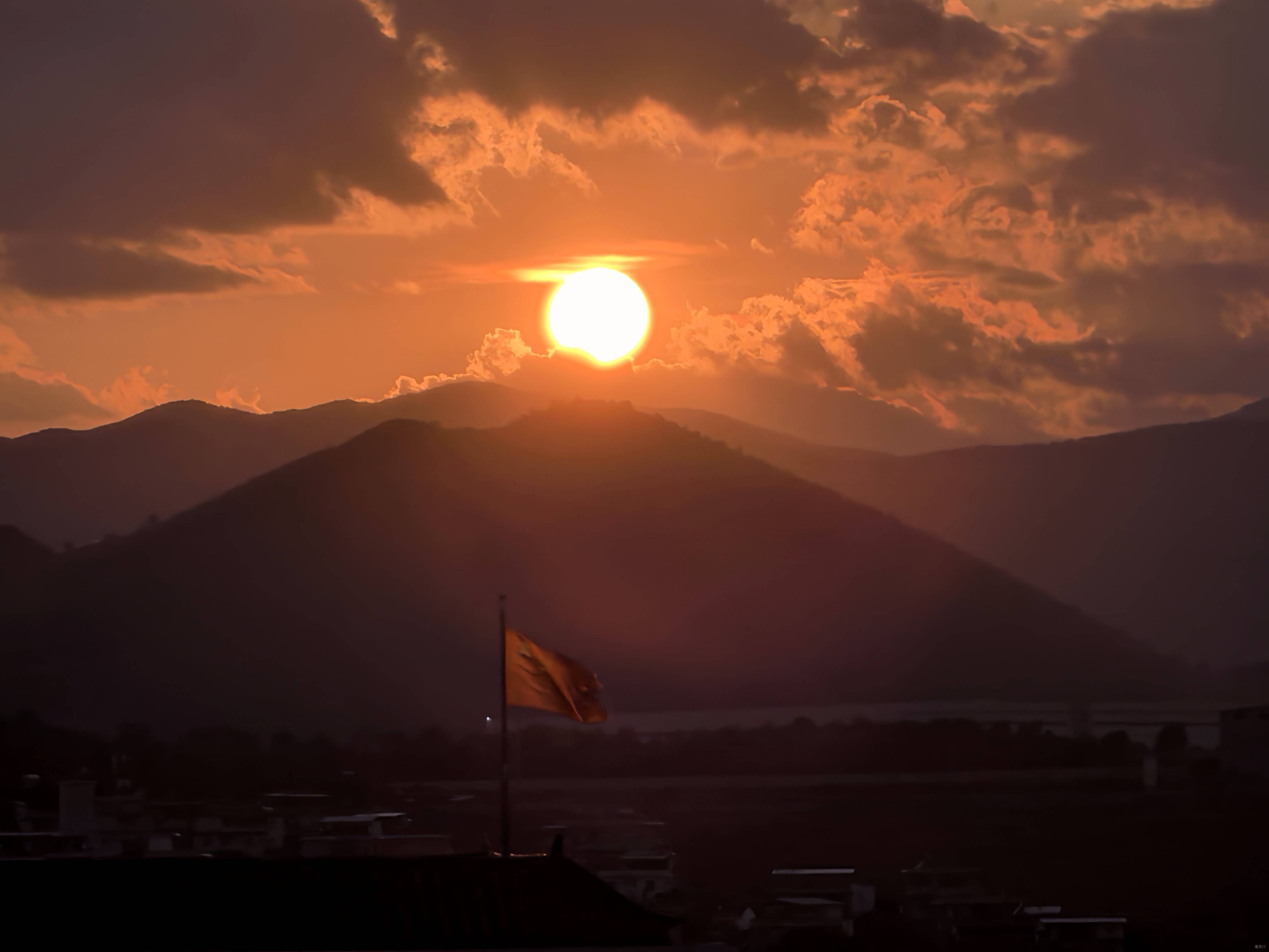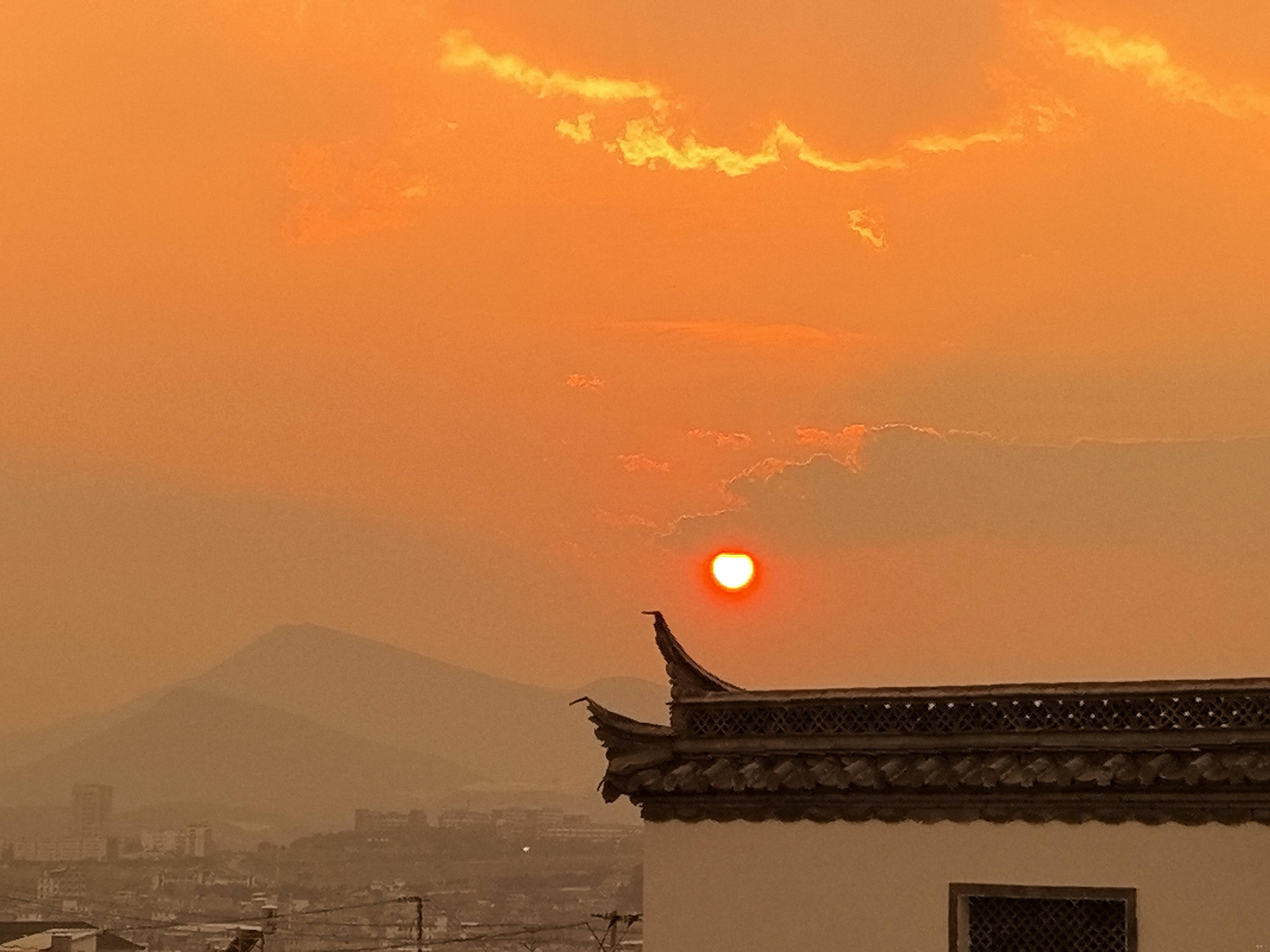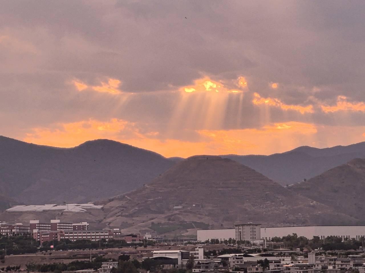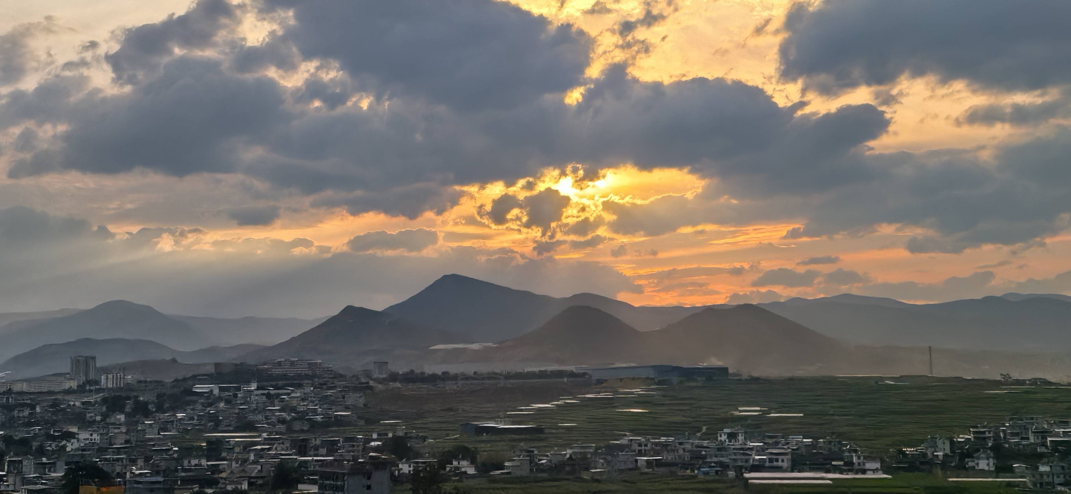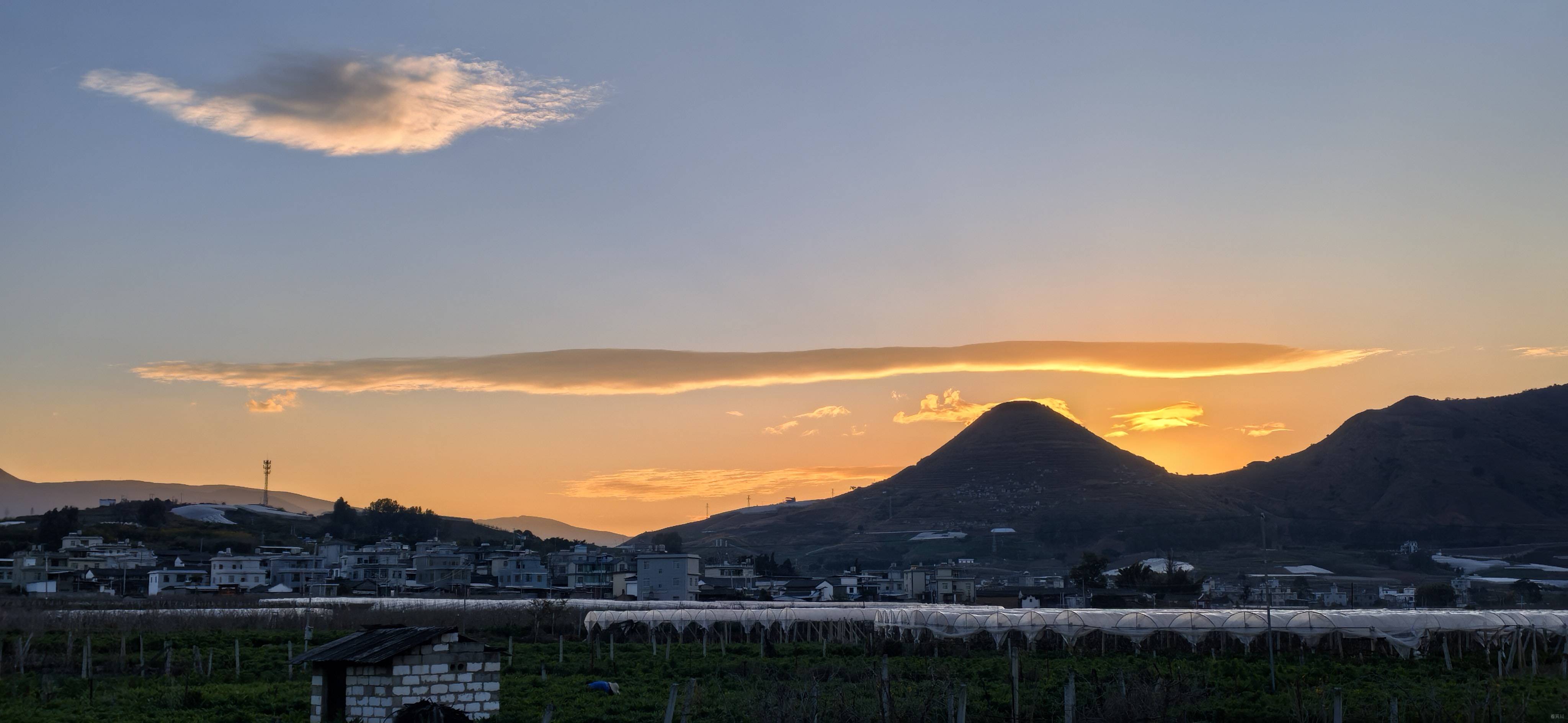 当日暮西垂,落日余晖洒满大地,彩霞漫天飞舞,红的似火,粉的如霞,紫的若纱,将睡美山笼罩在一片温柔的光晕里。那静卧的身姿愈发清晰:长腿舒展,直抵鸡足山下,与名山相映;头颅轻枕金甸小山,脸庞微微仰起,长长的“秀发”飘逸舒展,延伸至杨公箐深处;高高隆起的双乳,圆润饱满,彰显着少女的灵动与成熟,美得令人窒息。半山腰上,谷王庙小巧玲珑,青砖黛瓦,隐于光影之间,宛若少女肩头斜挎的小拎包,添了几分灵动与雅致,也藏着当地人对美好生活的期许。