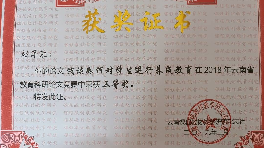 赵泽荣爱岗敬业,他的付出,也得到了实至名归的荣誉。他所教班级成绩优异,曾多次获得各级党委政府的表彰奖励。他也先后被评为 “优秀教师”、 “先进教育工作者”,还被大理州评为大理州乡村学校从教15年以上优秀教师。