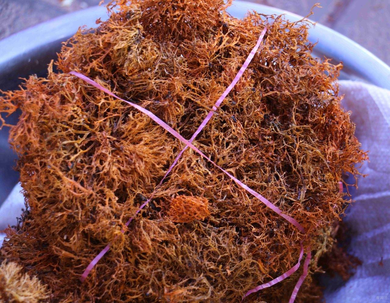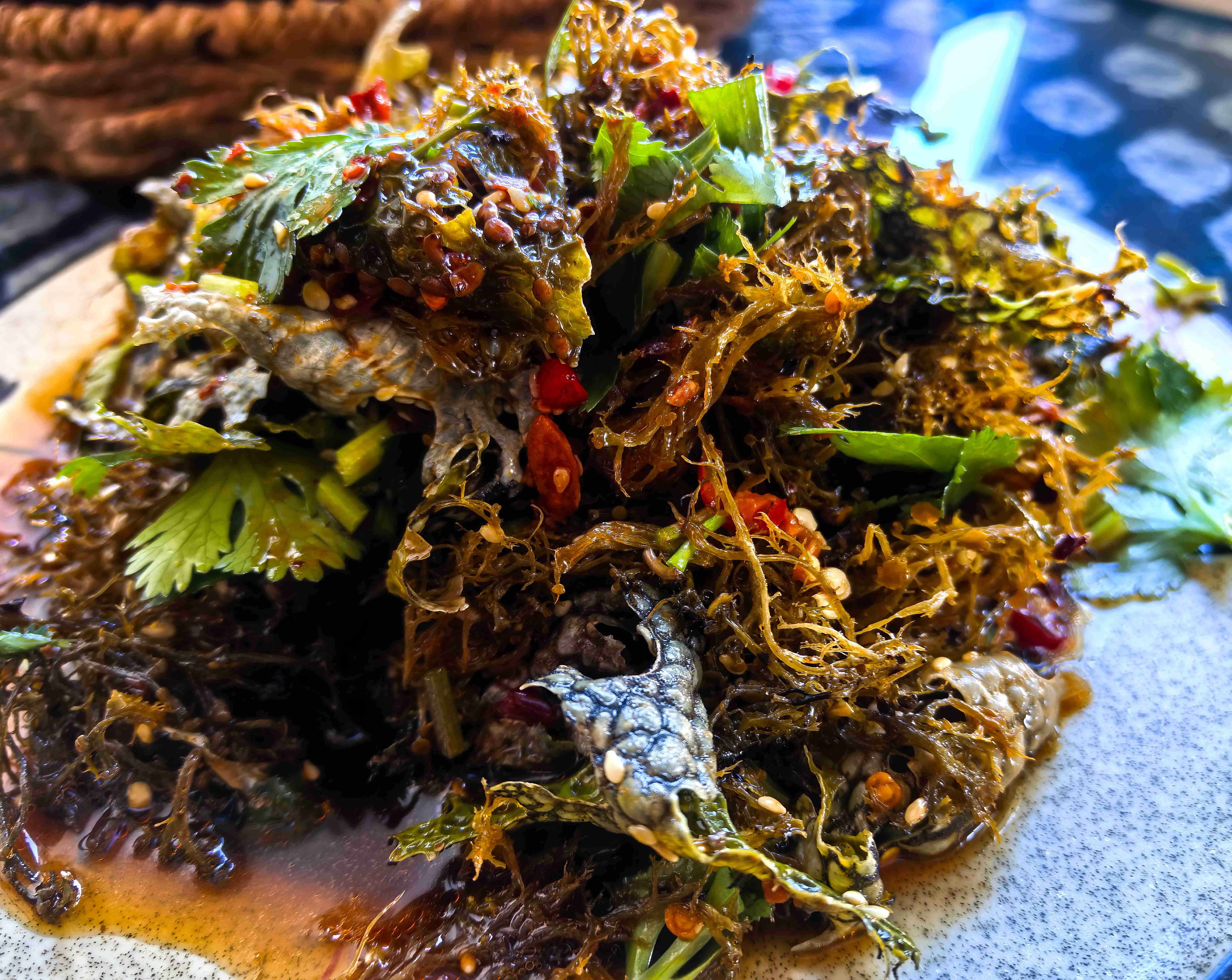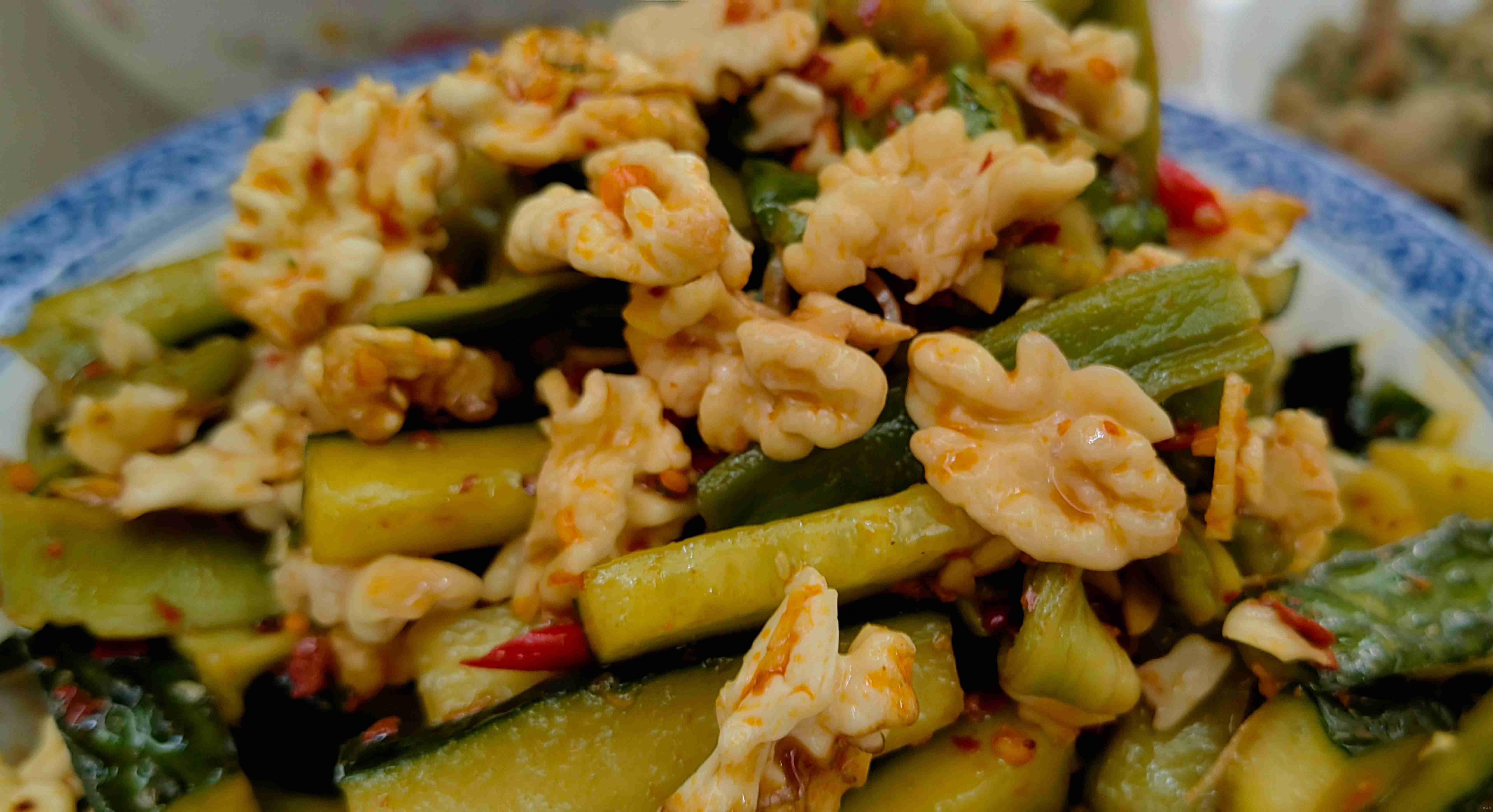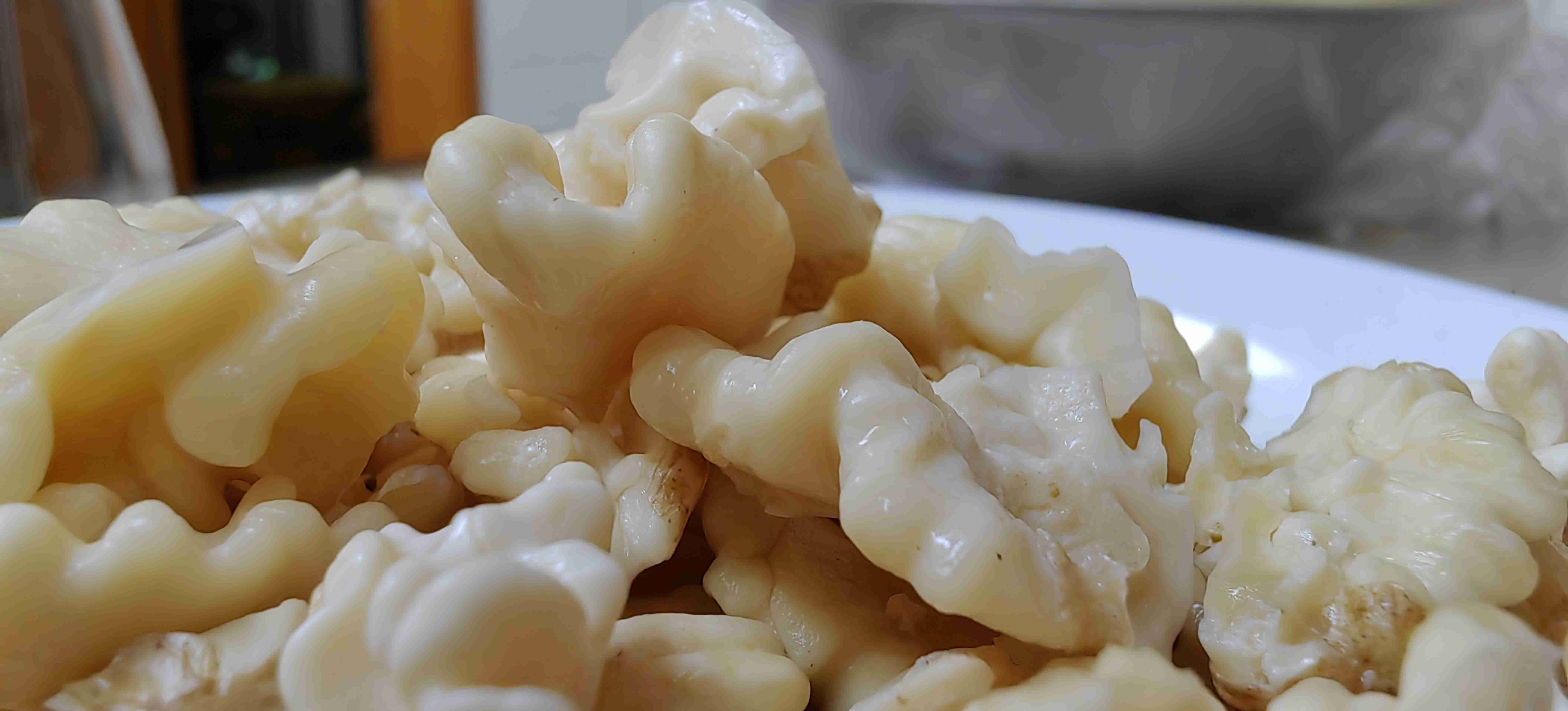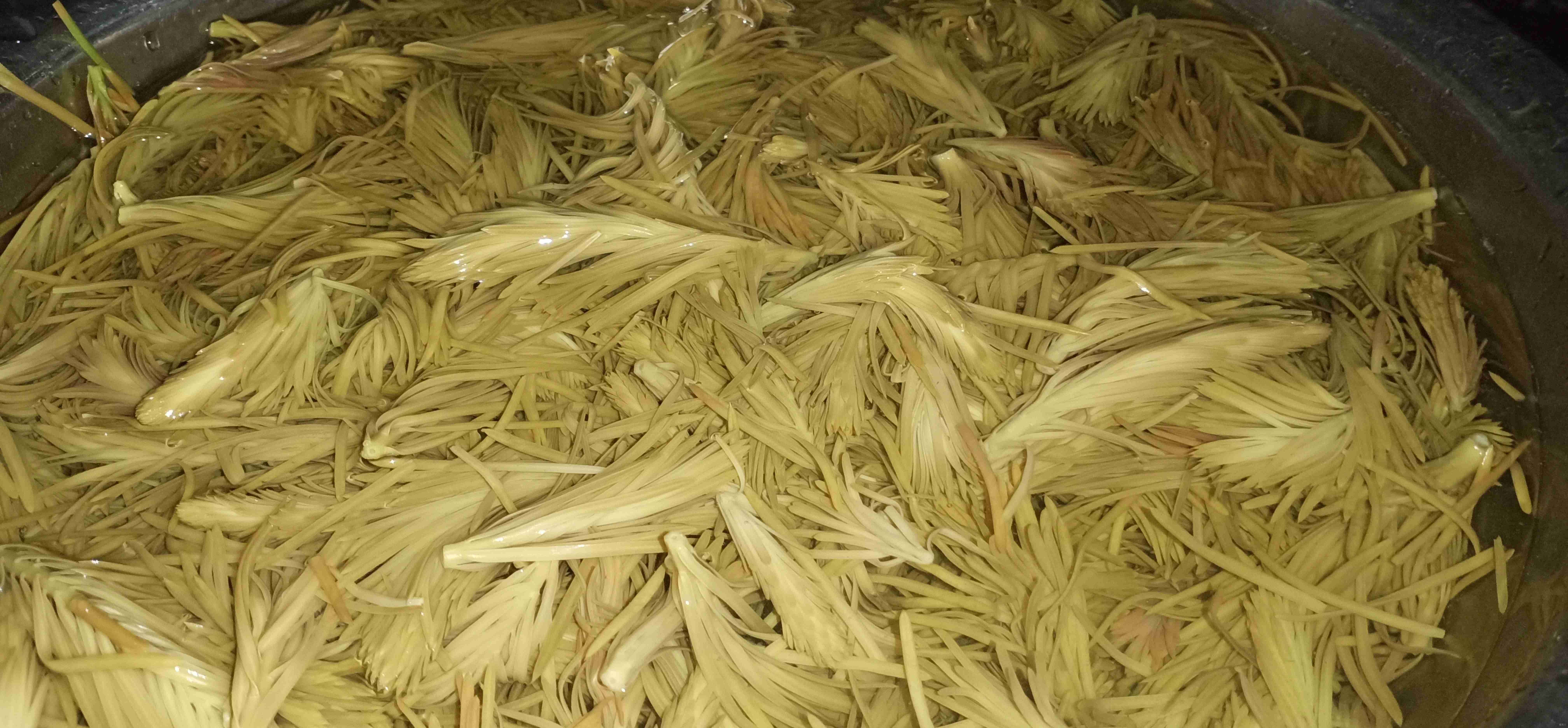 除了沙松尖,凉拌树花更是彝山凉拌菜中的一绝。树花又名“树胡子”,是生长在老树树干上的地衣植物,形似灰绿色软毛,攥在手中绵软蓬松,宛如迷你毛线衣。制作这道菜,清洗处理是关键,需先挑拣出树花中的树皮碎和泥土,再烧一锅加了碱面或柴火灰的沸水,将树花放入煮十分钟,原本灰绿的树花会逐渐变成金红色,手感也愈发软和,碱水既能提亮色泽,也能去除其本身的涩味。