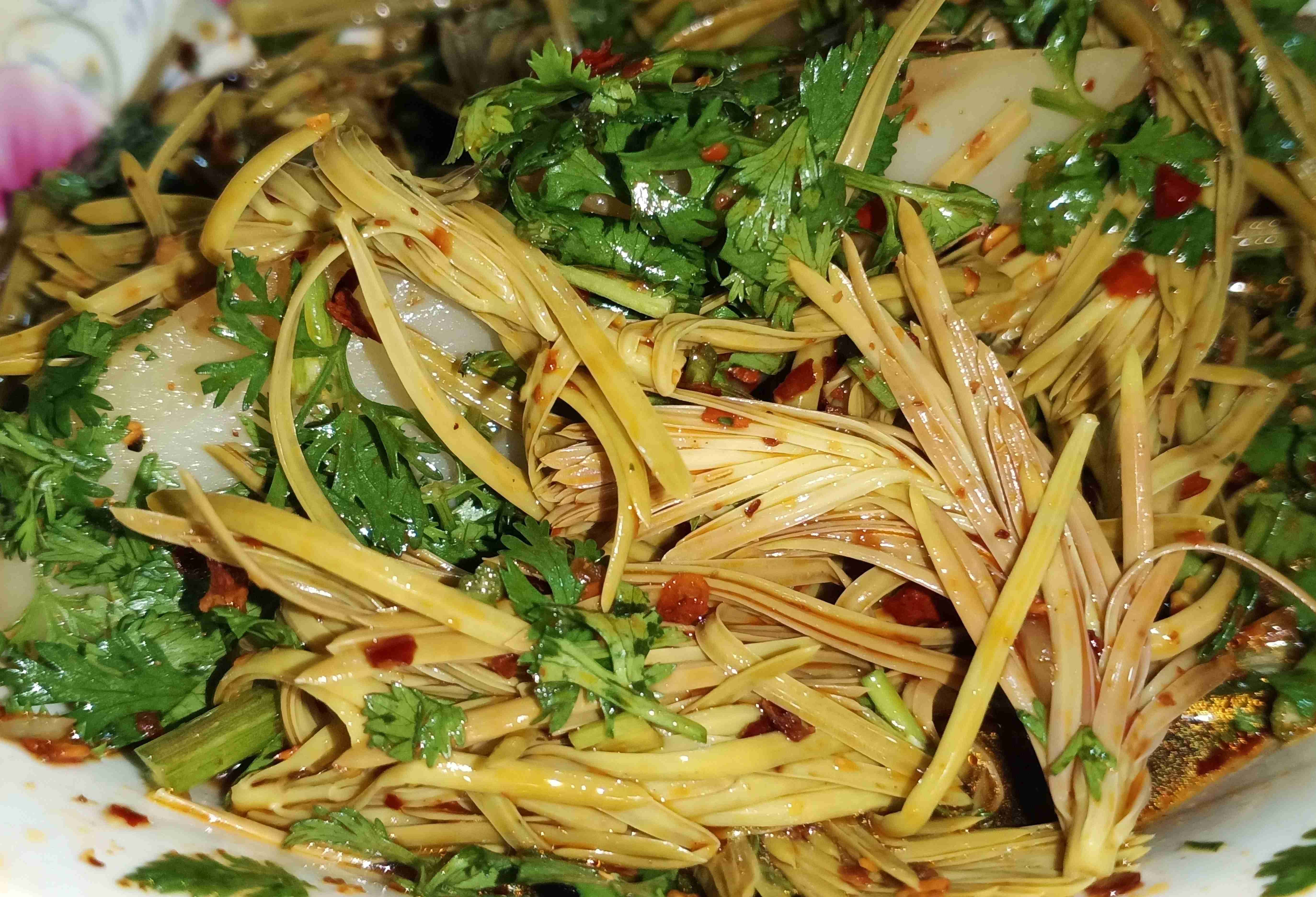 待松尖完全泡凉,便进入凉拌环节。取山顶采摘的野生杨梅熬制的杨梅酱,用山泉水按比例调配,再加入芫荽、香葱、花椒油、食盐、辣椒等配料,放入漂凉的青松尖,再搭配山箐边野生的鱼腥草茎叶,充分拌匀,一道色泽鲜亮、香气扑鼻的凉拌沙松尖便大功告成。若想丰富口感,还可加入黄瓜、油粉等,既能提味增香,也能满足不同食客的喜好。黄的松尖、绿的芫荽、白的鱼腥草、红的辣椒,色香味俱全,一口下去,清爽解腻,味蕾瞬间被唤醒。