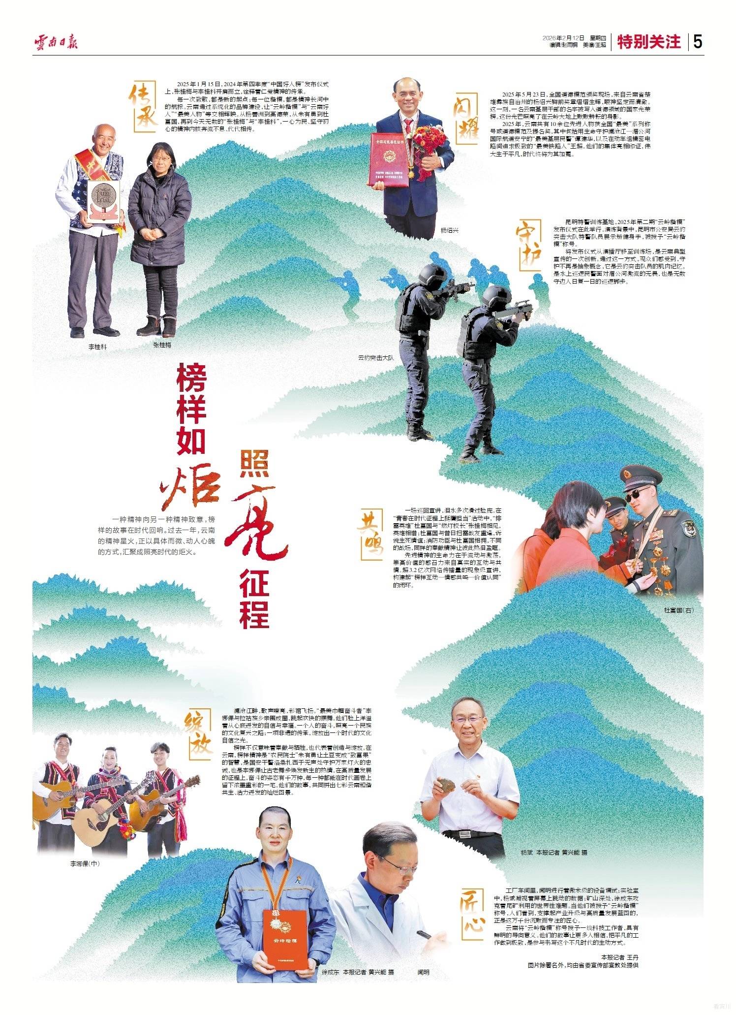 榜样不仅意味着奉献与牺牲,也代表着创造与绽放。在云南,榜样精神是“农民院士”朱有勇让土豆变成“致富果”的智慧,是国安干警洛桑扎西于无声处守护万家灯火的忠诚,也是李娜倮让古老舞步焕发新生的热情。在高质量发展的征程上,奋斗的姿态有千万种,每一种都能在时代画卷上留下浓墨重彩的一笔。他们的故事,共同拼出七彩云南和谐共生、活力迸发的灿烂图景。