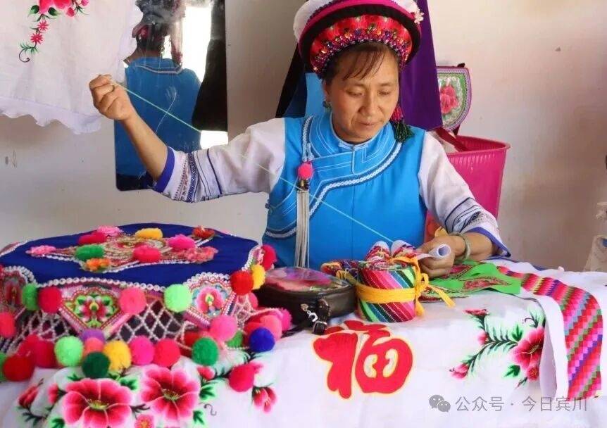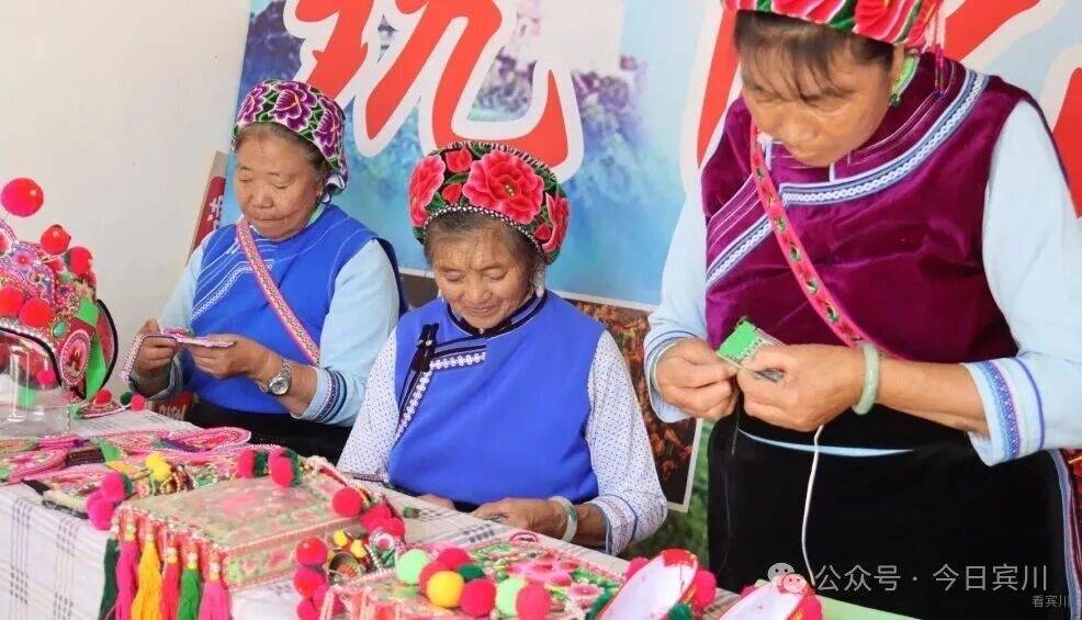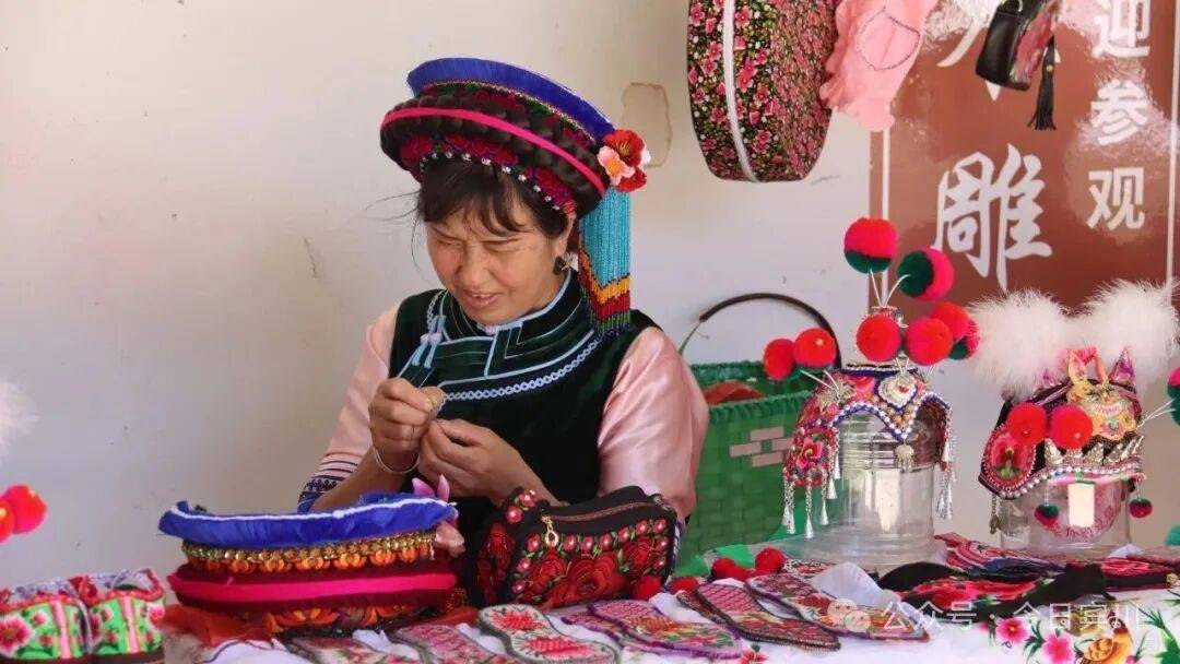 白族刺绣区:绣娘们坐在一起,针线在手中翻飞,展台上的虎头帽、绣花鞋、耍龙帽看得人挪不开眼。色彩艳、绣工细,每件都透着白族女性的巧思。“每次有活动我都来,就想让更多人知道咱们白族刺绣!” 县级非遗传承人张新业边绣边说,不少游客凑在旁边,忍不住上手摸一摸这细腻的针脚。