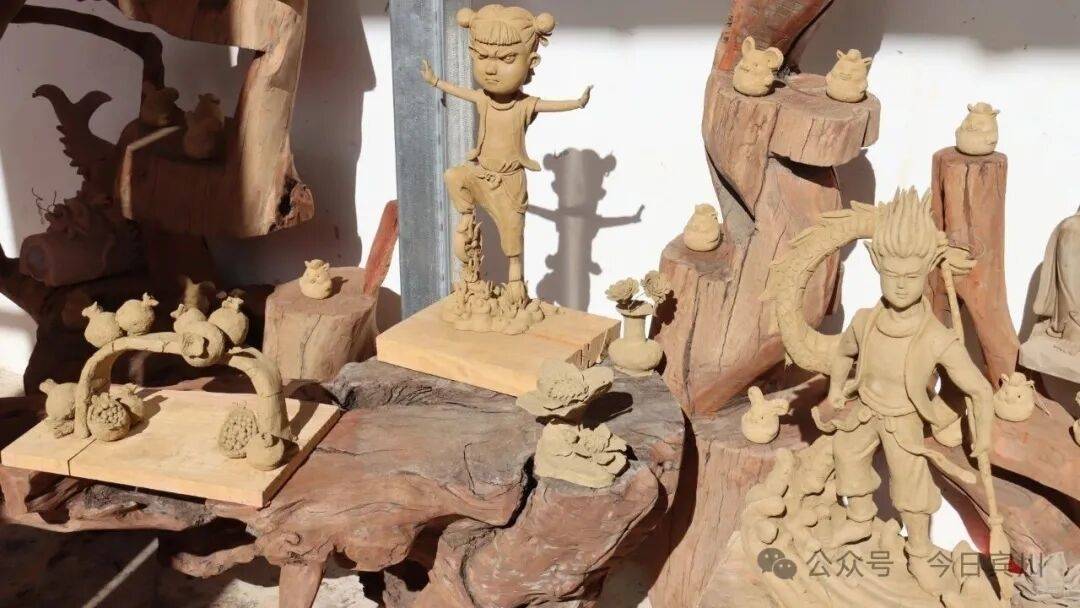 泥塑 & 木雕区:这边满是乡土趣意,泥塑有葡萄、石榴等宾川特色水果,还有哪吒、十二生肖等 “国潮” 形象,家长带着孩子揉陶泥,玩得满手是泥也不愿停;那边木雕展台,从民居构件到小巧摆件,纹理清晰、刻画精细,游客们凑上前细细打量,忍不住夸 “太精致了”。
