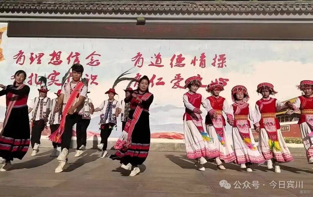 活动在唢呐《慢慢品》中拉开帷幕,唢呐高亢嘹亮的旋律,引来学生们的阵阵喝彩,眼神紧紧锁在舞台中央的唢呐上;身着白族服饰的演员们跳起白族霸王鞭,彩鞭随着“左右甩”“上下击”的动作“啪啪”作响;本土歌手带来的独唱《春风十里》;歌舞《祝福祖国》的演员们身着红色盛装,台下师生纷纷拍手跟唱;深耕葫芦笙演奏多年的宾川本土非遗传承人手持葫芦笙,奏响葫芦笙独奏《串烧》……当宾川帽子哥打歌队队员们头戴缀有绒球的傈僳族帽子、身着彩色麻布服饰,踏着“三步一跺脚”的欢快节奏走向观众,一曲《党的光辉照傈僳》将活动彻底推向高潮。