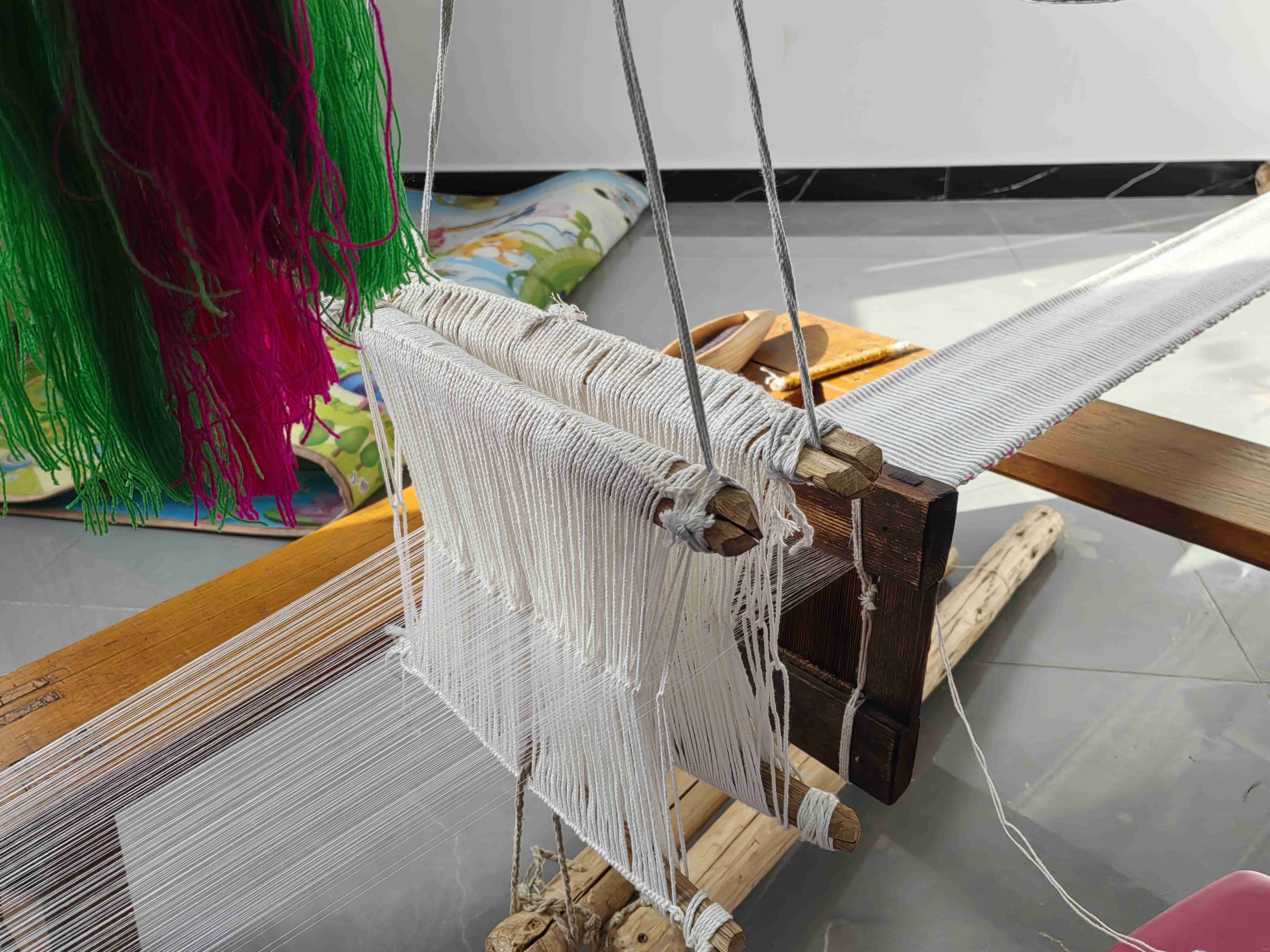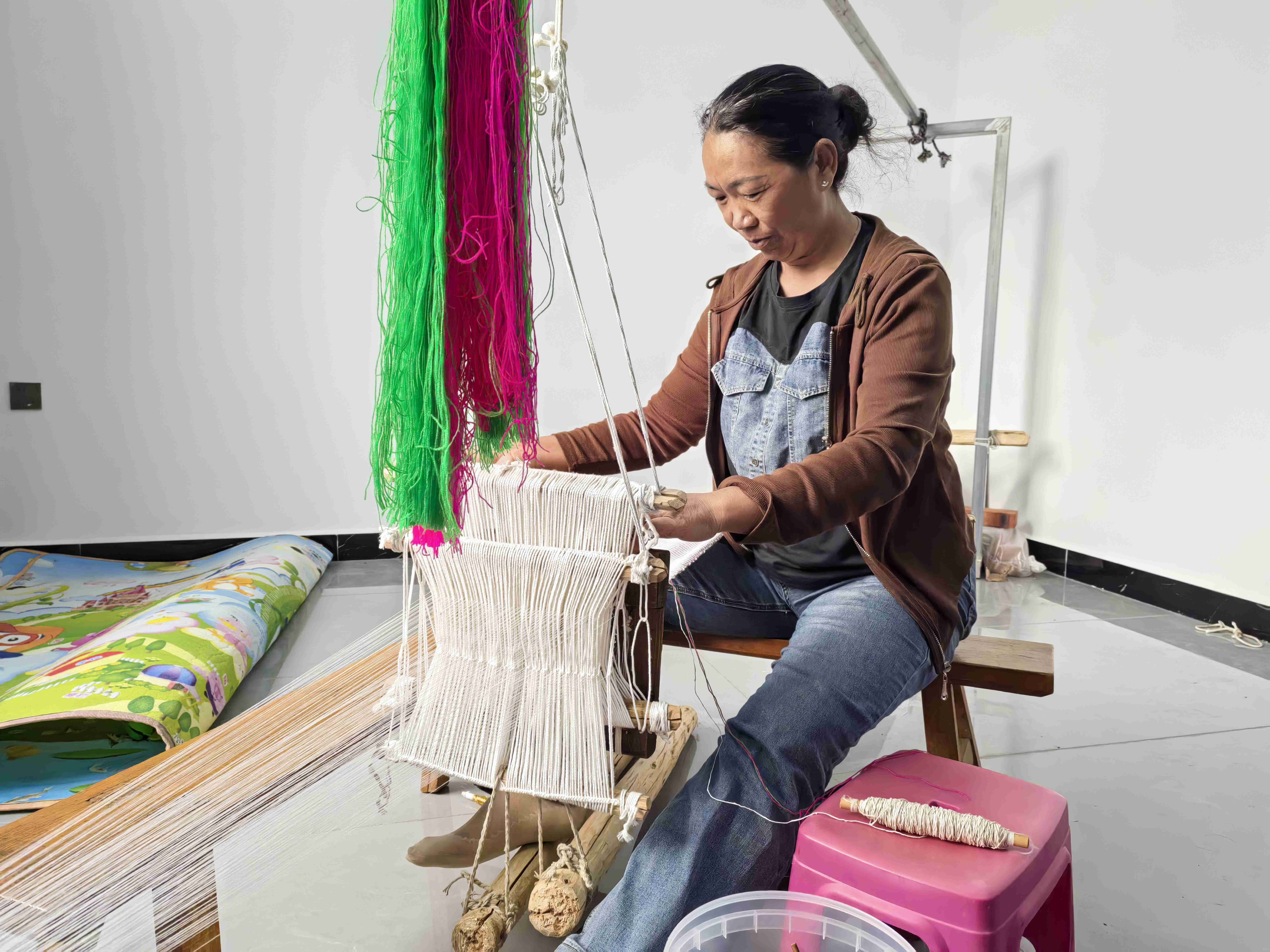 走进村民罗富荣家,最先让人惊叹的不是豪华的装修,客厅的吊顶、墙上的壁画丝毫不输城里的房子,而是三楼上角落那架古朴的火草布织布机。木架上,五彩的丝线与火草线交织,像把彩虹织进了经纬里。罗富荣的妻子子秀英正坐在织布机前,双手灵巧地穿梭引线,木梭子在她手中翻飞,发出“咔嗒、咔嗒”的声响,仿佛在诉说着这山村古老的故事。