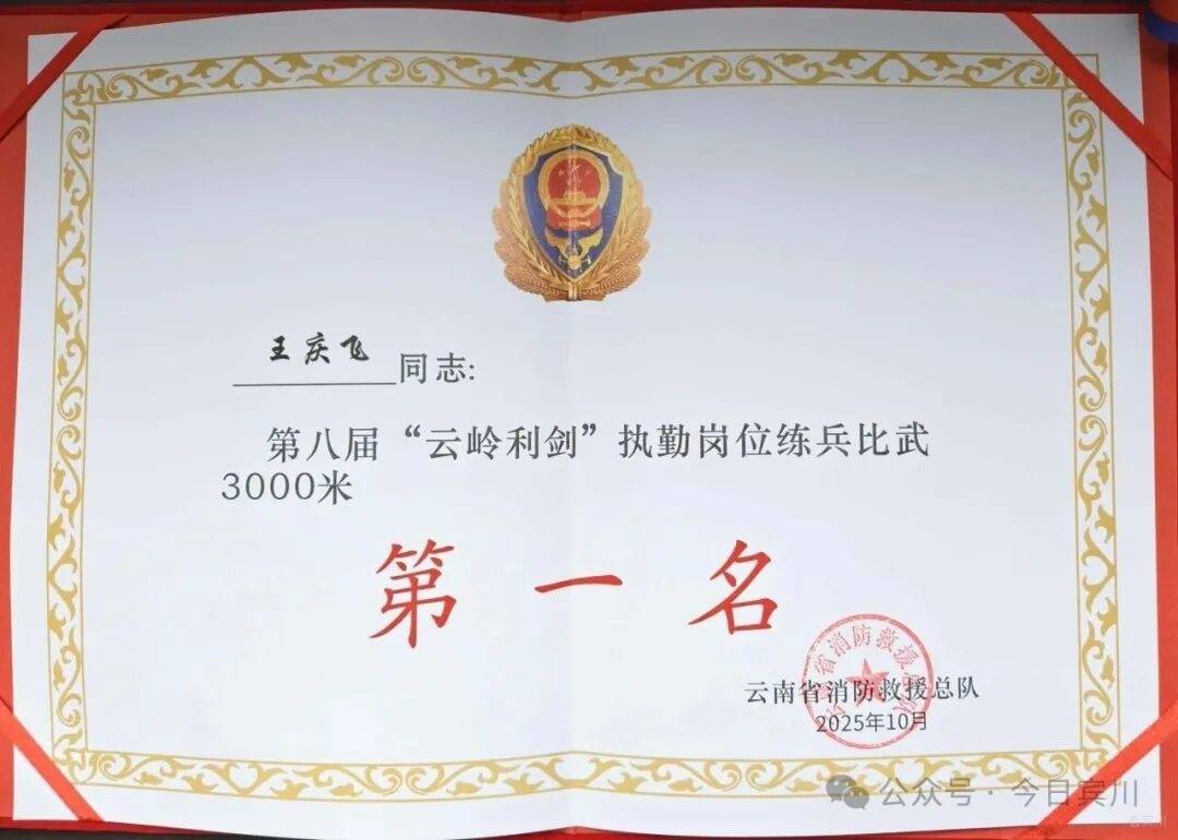 近日,云南省消防救援队伍第八届 “云岭利剑” 执勤岗位练兵比武竞赛落下帷幕。在备受关注的3000米跑项目中,宾川县消防救援大队王庆飞凭借扎实的体能基础和顽强的意志品质,一路领先,最终以优异成绩斩获全省第一名,为宾川县消防救援大队赢得了荣誉,也展现了基层消防救援人员的过硬素质。