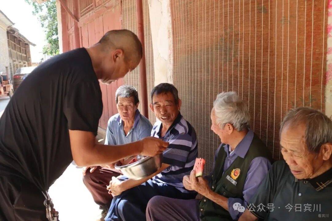 一面斑驳的方镜挂在老墙上,一把饱经岁月的理发椅吱呀作响,旁边摆着脸盆、水桶和几样简单的工具。几位老街坊早已坐在屋檐下的小板凳上,摇着蒲扇,聊着家常,笑声阵阵。见又一位老人蹒跚而来,邱德停下手中的推剪,笑着招呼:“您来啦,先坐会儿,吃片西瓜,解解暑!”