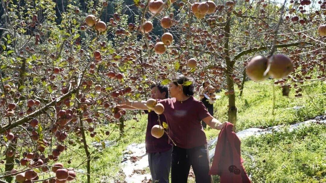 在碧鸡村海拔约2600米的山坡上,红彤彤的苹果挂满枝头,清晨的低温给果实披上了一层晶莹剔透的露珠。果农李红菊的18亩果园里,10亩已挂果的“红将军”和“红富士”已收获近八成,仍有约5000斤苹果等待采摘。
