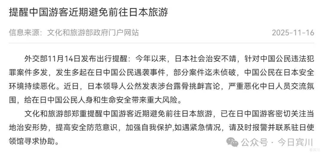 文化和旅游部郑重提醒中国游客近期避免前往日本旅游,已在日中国游客密切关注当地治安形势,提高安全防范意识,加强自我保护,如遇紧急情况,请及时报警并联系驻日使领馆寻求协助。