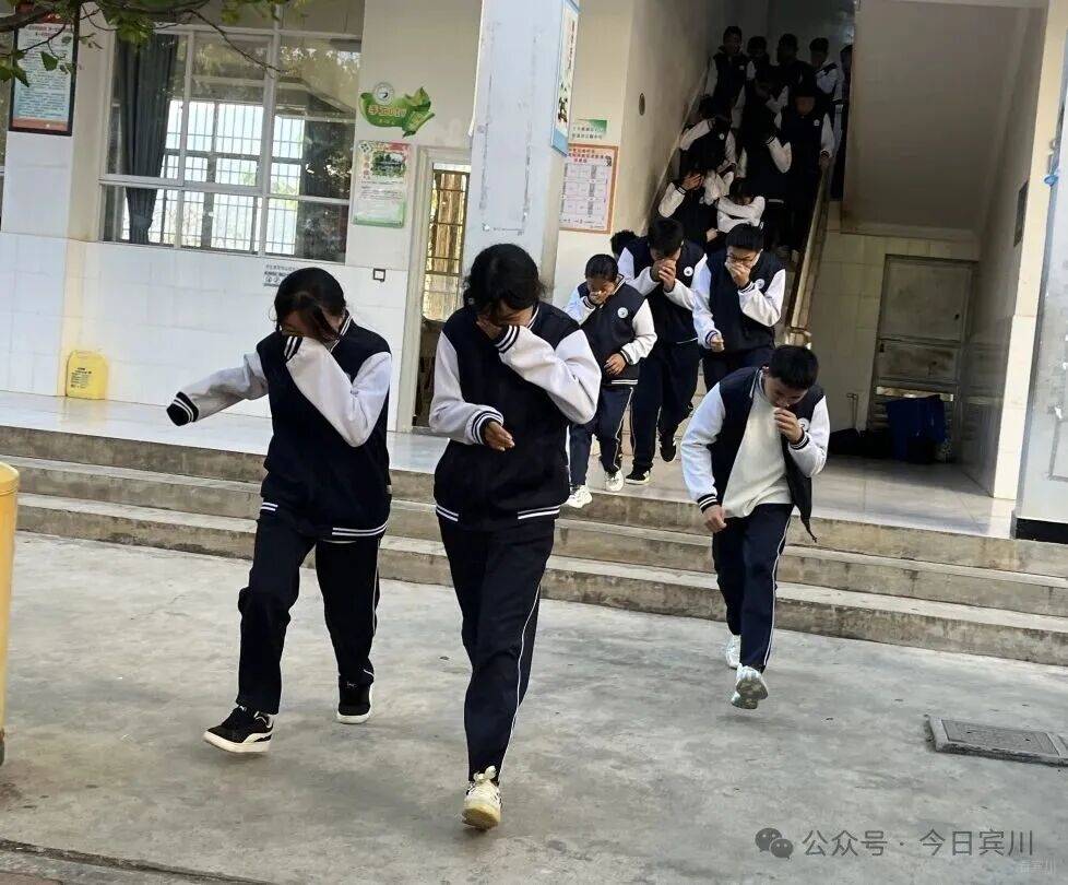 随着消防警报响起,消防应急演练正式启动。全体学生在老师指引下,用湿毛巾捂住口鼻、弯腰低姿,沿指定路线有序撤离,仅用1分33秒便全部安全抵达操场集结区域。各班清点人数并完成上报。演练结束后,学校教师还现场演示灭火器“提、拔、握、压”操作步骤,帮助师生掌握基本灭火技能。